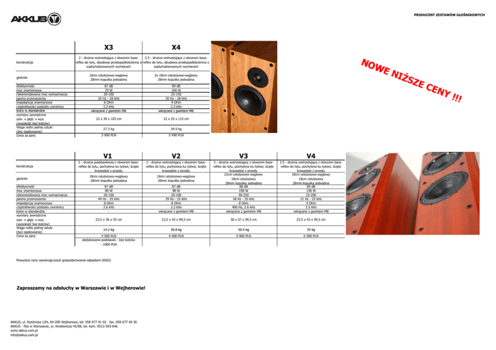 PRODUCENT ZESTAWÓW GŁOŚNIKOWYCH X3 konstrukcja głośniki efektywność moc znamionowa rekomendowana moc wzmacniacza pasmo przenoszenia impedancja znamionowa częstotliwości podziału zwrotnicy kolce w standardzie wymiary zewnętrzne szer. x głęb. x wys. (wysokość bez kolców) Waga netto jednej sztuki (bez opakowania) Cena za parę konstrukcja głośniki efektywność moc znamionowa rekomendowana moc wzmacniacza pasmo przenoszenia impedancja znamionowa częstotliwości podziału zwrotnicy kolce w standardzie wymiary zewnętrzne szer. x głęb. x wys. (wysokość bez kolców) Waga netto jednej sztuki (bez opakowania) Cena za parę X4 2 - droŜna wolnostojąca z otworem bass2.5 - droŜna wolnostojąca z otworem bassreflex do tyłu, obudowa prostopadłościenna o reflex do tyłu, obudowa prostopadłościenna o zoptymalizowanych wymiarach zoptymalizowanych wymiarach 18cm celulozowo-węglowy 28mm kopułka jedwabna 2x 18cm celulozowo-węglowy 28mm kopułka jedwabna 87 dB 70 W 20-100 35 Hz - 28 kHz 8 Ohm 2.3 kHz wkręcane z gwintem M8 89 dB 100 W 25-150 30 Hz - 28 kHz 4 Ohm 2.3 kHz wkręcane z gwintem M8 22 x 30 x 103 cm 22 x 35 x 115 cm 27.3 kg 34.9 kg 3 990 PLN 5 490 PLN NO WE NIś SZE C V1 V2 V3 V4 2 - droŜna podstawkowa z otworem bassreflex do tyłu, pochylona ku tyłowi, ścięte krawędzie z przodu 2 - droŜna wolnostojąca z otworem bassreflex do tyłu, pochylona ku tyłowi, ścięte krawędzie z przodu 18cm celulozowo-węglowy 28mm kopułka jedwabna 18cm celulozowo-węglowy 28mm kopułka jedwabna 87 dB 90 W 20-100 44 Hz - 25 kHz 8 Ohm 2.6 kHz - 87 dB 90 W 20-100 39 Hz - 25 kHz 8 Ohm 2.2 kHz wkręcane z gwintem M8 3 - droŜna wolnostojąca z otworem bassreflex do tyłu, pochylona ku tyłowi, ścięte krawędzie z przodu 22cm celulozowo-węglowy 18cm celulozowy 28mm kopułka jedwabna 88 dB 150 W 40-250 28 Hz - 25 kHz 8 Ohm 400 Hz, 2.6 kHz wkręcane z gwintem M8 2.5 - droŜna wolnostojąca z otworem bassreflex do tyłu, pochylona ku tyłowi, ścięte krawędzie z przodu 18cm celulozowo-węglowy 18cm celulozowy 28mm kopułka jedwabna 89 dB 130 W 25-200 31 Hz - 25 kHz 4 Ohm 2.5 kHz wkręcane z gwintem M8 23,5 x 36 x 35 cm 23,5 x 43 x 99,5 cm 30 x 57 x 99,5 cm 23,5 x 43 x 99,5 cm 14.2 kg 30.8 kg 50.4 kg 35 kg 4 500 PLN dedykowane podstawki - bez kolców - 1000 PLN 4 900 PLN 9 900 PLN 6 900 PLN PowyŜsze ceny zawierają koszt gospodarowania odpadami (KGO) Zapraszamy na odsłuchy w Warszawie i w Wejherowie! AKKUS, ul. Rzeźnicka 12H, 84-200 Wejherowo, tel. 058 677 91 92 fax. 058 677 40 36 AKKUS - filia w Warszawie, ul. Anielewicza 45/88, tel. kom. 0513-393-646 www.akkus.com.pl [email protected] ENY !!! PRODUCENT ZESTAWÓW GŁOŚNIKOWYCH Standardowo wszystkie modele dostępne są w okleinach: czereśnia palisander klon ptasie oczko wenge Bez dopłat na zamówienie dostępne są równieŜ: brzoza fińska, padouk Za dopłatą moŜliwość wyboru dowolnej okleiny. AKKUS, ul. Rzeźnicka 12H, 84-200 Wejherowo, tel. 058 677 91 92 fax. 058 677 40 36 AKKUS - filia w Warszawie, ul. Anielewicza 45/88, tel. kom. 0513-393-646 www.akkus.com.pl [email protected]
