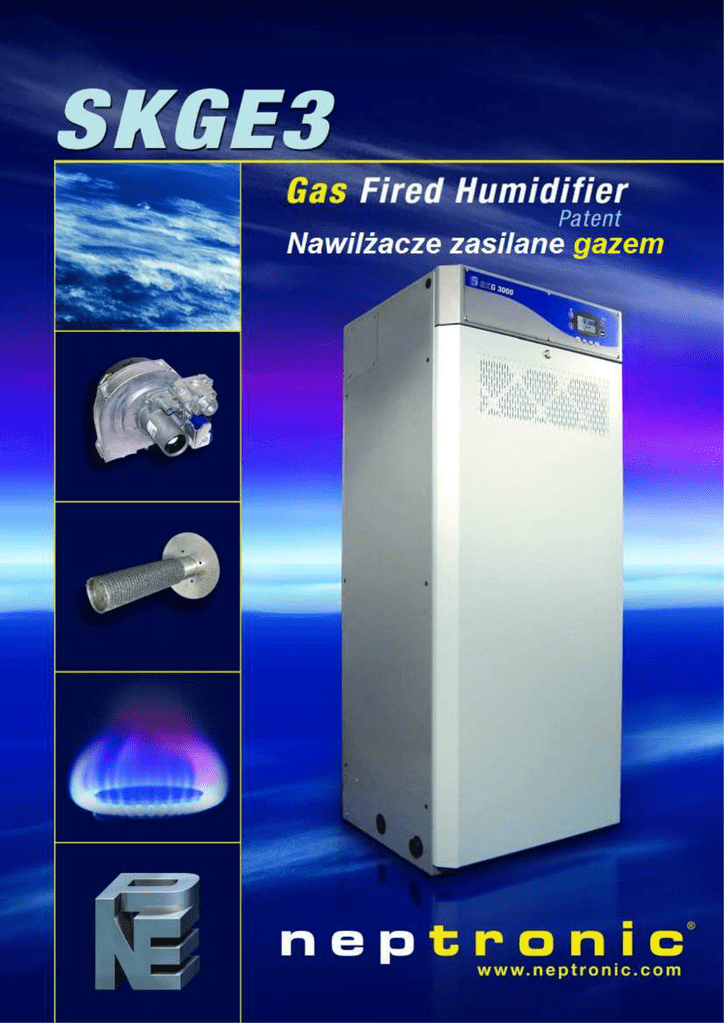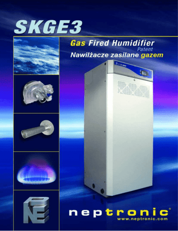 Zaawansowanie technologiczne SKGE3 wykorzystuje najbardziej zaawansowane dostępne na rynku technologie gazowe zapewniające stałe, pełne i efektywne spalanie. Typoszereg nawilżaczy serii SKGE3 zasilanych gazem (ziemnym albo propanem) obejmuje urządzenia o wydajnościach od 50 kg/h do 400 kg/h. Zakres wydajności SKGE3: od 4.5 kg/h do maksymalnej wydajności nawilżacza, w zależności od sygnału sterującego : 0-10vdc, 2-10vcd lub 4-20mA . Z efektywnościa spalania 83% HHV (91% LHV), SKGE3 jest jednym z najbardziej efektywnych urządzeń w branży . Wyjątkowa niezawodność Niezawodność nawilżaczy SKGE3 jest jedną z cech wyróżniających je wśród urządzeń konkurencji. W urządzeniu zastosowane są Atrakcyjny i innowacyjny wygląd SKGE3: wymagają one o 1/3 mniej przestrzeni użytkowej od konkurencyjnych urządzeń o równoważnych wydajnościach. wyłącznie materiały, które mają odpowiednią wytrzymałość w trudnych warunkach: konstrukcja ze stali nierdzewnej 316, teflonowa osłona czujnika poziomu wody, silikonowe węże (lub Nawilżacze SKGE3 można zasilać wodą wodociągową, zmiękczoną oraz zdemineralizowaną. Wykorzystują one również własny opatentowany proces automatycznego usuwania kamienia z powierzchni wymiennika. równoważne) i malowana proszkowo stalowa obudowa. Wybór elementów elektromechanicznych i elektronicznych opiera się na wieloletnim doświadczeniu i licznych testach. Przed wysyłką z fabryki, wszystkie jednostki SKGE3 poddawane są Podczas czynności serwisowych zbiornik może być wyjęty, oczyszczony i ponownie zainstalowany w ciągu 5 minut, bez potrzeby stosowania specjalnych narzędzi ani drogich części zamiennych. SKGE3 wykorzystuje opatentowany system kontroli poziomu wody, pozwala on na energetycznie efektywne zarządzanie gotującą się wodą oraz ilością pary. SKGE3 maja programowalny automatyczny cykl spustu wody i cykle serwisu. Temperatura wody spustowej jest obniżana poprzez system schładzania i nie przekracza 60ºC. rygorystycznym testom, przy pełnej wydajności. Niższe koszty eksploatacji SKGE3 jest najlepszym wyborem, jeśli chcesz znaczenie zmniejszyć koszty energii w porównaniu do Wszystkie elementy, które mają styczność z gazem ziemnym, spalinami lub parą wykonane są ze stali nierdzewnej 316. Komora spalania i wymiennik ciepła również wykonane są ze stali nierdzewnej 316. nawilżaczy zasilanych elektrycznie. Oszczędność energii możesz obliczyć na stronie internetowej: www.neptronic.com/humcalculator WYŚWIETLACZ SKGE3 Łatwość komunikacji Zdalne sterowanie nawilżaczem SKGE3 jest możliwe poprzez BACnet i umożliwia zmianę parametrów nastawy, odczyt parametrów pracy oraz uzyskanie informacji o stanie pracy i awarii nawilżacza. Nowoczesny wygląd i zaawansowane technologie Wykonanie SKGE3 z wysokiej jakości materiałów w powiązaniu z zaawansowanymi technologicznie komponentami gazowymi, zapewnia bezawaryjną pracę. Szeroki zakres sterowania wydajnością powoduje, że nawilżacze SKGE3 mogą utrzymywać zadaną wilgotność z dużą dokładnością. Ze względu na swoją konstrukcję, SKGE3 wymaga 3 razy mniej miejsca niż urządzenia konkurencji. SKGE3 wykorzystuje innowacyjny proces odkamieniania (patent), co zapobiega osadzaniu się kamienia na wymienniku ciepła. Łatwy serwis Rozłączyć klamrę zespołu mocującego Odłącz przyłącze spustu wody Przesuń zbiornik na dół Wyjmij zbiornik w celu oczyszczenia go z kamienia Zasada działania SKGE3 Po otrzymaniu sygnału startu, wentylator komory spalania wytwarza podciśnienie poprzez otwór zaworu zlokalizowanego na wlocie powietrza. Zawór gazowy się otwiera i mieszanina gaz/powietrze przepływa poprzez zapalnik i następuje zapłon. Ciepło spalania jest przekazywane do wody poprzez wymiennik ciepła, który zanurzony jest w cylindrze z wodą i następuje produkcja pary. Spaliny są odprowadzane poprzez system wentylacji na zewnątrz. Palnik może być regulowany w zależności od zapotrzebowania. SKGE3 Rysunek poglądowy Nawilżacz SKGE3 zawiera zbiornik ze stali nierdzewnej z systemem automatycznego napełniania wodą. Jest on łatwy do demontażu co zapewnia prosty dostęp do wymiennika ciepła w celu jego czyszczenia. Okresowy serwis urządzenia jest prosty i może być wykonany w ciągu kilku minut. Pełen dostęp do komory spalania i wymiennika ciepła jest zapewniony, gdy odłączymy spust wody ze zbiornika. Steam outlet Back door access Vent connection (Either side) Sekcja mechaniczna i elektryczna jest zabezpieczona szerokimi drzwiami umożliwiającymi doskonały dostęp i łatwość przeprowadzenia serwisu wszystkich elementów. Electrical power connection 316SS Combustion chamber and heat exchanger SKGE3 (widok z góry) Evaporation chamber lifting mechanism Podłączenie gazu Podłączenie wody Spust wody Zawór wody zasilającej oraz pompa spustowa 316SS Evaporation chamber (showed in "DOWN" position) Drain connection SKGE3 w obudowie zewnętrznej Modele SKGE3 do montażu zewnętrznego posiadają obudowy zewnętrzne, pozwalające na montaż urządzeń na dachu lub na ziemi. Obudowa zewnętrzna zapewnia całkowitą ochronę wewnętrznych elementów nawilżacza, w każdym klimacie. • Łatwy dostęp w kilka minut: Obudowa zewnętrzna wyposażona jest w drzwi z uszczelką, aby zapewnić szczelność wszystkich elementów zewnętrznych i aby zapewnić łatwy dostęp do czynności serwisowych z przodu, z tyłu i od góry urządzenia. • Innowacyjna i odporna konstrukcja: Innowacyjna konstrukcja obudowy zewnętrznej zapewnia najmniejszą wymaganą przestrzeń użytkową w stosunku do produktów konkurencji. Wykonanie z wytrzymałej stali, pokrytej ochronną warstwą cynku i wykończenie farbą proszkowo-poliuretanową pozwala na najlepsze zabezpieczenie przed korozją i ochronę przed zarysowaniami. Spód ze stali nierdzewnej zapewnia jeszcze większą ochronę przez korozją. • Praca w każdym klimacie: obudo