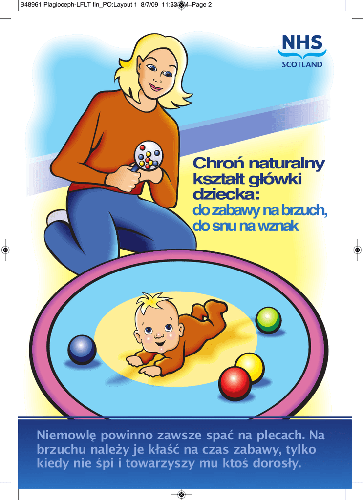 B48961 Plagioceph-LFLT fin_PO:Layout 1 8/7/09 11:33 PM Page 2 Chroń naturalny kształt główki dziecka: do zabawy na brzuch, do snu na wznak Niemowlę powinno zawsze spać na plecach. Na brzuchu należy je kłaść na czas zabawy, tylko kiedy nie śpi i towarzyszy mu ktoś dorosły. B48961 Plagioceph-LFLT fin_PO:Layout 1 8/7/09 11:33 PM Page 3 Chroń naturalny kształt główki dziecka Lekkie spłaszczenie główki dziecka z jednej strony jest czymś normalnym. U dzieci spędzających cały czas na plecach może stać się zauważalne (plagiocefalia). Stosowanie się do poniższych zaleceń pomoże temu zapobiec. Gdyby jednak doszło do widocznego spłaszczenia główki, należy pamiętać, że jest to problem kosmetyczny, który można skorygować przestrzegając poniższych wskazówek. Spłaszczona główka (plagiocefalia) to problem kosmetyczny, który nie wpływa na mózg dziecka. Pozwalaj dziecku spędzać dużo czasu na Twoich kolanach. Baw się z nim lub czytaj mu, aby nie zaczęło się nudzić. Staraj się trzymać dziecko w różny sposób, albo noś je w chuście lub zakładanym z przodu nosidełku. Gdy tylko niemowlę zacznie wykazywać zdolność kontrolowania główki, pomóż mu bawić się na brzuszku, kiedy nie śpi i znajduje się pod opieką dorosłego. Baw się w chowanego lub wybierz stymulujące zabawki, które przyciągną uwagę leżącego na brzuchu niemowlęcia. B48961 Plagioceph-LFLT fin_PO:Layout 1 8/7/09 11:33 PM Page 4 Do zabawy na brzuch, do snu na wznak Niemowlęta powinny podróżować samochodem wyłącznie w foteliku. Należy ograniczyć czas spędzony w sprężystym foteliku, gdyż to także powoduje nacisk na tylnią część główki dziecka. Lampkę w pokoju dziecięcym zamontuj ze strony, w którą maluch rzadziej spogląda. Jeśli leżąc w łóżeczku, dziecko zawsze zwraca główkę w jednym kierunku, zawieś z drugiej strony mobil lub obrazek, które przyciągną jego uwagę. • Zawsze nadzoruj dziecko podczas zabawy na brzuchu. • Nigdy nie pozwól, by zasnęło leżąc na brzuchu. • Dzieci powinny zawsze spać na plecach. • Postaraj się zmieniać pozycję dziecka, co noc kładąc je do łóżeczka główką w przeciwnym kierunku. B48961 Plagioceph-LFLT fin_PO:Layout 1 8/7/09 11:33 PM Page 1 Jeśli niepokoi Cię kształt główki dziecka lub jeśli ma ono trudności z jej odwracaniem w którąkolwiek stronę, skonsultuj się z pielęgniarką środowiskową lub lekarzem rodzinnym. Więcej informacji na temat plagiocefalii można znaleźć na stronie http://www.scotland.gov.uk/Publications/2007/03/19103122 © Crown copyright 2007 Dokument jest dostępny na stronie SHOW Dokument jest także dostępny na stronie rządu Szkocji: www.scotland.gov.uk RR Donnelley B48961 03/07 (Polish) Stwierdza się zgodność niniejszego egzemplarza z oryginałem. w w w . s c o t l a n d . g o v . u k B48961 Plagioceph-LFLT fin_PO:Layout 2 8/7/09 11:30 PM Page 1 INFORMATOR DLA RODZICÓW O PLAGIOCEFALII Co to jest plagiocefalia ułożeniowa? Plagiocefalia ułożeniowa/brachycefalia występuje, gdy początkowo prawidłowo zaokrąglona czaszka staje się spłaszczona w wyniku odgniecenia kości. Powoduje, że główka dziecka staje się bardziej płaska z tyłu lub z boku. Co ją wywołuje? Plagiocefalię może spowodować ułożenie dziecka w macicy, jednak częściej występuje po jego narodzinach na skutek tego, w jakich pozycjach niemowlę leży. Najczęstszą przyczyną plagiocefalii poporodowej jest to, jak dużo czasu dziecko spędza na plecach oraz w fotelikach samochodowych w pierwszych miesiącach życia, gdy kości czaszki są miękkie i łatwo się odkształcają pod naciskiem powierzchni, na której spoczywają. Plagiocefalia ułożeniowa stała się bardziej powszechna od czasu wprowadzenia kampanii „Back to Sleep” (do snu na wznak), która zalecała rodzicom kłaść niemowlęta na plecach do snu, aby zmniejszyć ryzyko wystąpienia zespołu nagłego zgonu niemowląt (śmierci łóżeczkowej). Mimo to dzieci należy zawsze układać do snu na wznak, ponieważ korzyści ze zmniejszenia ryzyka śmierci łóżeczkowej znacznie przewyższają ryzyko powstania niegroźnego odkształcenia. Jakie są objawy? Oprócz spłaszczonej tylnej lub bocznej części główki dziecka nie występują żadne inne objawy. Problem nie wpływa na mózg dziecka i jest kosmetyczny. Ważne jest, aby poradzić się lekarza rodzinnego lub pielęgniarki środowiskowej, jeśli dziecko ma trudności z odkręcaniem główki na którąkolwiek stronę lub jeśli sztywnieją mu mięśnie szyi. Jak można uniknąć plagiocefalii/brachycefalii? • • • • • Aby zredukować ryzyko śmierci łóżeczkowej, dzieci powinny zawsze spać na wznak. Jednak kiedy dziecko nie śpi, należy je układać do zabawy w różnych pozycjach, na przykład na boku lub na brzuchu. Pozwala to uniknąć ciągłego nacisku na tył główki i sprzyja rozwojowi jej naturalnego kształtu. Dzieci lubią bawić się w różnych pozycjach i ćwiczyć podnoszenie głowy, gdy leżą na brzuchu. Zawsze doglądaj dziecka, gdy bawi się, leżąc na brzuchu. Nigdy nie pozwól, aby zasnęło w tej pozycji. Dobrze jest zmieniać ułożenie główki śpiącego dziecka, delikatnie ją przekręcając, tak aby dziecko nie leżało zawsze na tej samej części czaszki. Niemowlęta powinny podróżować samochodem wyłącznie w foteliku i nie powinny spędzać dużo czasu w sprężystych fotelikach, które również powodują nacisk na tył główki. W ciągu dnia należy często zmieniać ułożenie niemowlęcia, aby uniknąć ciągłego nacisku na tył główki. B48961 Plagioceph-LFLT fin_PO:Layout 2 8/7/09 11:30 PM Page 2 Co zrobić, jeśli główka dziecka wygląda na płaską? W większości przypadków plagiocefalii ułożeniowej/brachiocefalii można uniknąć, stosując się do przedstawionych zaleceń. (To, że główka dziecka jest nieco bardziej płaska z tyłu lub z boku jest normalne). Jeśli martwi