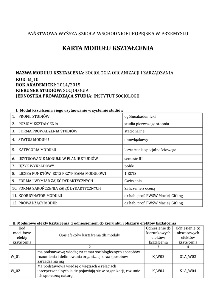 PAŃSTWOWA WYŻSZA SZKOŁA WSCHODNIOEUROPEJSKA W PRZEMYŚLU KARTA MODUŁU KSZTAŁCENIA NAZWA MODUŁU KSZTAŁCENIA: SOCJOLOGIA ORGANIZACJI I ZARZĄDZANIA KOD: M_10 ROK AKADEMICKI: 2014/2015 KIERUNEK STUDIÓW: SOCJOLOGIA JEDNOSTKA PROWADZĄCA STUDIA: INSTYTUT SOCJOLOGII I. Moduł kształcenia i jego usytuowanie w systemie studiów 1. PROFIL STUDIÓW ogólnoakademicki 2. POZIOM KSZTAŁCENIA studia pierwszego stopnia 3. FORMA PROWADZENIA STUDIÓW stacjonarne 4. STATUS MODUŁU obowiązkowy 5. KATEGORIA MODUŁU kształcenia specjalnościowego 6. USYTUOWANIE MODUŁU W PLANIE STUDIÓW semestr III 7. JĘZYK WYKŁADOWY polski 8. LICZBA PUNKTÓW ECTS PRZYPISANA MODUŁOWI 1 ECTS 9. FORMA I WYMIAR ZAJĘĆ DYDAKTYCZNYCH Ćwiczenia 10. FORMA ZAKOŃCZENIA ZAJĘĆ DYDAKTYCZNYCH Zaliczenie z oceną 11. KOORDYNATOR MODUŁU dr hab. prof. PWSW Maciej Gitling 12. PROWADZĄCY MODUŁ dr hab. prof. PWSW Maciej Gitling II. Modułowe efekty kształcenia z odniesieniem do kierunku i obszaru efektów kształcenia Kod Odniesienie do Odniesienie do modułowe kierunkowych obszarowych Opis efektów kształcenia dla modułu efekty efektów efektów kształcenia kształcenia kształcenia 1 2 3 4 ma podstawową wiedzę na temat socjologicznych sposobów W_01 rozumienia i definiowania organizacji oraz sposobów K_W02 S1A_W02 zarządzania nią Ma podstawową wiedzę o więziach o relacjach W_02 interpersonalnych jakie pojawiają się w organizacji, rozumie K_W04 S1A_W04 ich społeczną naturę Korzystając z wiedzy z zakresu socjologicznych teorii zarządzania i kształtowania organizacji zna ogólne zasady tworzenia różnorodnych form indywidualnej i kolektywnej przedsiębiorczości Potrafi odpowiednio interpretować zagadnienia związane z funkcjonowaniem i rozwojem organizacji Potrafi w oparciu o swoją wiedzę dokonywać prognoz rozwoju, zmian i funkcjonowania konkretnych organizacji Wykorzystuje swoją wiedzę do formułowania adekwatnych sądów dotyczących relacji międzyludzkich w organizacjach i zarządzaniem tymi relacjami prawidłowo identyfikuje i rozstrzyga dylematy zawodowe oraz potrafi rozwiązać dylematy etyczne związane z zarządzaniem zasobami ludzkimi Na podstawie swojej wiedzy potrafi działać w sposób przedsiębiorczy tworząc lub zarządzając organizacją W_03 U_01 U_02 U_03 K_01 K_02 K_W11 S1A_W11 K_U01 S1A_U01 K_U04 S1A_U04 K_U06 S1A_U06 K_K04 S1A_K04 K_K07 S1A_K07 III. Treści kształcenia – oddzielnie dla każdej formy zajęć dydaktycznych (W – wykład; C - ćwiczenia; K – konwersatorium; L - laboratorium; PR – projekt, PKZ – praktyka zawodowa; WT – Warsztat) Kod Szczegółowy opis treści realizowanych w ramach zajęć form zajęć wg form zajęć dydaktycznych Liczba godzin dydaktyczny ch C1 C2 Organizacja i socjologiczne metody jej badania. Geneza socjologii organizacji i zarządzania. Organizacja i jej atrybuty. Społeczeństwo i budowanie ładu organizacyjnego. Praca ludzka i jej znaczenie. 1 1 Budowanie więź organizacyjnych i ludzkich. C3 C4 C5 C6 C7 C8 C9 C10 C11 Harmonia i konflikt w systemie społecznym. Sprzeczności w społeczeństwie poprzemysłowym. Społeczeństwo i organizacja w ujęciu funkcjonalnym. Człowiek i system w socjologii organizacji. Zachowania człowieka ,,społecznego”. Zakład pracy jako system społeczny. Współczesne szkoły i podejścia w socjologii organizacji.. Problemy badawcze organizacji przyszłości. Orientacja strukturalno-teczniczna w socjologii organizacji. Kształtowanie grup i zespołów w organizacji. Przekształcanie grupy w zespoły. Zespoły sieciowe i ich charakter. Motywacyjne aspekty zachowań organizacyjnych. Satysfakcja z pracy. Teorie odnoszące się do motywacji. Strukturalne aspekty sprawowania władzy. Style kierowania. Biurokracja jako zjawisko społeczne. Kulturowe wyznaczniki funkcjonowania organizacji. Poziom kultury organizacyjnej. Typologia kultur organizacyjnych. Współpraca i konflikt w organizacji. Dylematy negocjacyjne. Strategie radzenia sobie z konfliktem. Taktyki negocjacyjne. Zachowania nieetyczne w organizacji. Zarządzanie zachowaniami nieetycznymi. Sposoby i radzenie sobie z dylematami nieetycznymi we współczesnych organizacjach. 1 1 1 1 1 1 1 1 1 C12 C13 C14 C15 Psychospołeczne aspekty zmian organizacyjnych. Stres i opór wobec zmiany. Istota zmian organizacyjnych. Miękkie i twarde podejście do współczesnego zarządzania. Istota i elementy miękkiego i twardego zarządzania. Proces decyzyjny i narzędzia go wspomagające. Behawioralne aspekty decyzji. Współuczestnictwo w podejmowaniu decyzji. Empowerment. Zarządzanie jakością. Normy ISO serii 9000. Koncepcja TQM. Certyfikaty jakości i audyt. RAZEM IV. Literatura obowiązująca do zaliczenia modułu Literatura podstawowa: 1. Moczydłowska J., Zachowania organizacyjne w nowoczesnym przedsiębiorstwie, 2. Wyd. ,,Śląsk”, Katowice 2006 3. Masłyk- Musiał E., Społeczeństwo i organizacje. Socjologia organizacji i zarządzania, 4. Wyd. UMCS, Lublin 1996 5. Bielski M., Organizacje, istota, struktury, procesy, Wyd. UŁ, Łódź 1996 6. Żukowski P., Podstawy organizacji pracy i kierowania, Wyd. AR w Szczecinie, Szczecin 1998 7. Januszek H. Sikora J., Socjologia pracy, Wyd. AE w poznaniu, Poznań 1996 8. Błaszczyk W., Metody organizacji i zarządzania. Kształtowanie relacji organizacyjnych. PWN, Warszawa 2006 9. Wasiuk A., (red.) Nowoczesne podeście do zarządzania organizacjami, Wyd. ,,Difin”, Warszawa 2009 10. Bugdol M., Wartości organizacyjne. Szkice z teorii organizacji i zarządzania, Wyd. UJ, Kraków 2006 11. Kożuch B., Nauka o Organizacjach, Wyd. ,, CeDeWu.Pl. ,Warszawa 2009 12. Kuc B.R. Moczydłowska J.M., Zachowania organizacyjne, Wyd.,,Difin”, Warszawa 2009 13. Webber R.A., Zasady zarządzania organizacjami, PWE, Warszawa 1996 14. Sikorski Cz., Zachowania ludzi w organizacji, PWN, Warszawa 2002 Literatura uzupełniająca: 1. Martyniak Z., Metody organizowania procesów pracy, PWE, Warszawa 1996 2. Chojnacki WŁ. Balasiewi