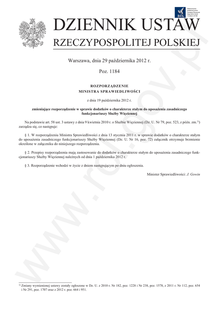 Elektronicznie podpisany przez Grzegorz Paczowski Data: 2012.10.29 15:38:22 +01'00' DZIENNIK USTAW v.p l RZECZYPOSPOLITEJ POLSKIEJ Warszawa, dnia 29 października 2012 r. Poz. 1184 ROZPORZĄDZENIE MINISTRA SPRAWIEDLIWOŚCI .go z dnia 19 października 2012 r. zmieniające rozporządzenie w sprawie dodatków o charakterze stałym do uposażenia zasadniczego funkcjonariuszy Służby Więziennej Na podstawie art. 58 ust. 3 ustawy z dnia 9 kwietnia 2010 r. o Służbie Więziennej (Dz. U. Nr 79, poz. 523, z późn. zm.1)) zarządza się, co następuje: § 1. W rozporządzeniu Ministra Sprawiedliwości z dnia 13 stycznia 2011 r. w sprawie dodatków o charakterze stałym do uposażenia zasadniczego funkcjonariuszy Służby Więziennej (Dz. U. Nr 16, poz. 72) załącznik otrzymuje brzmienie określone w załączniku do niniejszego rozporządzenia. w. rcl § 2. Przepisy rozporządzenia mają zastosowanie do dodatków o charakterze stałym do uposażenia zasadniczego funkcjonariuszy Służby Więziennej należnych od dnia 1 października 2012 r. ww § 3. Rozporządzenie wchodzi w życie z dniem następującym po dniu ogłoszenia. 1) Minister Sprawiedliwości: J. Gowin Zmiany wymienionej ustawy zostały ogłoszone w Dz. U. z 2010 r. Nr 182, poz. 1228 i Nr 238, poz. 1578, z 2011 r. Nr 112, poz. 654 i Nr 291, poz. 1707 oraz z 2012 r. poz. 664 i 951. Dziennik Ustaw –2– Poz. 1184 v.p l Załącznik do rozporządzenia Ministra Sprawiedliwości z dnia 19 października 2012 r. (poz. 1184) WYSOKOŚĆ DODATKU ZA STOPIEŃ Nazwa stopnia 1 generał 2 pułkownik 3 podpułkownik 4 major 5 kapitan 6 porucznik Stawka miesięczna w zł 1988 1777 1619 1514 1355 1303 .go Lp. podporucznik 1250 8 starszy chorąży 1166 9 chorąży 1123 10 młodszy chorąży 1092 11 starszy sierżant sztabowy 976 12 sierżant sztabowy 923 13 starszy sierżant 881 14 sierżant 839 15 plutonowy 817 16 starszy kapral 796 17 kapral 775 18 starszy szeregowy 638 19 szeregowy 617 ww w. rcl 7