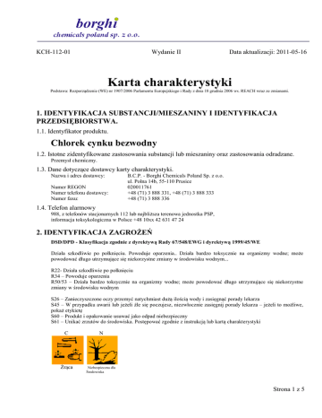 KCH-112-01 Wydanie II Data aktualizacji: 2011-05-16 Karta charakterystyki Podstawa: Rozporządzenie (WE) nr 1907/2006 Parlamentu Europejskiego i Rady z dnia 18 grudnia 2006 ws. REACH wraz ze zmianami. 1. IDENTYFIKACJA SUBSTANCJI/MIESZANINY I IDENTYFIKACJA PRZEDSIĘBIORSTWA. 1.1. Identyfikator produktu. Chlorek cynku bezwodny 1.2. Istotne zidentyfikowane zastosowania substancji lub mieszaniny oraz zastosowania odradzane. Przemysł chemiczny. 1.3. Dane dotyczące dostawcy karty charakterystyki. Nazwa i adres dostawcy: Numer REGON Numer telefonu dostawcy: Numer faxu: B.C.P. - Borghi Chemicals Poland Sp. z o.o. ul. Polna 14b, 55-110 Prusice 020011761 +48 (71) 3 888 331, +48 (71) 3 888 333 +48 (71) 3 888 336 1.4. Telefon alarmowy 988, z telefonów stacjonarnych 112 lub najbliższa terenowa jednostka PSP, informacja toksykologiczna w Polsce +48 10xx 42 631 47 24 2. IDENTYFIKACJA ZAGROŻEŃ DSD/DPD - Klasyfikacja zgodnie z dyrektywą Rady 67/548/EWG i dyrektywą 1999/45/WE Działa szkodliwie po połknięciu. Powoduje oparzenia.. Działa bardzo toksycznie na organizmy wodne; może powodować długo utrzymujące się niekorzystne zmiany w środowisku wodnym... R22- Działa szkodliwie po połknięciu R34 – Powoduje oparzenia R50/53 – Działa bardzo toksycznie na organizmy wodne; może powodować długo utrzymujące się niekorzystne zmiany w środowisku wodnym S26 – Zanieczyszczone oczy przemyć natychmiast dużą ilością wody i zasięgnąć porady lekarza S45 – W przypadku awarii lub jeżeli źle się poczujesz, niezwłocznie zasięgnij porady lekarza – jeżeli to możliwe, pokaż etykietę S60 – Produkt i opakowanie usuwać jako odpad niebezpieczny S61 – Unikać zrzutów do środowiska. Postępować zgodnie z instrukcją lub kartą charakterystyki C Żrąca N Niebezpieczna dla Środowiska Strona 1 z 5 KCH-112-01 Wydanie II Data aktualizacji: 2011-05-16 CLP - Klasyfikacja zgodnie z rozporządzeniem (WE) nr 1272/2008 Acute Tox. 4 H302 - Działa szkodliwie po połknięciu. Skin Corr. 1B H314 - Powoduje poważne oparzenia skóry oraz uszkodzenia oczu . STOT SE 3 H335 - Może powodować podrażnienie dróg oddechowych. Aquatic Acute 1 H400 - Działa bardzo toksycznie na organizmy wodne. Aquatic Chronic 1 H410 - Działa bardzo toksycznie na organizmy wodne, powodując długotrwałe skutki. Piktogramy wskazujące rodzaj zagrożenia: GHS05 Hasło ostrzegawcze: GHS07 GHS09 Niebezpieczeństwo Składniki określające niebezpieczeństwo do etykietowania: brak Zwroty wskazujące rodzaj zagrożenia: H302 – Działa szkodliwie po połknięciu. H314 – Powoduje poważne oparzenia skóry oraz uszkodzenia oczu. H335 – Może powodować podrażnienie dróg oddechowych. H410 – Działa bardzo toksycznie na organizmy wodne, powodując długotrwałe skutki. Zwroty wskazujące środki ostrożności: P260 – Nie wdychać pyłu/par/rozpylonej cieczy. P280 – Stosować rękawice ochronne / odzież ochronną / ochronę oczu / ochronę twarzy. P301+P310+P331 – W PRZYPADKU POŁKNIĘCIA: Wypłukać usta. NIE wywoływać wymiotów P303+P361+P353 – W PRZYPADKU DOSTANIA SIĘ NA SKÓRĘ (lub na włosy): Natychmiast usunąć/zdjąć całą zanieczyszczoną odzież. Spłukać skórę pod strumieniem wody/prysznicem. P304+P340 – W PRZYPADKU DOSTANIA SIĘ DO DRÓG ODDECHOWYCH: wyprowadzić lub wynieść poszkodowanego na świeże powietrze i zapewnić warunki do odpoczynku w pozycji umożliwiającej swobodne oddychanie. P305+P351+P338 – W PRZYPADKU DOSTANIA SIĘ DO OCZU: Ostrożnie płukać wodą przez kilka minut. Wyjąć soczewki kontaktowe, jeżeli są i można je łatwo usunąć. Nadal płukać. P405 – Przechowywać pod zamknięciem. 3. SKŁAD/INFORMACJA O SKŁADNIKACH. Nazwa Chlorek cynku CAS, WE 7646-85-7 231-592-0 Zawartość >90 % Klasyfikacja zgodna z DSD/DPD R22, C, R34, N, R50/53 Klasyfikacja zgodna z CLP Acute Tox. 4 H302 Skin Corr. 1B H314 STOT SE 3 H335 Aquatic Acute 1 H400 Aquatic Chronic 1 H410 4. ŚRODKI PIERWSZEJ POMOCY. Wdychanie: Wyprowadzić zatrutego z miejsca zagrożenia. Chronić przed utratą ciepła. W przypadku zatrzymania oddechu zastosować sztuczne oddychanie. Wezwać natychmiast pomoc medyczną. Kontakt ze skórą: Natychmiast przemywać dużą ilością wody. Chronić przed utratą ciepła. Wezwać w razie potrzeby pomoc medyczną. Strona 2 z 5 KCH-112-01 Wydanie II Data aktualizacji: 2011-05-16 Kontakt z oczami: Myj wodą oczy natychmiast i kontynuuj płukanie przez 30 minut przy otwartych powiekach obracając gałkami ocznymi. Wezwać natychmiast pomoc medyczną. Spożycie: W przypadku spożycia nie wywoływać wymiotów. Natychmiast podać poszkodowanemu do picia dużą ilość wody. Wezwać natychmiast pomoc medyczną. 5. POSTĘPOWANIE W PRZYPADKU POŻARU. Szczególne zagrożenia związane z substancją lub mieszaniną: Niepalne ciało stałe. W wyniku spalania powstaje chlorowodór. Środki gaśnicze: W przypadku pożaru stosować środki gaśnicze dostosowane do gaszenia palącego się otoczenia. Informacje dla straży pożarnej: Nosić nadciśnieniowy, samodzielny aparat do oddychania i ochronne ubranie przeciwpożarowe (hełm strażacki. kurtkę, spodnie, buty i rękawice). 6. POSTĘPOWANIE W PRZYPADKU NIEZAMIERZONEGO UWOLNIENIA DO ŚRODOWISKA. Indywidualne środki ostrożności, wyposażenie ochronne i procedury w sytuacjach awaryjnych: Stosować indywidualne środki ochrony takie jak: rękawice ochronne gumowe, gogle ochronne, osłona twarzy i odpowiednią odzież ochronną. Środki ostrożności w odniesieniu do środowiska: Zebrać rozsypany materiał aby nie dopuścić do zanieczyszczenia gleby, wód powierzchniowych ani gruntowych. Metody i materiały zapobiegające rozprzestrzenianiu się skażenia i służące do usuwania skażenia: Zabezpieczyć studzienki ściekowe – nie dopuścić do przedostania się produktu do kanalizacji i wód powierzchniowych. Unikać bezpośredniego kontaktu z uwalniającą się substancją i w miarę możliwości zlikwidowa