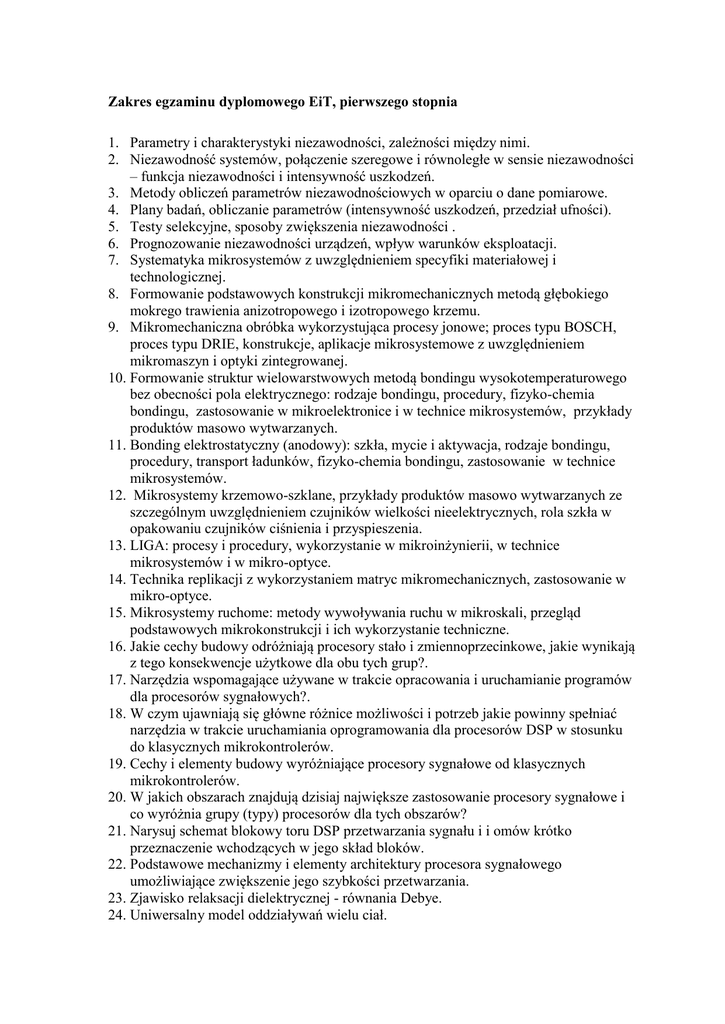 Zakres egzaminu dyplomowego EiT, pierwszego stopnia 1. Parametry i charakterystyki niezawodności, zależności między nimi. 2. Niezawodność systemów, połączenie szeregowe i równoległe w sensie niezawodności – funkcja niezawodności i intensywność uszkodzeń. 3. Metody obliczeń parametrów niezawodnościowych w oparciu o dane pomiarowe. 4. Plany badań, obliczanie parametrów (intensywność uszkodzeń, przedział ufności). 5. Testy selekcyjne, sposoby zwiększenia niezawodności . 6. Prognozowanie niezawodności urządzeń, wpływ warunków eksploatacji. 7. Systematyka mikrosystemów z uwzględnieniem specyfiki materiałowej i technologicznej. 8. Formowanie podstawowych konstrukcji mikromechanicznych metodą głębokiego mokrego trawienia anizotropowego i izotropowego krzemu. 9. Mikromechaniczna obróbka wykorzystująca procesy jonowe; proces typu BOSCH, proces typu DRIE, konstrukcje, aplikacje mikrosystemowe z uwzględnieniem mikromaszyn i optyki zintegrowanej. 10. Formowanie struktur wielowarstwowych metodą bondingu wysokotemperaturowego bez obecności pola elektrycznego: rodzaje bondingu, procedury, fizyko-chemia bondingu, zastosowanie w mikroelektronice i w technice mikrosystemów, przykłady produktów masowo wytwarzanych. 11. Bonding elektrostatyczny (anodowy): szkła, mycie i aktywacja, rodzaje bondingu, procedury, transport ładunków, fizyko-chemia bondingu, zastosowanie w technice mikrosystemów. 12. Mikrosystemy krzemowo-szklane, przykłady produktów masowo wytwarzanych ze szczególnym uwzględnieniem czujników wielkości nieelektrycznych, rola szkła w opakowaniu czujników ciśnienia i przyspieszenia. 13. LIGA: procesy i procedury, wykorzystanie w mikroinżynierii, w technice mikrosystemów i w mikro-optyce. 14. Technika replikacji z wykorzystaniem matryc mikromechanicznych, zastosowanie w mikro-optyce. 15. Mikrosystemy ruchome: metody wywoływania ruchu w mikroskali, przegląd podstawowych mikrokonstrukcji i ich wykorzystanie techniczne. 16. Jakie cechy budowy odróżniają procesory stało i zmiennoprzecinkowe, jakie wynikają z tego konsekwencje użytkowe dla obu tych grup?. 17. Narzędzia wspomagające używane w trakcie opracowania i uruchamianie programów dla procesorów sygnałowych?. 18. W czym ujawniają się główne różnice możliwości i potrzeb jakie powinny spełniać narzędzia w trakcie uruchamiania oprogramowania dla procesorów DSP w stosunku do klasycznych mikrokontrolerów. 19. Cechy i elementy budowy wyróżniające procesory sygnałowe od klasycznych mikrokontrolerów. 20. W jakich obszarach znajdują dzisiaj największe zastosowanie procesory sygnałowe i co wyróżnia grupy (typy) procesorów dla tych obszarów? 21. Narysuj schemat blokowy toru DSP przetwarzania sygnału i i omów krótko przeznaczenie wchodzących w jego skład bloków. 22. Podstawowe mechanizmy i elementy architektury procesora sygnałowego umożliwiające zwiększenie jego szybkości przetwarzania. 23. Zjawisko relaksacji dielektrycznej - równania Debye. 24. Uniwersalny model oddziaływań wielu ciał. 25. Metody pomiaru piezoelektryków. 26. Mikroskopowy model polaryzacji magnetycznej. 27. Pomiar pętli histerezy, wyznaczanie parametrów magnetyków. 28. Jak wyznaczysz składowe zespolonej przenikalności elektrycznej i magnetycznej materiału z pomiarów zmiennoprądowych. 29. Dlaczego obiekty materialne o większym stosunku liczby atomów powierzchniowych do atomów objętościowych (dowolne kropki kwantowe) charakteryzują się odmiennymi właściwościami od ich objętościowych odpowiedników? 30. Wymień znane Ci elementy elektroniki molekularnej i wyjaśnij, od czego zależą ich właściwości. 31. Wyjaśnij, dlaczego zależność konduktancji drutu kwantowego, w strukturze tranzystora, od napięcia bramki Vg ma charakter skokowy? 32. Podstawowe parametry energetyczne i fotometryczne promieniowania świetlnego (nazwy, definicje, jednostki). 33. Cechy psychofizyczne światła: - prawa Grassmana, związki między składowymi trójchromatycznymi i współrzędnymi trójchromatycznymi światła, sposób wyznaczania długości fali dominującej i czystości pobudzania, na podstawie wykresu chromatyczności x,y.Podstawowe sposoby adresowania i wyświetlania stosowane w ekranach wizyjnych. Jaki wpływ na wybór określonego sposobu ma czas reakcji ekranu. 35. Najczęściej stosowane rodzaje ekranów wizyjnych i ich właściwości. Jakie znaczenie praktyczne ma wydajność świetlna ( pokazać na charakterystykach) 36. Ekrany plazmowe – charakterystyka U/I wyładowania w gazie, zasady działania ekranów DC PDP oraz ACM PDP i ACC PDP (przebiegi napięciowo prądowe), podstawowe parametry. 37. Ekrany ciekłokrystaliczne: – zasada działania komórki LCD (co to jest warstwa orientująca?), zależność parametrów od temperatury i kąta widzenia, czas reakcji i sterowanie wyświetlaniem, co oznaczają akronimy: TN, STN, IPS, VA i MDVA, ekrany kolorowe. 38. Projektory wizyjne:- luminancja obrazu a parametry projekcji, rozdział strumieni RGB w projektorze LCD, projektor barwny z jednym przetwornikiem DMD. 39. Scalone przetworniki analizujące – podstawowe procesy, zasada rejestru CCD, architektura przetwornika CMOS, porównanie obu technologii. 40. Kamera video – filtr opt. addytywny i subtraktywny, zasada działania kamery z DFO typu „zielona szachownica” oraz kamery dwuprzetwornikowej. 41. Budowa i działanie elektronowego wzmacniacza obrazu III-ciej generacji z odwzorowaniem elektronooptycznym. Czym różnią się cztery generacje EWO? 42. Systemy kodowania liczb całkowitych i zmiennoprzecinkowych w języku C. Problem przenośności danych. 43. Rekurencja: zastosowania, ograniczenia. Podaj przykład algorytmu w wersji rekurencyjnej i iteracyjnej. 44. Porównaj algorytmy sortowania: bąbelkowe, przestawne, quick-sort. Złożoność obliczeniowa, zapotrzebowanie na pamięć, kiedy są stosowane. 45. Przedstaw na przykładzie języka C++ mechanizm 