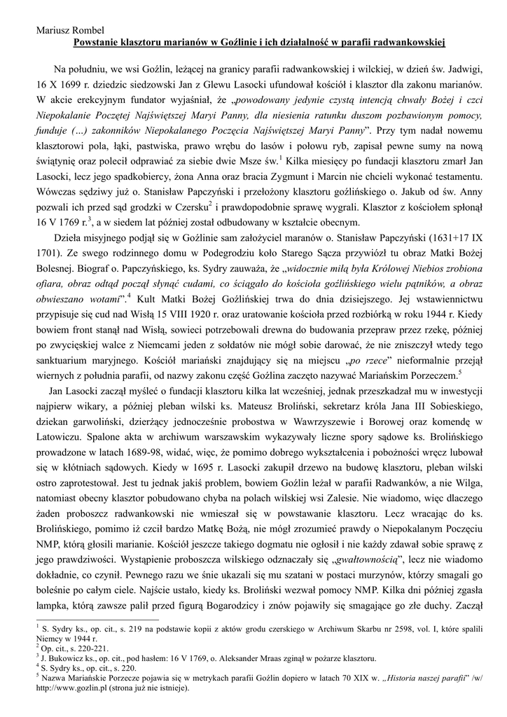 Mariusz Rombel Powstanie klasztoru marianów w Goźlinie i ich działalność w parafii radwankowskiej Na południu, we wsi Goźlin, leżącej na granicy parafii radwankowskiej i wilckiej, w dzień św. Jadwigi, 16 X 1699 r. dziedzic siedzowski Jan z Glewu Lasocki ufundował kościół i klasztor dla zakonu marianów. W akcie erekcyjnym fundator wyjaśniał, że „powodowany jedynie czystą intencją chwały Bożej i czci Niepokalanie Poczętej Najświętszej Maryi Panny, dla niesienia ratunku duszom pozbawionym pomocy, funduje (…) zakonników Niepokalanego Poczęcia Najświętszej Maryi Panny”. Przy tym nadał nowemu klasztorowi pola, łąki, pastwiska, prawo wrębu do lasów i połowu ryb, zapisał pewne sumy na nową świątynię oraz polecił odprawiać za siebie dwie Msze św. 1 Kilka miesięcy po fundacji klasztoru zmarł Jan Lasocki, lecz jego spadkobiercy, żona Anna oraz bracia Zygmunt i Marcin nie chcieli wykonać testamentu. Wówczas sędziwy już o. Stanisław Papczyński i przełożony klasztoru goźlińskiego o. Jakub od św. Anny pozwali ich przed sąd grodzki w Czersku2 i prawdopodobnie sprawę wygrali. Klasztor z kościołem spłonął 16 V 1769 r. 3, a w siedem lat później został odbudowany w kształcie obecnym. Dzieła misyjnego podjął się w Goźlinie sam założyciel maranów o. Stanisław Papczyński (1631+17 IX 1701). Ze swego rodzinnego domu w Podegrodziu koło Starego Sącza przywiózł tu obraz Matki Bożej Bolesnej. Biograf o. Papczyńskiego, ks. Sydry zauważa, że „widocznie miłą była Królowej Niebios zrobiona ofiara, obraz odtąd począł słynąć cudami, co ściągało do kościoła goźlińskiego wielu pątników, a obraz obwieszano wotami”. 4 Kult Matki Bożej Goźlińskiej trwa do dnia dzisiejszego. Jej wstawiennictwu przypisuje się cud nad Wisłą 15 VIII 1920 r. oraz uratowanie kościoła przed rozbiórką w roku 1944 r. Kiedy bowiem front stanął nad Wisłą, sowieci potrzebowali drewna do budowania przepraw przez rzekę, później po zwycięskiej walce z Niemcami jeden z sołdatów nie mógł sobie darować, że nie zniszczył wtedy tego sanktuarium maryjnego. Kościół mariański znajdujący się na miejscu „po rzece” nieformalnie przejął wiernych z południa parafii, od nazwy zakonu część Goźlina zaczęto nazywać Mariańskim Porzeczem.5 Jan Lasocki zaczął myśleć o fundacji klasztoru kilka lat wcześniej, jednak przeszkadzał mu w inwestycji najpierw wikary, a później pleban wilski ks. Mateusz Broliński, sekretarz króla Jana III Sobieskiego, dziekan garwoliński, dzierżący jednocześnie probostwa w Wawrzyszewie i Borowej oraz komendę w Latowiczu. Spalone akta w archiwum warszawskim wykazywały liczne spory sądowe ks. Brolińskiego prowadzone w latach 1689-98, widać, więc, że pomimo dobrego wykształcenia i pobożności wręcz lubował się w kłótniach sądowych. Kiedy w 1695 r. Lasocki zakupił drzewo na budowę klasztoru, pleban wilski ostro zaprotestował. Jest tu jednak jakiś problem, bowiem Goźlin leżał w parafii Radwanków, a nie Wilga, natomiast obecny klasztor pobudowano chyba na polach wilskiej wsi Zalesie. Nie wiadomo, więc dlaczego żaden proboszcz radwankowski nie wmieszał się w powstawanie klasztoru. Lecz wracając do ks. Brolińskiego, pomimo iż czcił bardzo Matkę Bożą, nie mógł zrozumieć prawdy o Niepokalanym Poczęciu NMP, którą głosili marianie. Kościół jeszcze takiego dogmatu nie ogłosił i nie każdy zdawał sobie sprawę z jego prawdziwości. Wystąpienie proboszcza wilskiego odznaczały się „gwałtownością”, lecz nie wiadomo dokładnie, co czynił. Pewnego razu we śnie ukazali się mu szatani w postaci murzynów, którzy smagali go boleśnie po całym ciele. Najście ustało, kiedy ks. Broliński wezwał pomocy NMP. Kilka dni później zgasła lampka, którą zawsze palił przed figurą Bogarodzicy i znów pojawiły się smagające go złe duchy. Zaczął 1 S. Sydry ks., op. cit., s. 219 na podstawie kopii z aktów grodu czerskiego w Archiwum Skarbu nr 2598, vol. I, które spalili Niemcy w 1944 r. 2 Op. cit., s. 220-221. 3 J. Bukowicz ks., op. cit., pod hasłem: 16 V 1769, o. Aleksander Mraas zginął w pożarze klasztoru. 4 S. Sydry ks., op. cit., s. 220. 5 Nazwa Mariańskie Porzecze pojawia się w metrykach parafii Goźlin dopiero w latach 70 XIX w. „Historia naszej parafii” /w/ http://www.gozlin.pl (strona już nie istnieje). wówczas wzywać Maryję i pojawił się anioł, który wyjaśnił, że jest to kara „za napastowanie towarzyszy Maryi”, czyli marianów. Po tym zdarzeniu ks. Broliński zmienił nastawienie do zakonu i dogmatu, a w czasie święta Niepokalanego Poczęcia, 8 XII 1698 r., wygłosił w budowanym kościele goźlińskim pamiętne kazanie. Rozpoczął je słowami z Ewangelii: „De qua natus est Jesus (z której narodził się Jezus)” oraz apostrofą: „Wielowładna na cały świat Monarchini i Panno”. Zakończył zaś zobowiązaniem, że „Twoje Niepokalane Poczęcie rozkrzewiać będziemy i jego bronić i życiem samym pieczętować gotowi będziemy. Amen.” Kazanie to wraz z wszystkimi cudownymi okolicznościami swego nawrócenia spisał i przekazał do archiwum mariańskiego, chciał też wydać je drukiem, lecz brakuje informacji czy mu się to udało. „Zwycięstwo, odniesione nad owym kapłanem, w przekonaniu ówczesnych marianów, przypisywano modlitwom o. Stanisława.”6 Kilka lat po fundacji, kiedy jeden z ekonomów z Goźlina, o nazwisku Karpiński, szykanował marianów, aby oddali mu ziemię, miejscowa ludność ostrzegała go: „Źle pan ekonom chce postąpić. Żeby mu się nie przytrafiło to samo, co i księdzu”.7 Zakon marianów, czyli Zgromadzenie Niepokalanego Poczęcia NMP założył o. Papczyński w 1673 r. w Puszczy Korabiewskiej koło Skierniewic, potem doszedł do tego klasztor w Górze Kalwarii i Skórcu. Celem zakonu było głoszenie czci dla Maryi, pomoc dla dusz czyśćcowych umieraj