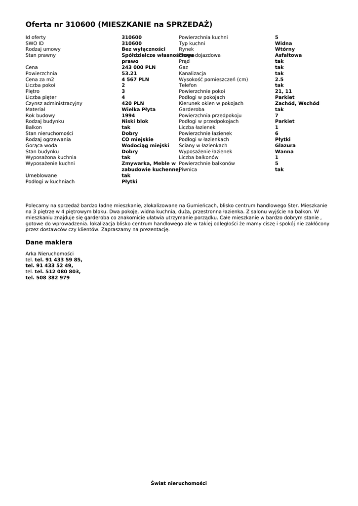 Oferta nr 310600 (MIESZKANIE na SPRZEDAŻ)