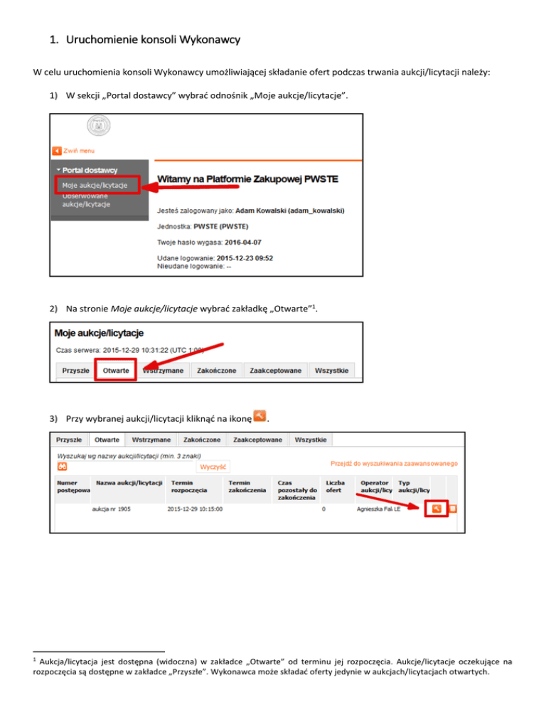 1. Uruchomienie konsoli Wykonawcy W celu uruchomienia konsoli Wykonawcy umożliwiającej składanie ofert podczas trwania aukcji/licytacji należy: 1) W sekcji „Portal dostawcy” wybrać odnośnik „Moje aukcje/licytacje”. 2) Na stronie Moje aukcje/licytacje wybrać zakładkę „Otwarte”1. 3) Przy wybranej aukcji/licytacji kliknąć na ikonę 1 . Aukcja/licytacja jest dostępna (widoczna) w zakładce „Otwarte” od terminu jej rozpoczęcia. Aukcje/licytacje oczekujące na rozpoczęcia są dostępne w zakładce „Przyszłe”. Wykonawca może składać oferty jedynie w aukcjach/licytacjach otwartych. 4) Zapoznać się z regulaminem aukcji/ licytacji a następnie w celu jego zaakceptowania kliknąć przycisk „Zaakceptuj regulamin aukcji/licytacji”2. 2. Składanie ofert Składanie ofert podczas trwania aukcji/licytacji umożliwia konsola Wykonawcy: 2 Warunkiem wyświetlenia Konsoli Wykonawcy jest zaakceptowanie załączonego Regulaminu aukcji/licytacji. Panel do składania ofert znajduje się w środkowej części konsoli Wykonawcy: Przed przystąpieniem do licytowania w polu służącym do wpisywania wartości oferty Wykonawca widzi cenę wywoławczą. W celu złożenia oferty należy: 1) Wybrać pozycję do licytacji poprzez zaznaczenia przy wybranej pozycji 2) Wpisać wartość własnej oferty w pole „Cena” 3) Kliknąć przycisk „Złóż ofertę” Jeżeli oferta zostanie przyjęta przez system, w kolumnie stan pojawi się zielony napis „Zaakceptowana”. Najniższa (najlepsza) złożona oferta jest wyświetlana w kolumnie „Cena” na konsoli Wykonawcy. Znajduje się ona na szarym tle pod polem służącym do wprowadzania wartości oferty dla licytowanej pozycji. Informacja o prowadzącej ofercie jest dostępna dla każdego uczestnika aukcji/licytacji przez cały czas jej trwania i jest aktualizowana przez system w momencie złożenia lepszej oferty (przebicia) przez któregokolwiek z uczestników aukcji/licytacji. 3. Odrzucenie oferty W przypadku nieprzyjęcia oferty przez system, w kolumnie stan pojawi się czerwony napis „Odrzucona”. Po kliknięciu na czerwony napis system wyświetli informację o przyczynie odrzucenia oferty. Przypadek I Oferta zostanie odrzucona gdy jej wartość jest gorsza (wyższa) od aktualnie prowadzącej (najniższej) oferty: Na powyżej przedstawionym rysunku oferta prowadząca wynosi 600 PLN, oferta wpisana przez Wykonawcę wynosi 650 PLN. Oferta Wykonawcy została odrzucona przez system gdyż jej wartość była wyższa od wartości oferty prowadzącej. Przypadek II Oferta zostanie odrzucona również gdy różnica pomiędzy wartością oferty a wartością aktualnie najniższej oferty jest mniejsza niż obowiązujący krok postąpienia3: 3 Gdy aukcja/licytacja jest otwarta, po najechaniu kursorem na pole do wpisywania oferty, system wyświetli wartość postąpienia. Na powyżej przedstawionym rysunku oferta prowadząca wynosi 600 PLN zaś oferta wpisana przez Wykonawcę -599 PLN. Krok postąpienia dla danej aukcji/licytacji wynosi 10 PLN. Oferta wpisana przez Wykonawcę została odrzucona gdyż różniła się od oferty prowadzącej o 1 PLN a minimalna różnica pomiędzy ofertą prowadząca a ofertą Wykonawcy powinna wynieść 10 PLN (krok postąpienia)4. 4. Historia ofert W celu wyświetlenia historii ofert wszystkich Wykonawców należy w sekcji Historia ofert (dostępnej w lewej dolnej części konsoli Wykonawcy) zaznaczyć licytowaną pozycję a następnie wybrać opcję Pokaż oferty: „przyjęte” . Wówczas system pokaże stan historyczny tj. wartości oraz czas złożenia ofert wszystkich Wykonawców. Historia ofert jest dostępna przez cały czas trwania aukcji/licytacji oraz po jej zakończeniu. System nie ujawnia informacji umożliwiających identyfikację Wykonawców. Nazwy uczestników aukcji/licytacji nie są wyświetlane w historii ofert Wykonawców. 4 Kolejne postąpienie składane przez Wykonawcę musi być korzystniejsze od najkorzystniejszej oferty o co najmniej wartość kroku postąpienia. 5. Zakończenie aukcji/licytacji Po zakończeniu aukcji/licytacji na konsoli Wykonawcy będzie wyświetlana wartość ostatniej złożonej oferty, wartość oferty prowadzącej, a także ikona żółtego młotka , jeśli Wykonawca zakończył aukcję/licytację na prowadzeniu: Na liście aukcji/licytacji, przedmiotową aukcję/licytację będzie można znaleźć w zakładce „zakończone” lub „zaakceptowane”, skąd będzie można pobrać raport z przebiegu aukcji/licytacji poprzez kliknięcie na ikonę w formacie .xls) lub (raport w formacie .pdf). (raport