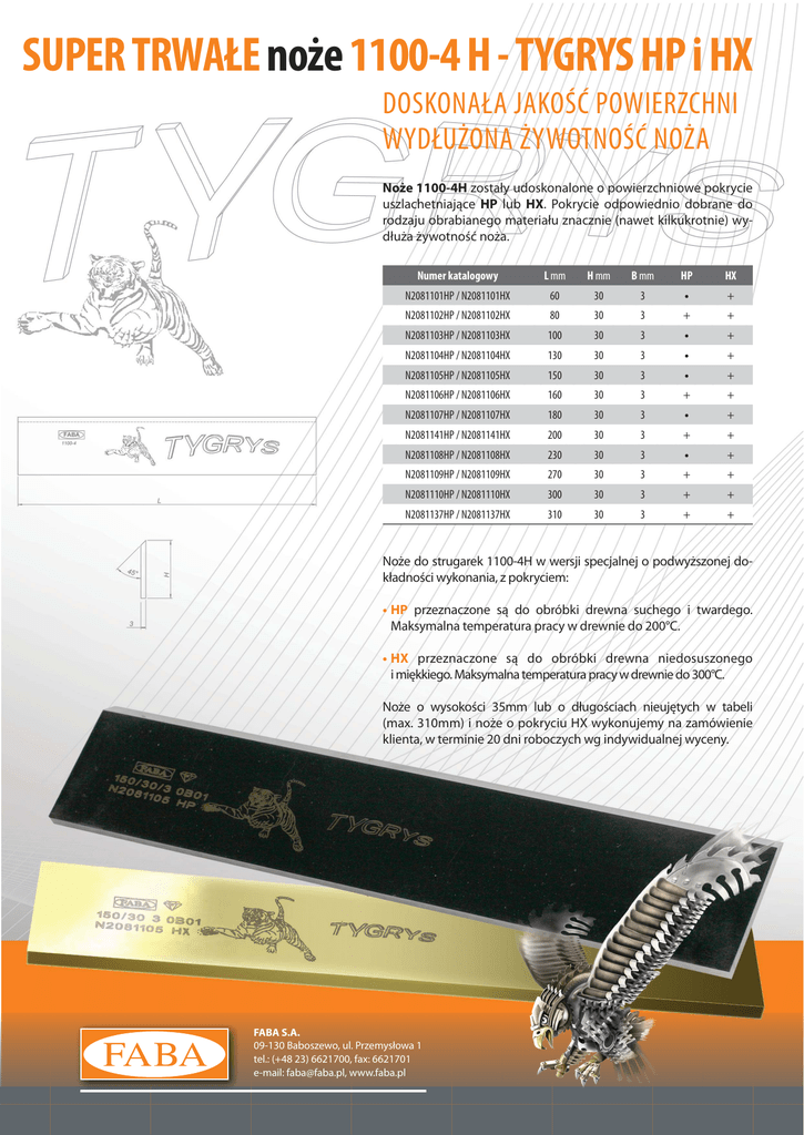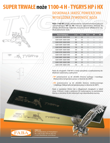 SUPER TRWAŁE noże 1100-4 H - TYGRYS HP i HX DOSKONAŁA JAKOŚĆ POWIERZCHNI WYDŁUŻONA ŻYWOTNOŚĆ NOŻA Noże1100-4H zostały udoskonalone o powierzchniowe pokrycie uszlachetniające HP lub HX. Pokrycie odpowiednio dobrane do rodzaju obrabianego materiału znacznie (nawet kilkukrotnie) wydłuża żywotność noża. Numer katalogowy L mm H mm B mm HP HX N2081101HP / N2081101HX 60 30 3 • + N2081102HP / N2081102HX 80 30 3 + + N2081103HP / N2081103HX 100 30 3 • + N2081104HP / N2081104HX 130 30 3 • + N2081105HP / N2081105HX 150 30 3 • + N2081106HP / N2081106HX 160 30 3 + + N2081107HP / N2081107HX 180 30 3 • + N2081141HP / N2081141HX 200 30 3 + + N2081108HP / N2081108HX 230 30 3 • + N2081109HP / N2081109HX 270 30 3 + + N2081110HP / N2081110HX 300 30 3 + + N2081137HP / N2081137HX 310 30 3 + + Noże do strugarek 1100-4H w wersji specjalnej o podwyższonej dokładności wykonania, z pokryciem: •HP przeznaczone są do obróbki drewna suchego i twardego. Maksymalna temperatura pracy w drewnie do 200°C. •HX przeznaczone są do obróbki drewna niedosuszonego i miękkiego. Maksymalna temperatura pracy w drewnie do 300°C. Noże o wysokości 35mm lub o długościach nieujętych w tabeli (max. 310mm) i noże o pokryciu HX wykonujemy na zamówienie klienta, w terminie 20 dni roboczych wg indywidualnej wyceny. FABA S.A. 09-130 Baboszewo, ul. Przemysłowa 1 tel.: (+48 23) 6621700, fax: 6621701 e-mail: [email protected], www.faba.pl