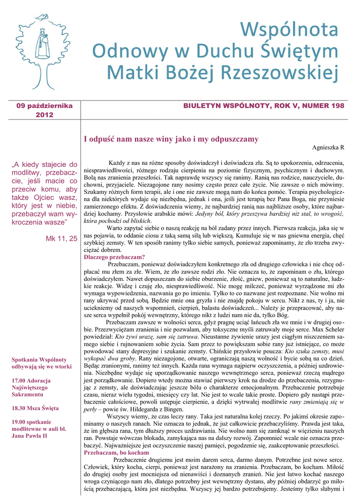 09 października 2012 BIULETYN WSPÓLNOTY, ROK V, NUMER 198 I odpuść nam nasze winy jako i my odpuszczamy Agnieszka R „A kiedy stajecie do modlitwy, przebaczcie, jeśli macie co przeciw komu, aby także Ojciec wasz, który jest w niebie, przebaczył wam wykroczenia wasze” Mk 11, 25 Spotkania Wspólnoty odbywają się we wtorki 17.00 Adoracja Najświętszego Sakramentu 18.30 Msza Święta 19.00 spotkanie modlitewne w auli bł. Jana Pawła II Każdy z nas na różne sposoby doświadczył i doświadcza zła. Są to upokorzenia, odrzucenia, niesprawiedliwości, różnego rodzaju cierpienia na poziomie fizycznym, psychicznym i duchowym. Bolą nas zranienia przeszłości. Tak naprawdę wszyscy się ranimy. Ranią nas rodzice, nauczyciele, duchowni, przyjaciele. Niezagojone rany nosimy często przez całe życie. Nie zawsze o nich mówimy. Szukamy różnych form terapii, ale i one nie zawsze mogą nam do końca pomóc. Terapia psychologiczna dla niektórych wydaje się niezbędna, jednak i ona, jeśli jest terapią bez Pana Boga, nie przyniesie zamierzonego efektu. Z doświadczenia wiemy, że najbardziej ranią nas najbliższe osoby, które najbardziej kochamy. Przysłowie arabskie mówi: Jedyny ból, który przeszywa bardziej niż stal, to wrogość, która pochodzi od bliskich. Warto zapytać siebie o naszą reakcję na ból zadany przez innych. Pierwsza reakcja, jaka się w nas pojawia, to oddanie ciosu z taką samą siłą lub większą. Kumuluje się w nas gniewna energia, chęć szybkiej zemsty. W ten sposób ranimy tylko siebie samych, ponieważ zapominamy, że zło trzeba zwyciężać dobrem. Dlaczego przebaczam? Przebaczam, ponieważ doświadczyłem konkretnego zła od drugiego człowieka i nie chcę odpłacać mu złem za złe. Wiem, że zło zawsze rodzi zło. Nie oznacza to, że zapominam o złu, którego doświadczyłem. Nawet dopuszczam do siebie oburzenie, złość, gniew, ponieważ są to naturalne, ludzkie reakcje. Widzę i czuję zło, niesprawiedliwość. Nie mogę milczeć, ponieważ wyrządzone mi zło wymaga wypowiedzenia, nazwania go po imieniu. Tylko to co nazwane jest rozpoznane. Nie wolno mi rany ukrywać przed sobą. Będzie mnie ona gryzła i nie znajdę pokoju w sercu. Nikt z nas, ty i ja, nie uciekniemy od naszych wspomnień, cierpień, balastu doświadczeń... Należy je przepracować, aby nasze serca wypełnił pokój wewnętrzny, którego nikt z ludzi nam nie da, tylko Bóg. Przebaczam zawsze w wolności serca, gdyż pragnę uciąć łańcuch zła we mnie i w drugiej oso bie. Przezwyciężam zranienia i nie pozwalam, aby toksyczne myśli zatruwały moje serce. Max Scheler powiedział: Kto żywi urazę, sam się zatruwa. Nieustanne żywienie urazy jest ciągłym niszczeniem samego siebie i rujnowaniem sobie życia. Sam przez to powiększam sobie rany już istniejące, co może powodować stany depresyjne i szukanie zemsty. Chińskie przysłowie poucza: Kto szuka zemsty, musi wykopać dwa groby. Rany niezagojone, otwarte, ograniczają naszą wolność i bycie sobą na co dzień. Będąc zranionymi, ranimy też innych. Każda rana wymaga najpierw oczyszczenia, a później uzdrowienia. Niezbędne wydaje się uporządkowanie naszego wewnętrznego serca, ponieważ rzeczą mądrego jest porządkowanie. Dopiero wtedy można stawiać pierwszy krok na drodze do przebaczenia, rezygnując z zemsty, ale doświadczając jeszcze bólu o charakterze emocjonalnym. Przebaczenie potrzebuje czasu, nieraz wielu tygodni, miesięcy czy lat. Nie jest to wcale takie proste. Dopiero gdy nastąpi przebaczenie całościowe, powoli ustępuje cierpienie, a dzięki wytrwałej modlitwie rany zmieniają się w perły – powie św. Hildegarda z Bingen. Wszyscy wiemy, że czas leczy rany. Taka jest naturalna kolej rzeczy. Po jakimś okresie zapo minamy o naszych ranach. Nie oznacza to jednak, że już całkowicie przebaczyliśmy. Prawda jest taka, że im głębsza rana, tym dłuższy proces uzdrawiania. Nie wolno nam się zamknąć w więzieniu naszych ran. Powstaje wówczas blokada, zamykająca nas na dalszy rozwój. Zapomnieć wcale nie oznacza przebaczyć. Najważniejsze jest oczyszczenie naszej pamięci, pogodzenie się, zaakceptowanie przeszłości. Przebaczam, bo kocham Przebaczenie drugiemu jest moim darem serca, darmo danym. Potrzebne jest nowe serce. Człowiek, który kocha, cierpi, ponieważ jest narażony na zranienia. Przebaczam, bo kocham. Miłość do drugiej osoby jest mocniejsza od nienawiści i doznanych zranień. Nie jest łatwo kochać naszego wroga czyniącego nam zło, dlatego potrzebny jest wewnętrzny dystans, aby później obdarzyć go miłością przebaczającą, która jest niezbędna. Wszyscy jej bardzo potrzebujemy. Jesteśmy tylko słabymi i Odpowiedzialni za Wspólnotę pasterz o. Wiktor Tokarski OFM tel. 17.853.34.95 w. 125 lider Barbara K. v-ce lider Wiesława M. v-ce lider Jacek F. Animatorzy Diakonii Barbara K. diakonia adoracyjna Marta F. diakonia prorocka Jacek F. diakonia modlitwy wstawienniczej i uwolnienia Agnieszka R. diakonia nauczania Jolanta S. diakonia uwielbienia Barbara S. diakonia miłosierdzia kruchymi ludźmi. Miłość, która jest ściśle powiązana z przebaczeniem, wykracza poza prawo. Jak mówił Tomasz z Akwinu: Sprawiedliwość bez miłosierdzia jest okrutna. Kto kocha naprawdę, przebacza. Nie mam wątpliwości, że potrzebna jest do tego pokora serca. Jako ludzie Boga, z Boga i dla Boga oczekujemy Jego pomocy. Bóg okazuje nam swoją mi łość. Jako miłosierny Ojciec pierwszy nas, grzeszników ukochał i pierwszy nam przebacza. My, chrześcijanie, wpatrujemy się w Jezusa na krzyżu przebaczającego swoim oprawcom. Dzięki temu uczymy się od naszego Mistrza przebaczać i prosić o przebaczenie słowami Modlitwy Pańskiej. Amerykański kapłan i charyzmatyk, o. Robert DeGrandis zaproponował modlitwę przebacze nia. Jest ona niezwykle skuteczna i stanowi pierwszy, niezbędny krok w posłudze uzdrowienia. Potrzebujemy go w pięciu 
