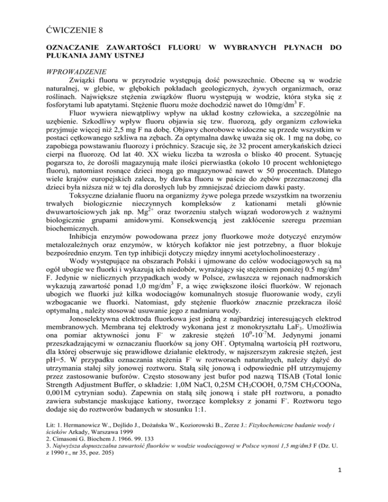ĆWICZENIE 8 OZNACZANIE ZAWARTOŚCI FLUORU W WYBRANYCH PŁYNACH DO PŁUKANIA JAMY USTNEJ WPROWADZENIE Związki fluoru w przyrodzie występują dość powszechnie. Obecne są w wodzie naturalnej, w glebie, w głębokich pokładach geologicznych, żywych organizmach, oraz roślinach. Największe stężenia związków fluoru występują w wodzie, która styka się z fosforytami lub apatytami. Stężenie fluoru może dochodzić nawet do 10mg/dm3 F. Fluor wywiera niewątpliwy wpływ na układ kostny człowieka, a szczególnie na uzębienie. Szkodliwy wpływ fluoru objawia się tzw. fluorozą, gdy organizm człowieka przyjmuje więcej niż 2,5 mg F na dobę. Objawy chorobowe widoczne są przede wszystkim w postaci cętkowanego szkliwa na zębach. Za optymalna dawkę uważa się ok. 1 mg na dobę, co zapobiega powstawaniu fluorozy i próchnicy. Szacuje się, że 32 procent amerykańskich dzieci cierpi na fluorozę. Od lat 40. XX wieku liczba ta wzrosła o blisko 40 procent. Sytuację pogarsza to, że dorośli magazynują małe ilości pierwiastka (około 10 procent wchłoniętego fluoru), natomiast rosnące dzieci mogą go magazynować nawet w 50 procentach. Dlatego wiele krajów europejskich zaleca, by dawka fluoru w paście do zębów przeznaczonej dla dzieci była niższa niż w tej dla dorosłych lub by zmniejszać dzieciom dawki pasty. Toksyczne działanie fluoru na organizmy żywe polega przede wszystkim na tworzeniu trwałych biologicznie nieczynnych kompleksów z kationami metali głównie dwuwartościowych jak np. Mg2+ oraz tworzeniu stałych wiązań wodorowych z ważnymi biologicznie grupami amidowymi. Konsekwencją jest zakłócenie szeregu przemian biochemicznych. Inhibicja enzymów powodowana przez jony fluorkowe może dotyczyć enzymów metalozależnych oraz enzymów, w których kofaktor nie jest potrzebny, a fluor blokuje bezpośrednio enzym. Ten typ inhibicji dotyczy między innymi acetylocholinoesterazy . Wody występujące na obszarach Polski i ujmowane do celów wodociągowych są na ogół ubogie we fluorki i wykazują ich niedobór, wyrażający się stężeniem poniżej 0.5 mg/dm3 F. Jedynie w nielicznych przypadkach wody w Polsce, zwłaszcza w rejonach nadmorskich wykazują zawartość ponad 1,0 mg/dm3 F, a więc zwiększone ilości fluorków. W rejonach ubogich we fluorki już kilka wodociągów komunalnych stosuje fluorowanie wody, czyli wzbogacanie we fluorki. Natomiast, gdy stężenie fluorków znacznie przekracza ilość optymalną , należy stosować usuwanie jego z nadmiaru wody. Jonoselektywna elektroda fluorkowa jest jedną z najbardziej interesujących elektrod membranowych. Membrana tej elektrody wykonana jest z monokryształu LaF3. Umożliwia ona pomiar aktywności jonu F- w zakresie stężeń 100-10-7M. Jedynymi jonami przeszkadzającymi w oznaczaniu fluorków są jony OH-. Optymalną wartością pH roztworu, dla której obserwuje się prawidłowe działanie elektrody, w najszerszym zakresie stężeń, jest pH=5. W przypadku oznaczania stężenia F- w roztworach naturalnych, należy dążyć do utrzymania stałej siły jonowej roztworu. Stałą siłę jonową i odpowiednie pH utrzymujemy przez zastosowanie buforów. Często stosowany jest bufor pod nazwą TISAB (Total Ionic Strength Adjustment Buffer, o składzie: 1,0M NaCl, 0,25M CH3COOH, 0,75M CH3COONa, 0,001M cytrynian sodu). Zapewnia on stałą siłę jonową i stałe pH roztworu, a ponadto zawiera substancje maskujące kationy, tworzące kompleksy z jonami F-. Roztworu tego dodaje się do roztworów badanych w stosunku 1:1. Lit: 1. Hermanowicz W., Dojlido J., Dożańska W., Koziorowski B., Zerze J.: Fizykochemiczne badanie wody i ścieków Arkady, Warszawa 1999 2. Cimasoni G. Biochem J. 1966. 99. 133 3. Najwyższa dopuszczalna zawartość fluorków w wodzie wodociągowej w Polsce wynosi 1,5 mg/dm3 F (Dz. U. z 1990 r., nr 35, poz. 205) 1 Cel ćwiczenia Oznaczenie polega na pomiarze potencjału elektrody jonoselektywnej fluorkowej, zanurzonej w badanej próbce (roztwór płynu do płukania jamy ustnej), względem elektrody odniesienia (elektroda kalomelowa). Różnica potencjałów między elektrodami jest miarą stężenia jonów fluorkowych. Odczynniki, naczynia i przyrządy - Elektroda jonoselektywna - fluorkowa - Elektroda odniesienia – kalomelowa. - Woltomierz - Naczynka pomiarowe - Zestaw kolb miarowych - Zestaw pipet - Bufor wyrównujący moc jonową (bufor cytrynianowy) Sposób wykonania ćwiczenia 1. Fluorek sodowy, podstawowy roztwór wzorcowy (A). W kolbie miarowej o pojemności 1 dm3 rozpuścić w wodzie destylowanej 2,210 g fluorku sodu, uzupełnić wodą destylowaną do kreski i wymieszać. W 1 cm3 przygotowanego roztworu znajduje się 1 mg fluorków. Roztwór przechowywany w butelce polietylenowej jest trwały przez około 6 m-cy. 2. Skala wzorców i krzywa wzorcowa. Jeśli badana próbka zawiera od 10 do 1000 mg/dm3 F, do sześciu kolb miarowych o pojemności 100 cm3 odmierzyć kolejno 1.0, 5.0, 10.0, 25.0, 50.0, i 100 cm3 podstawowego roztworu wzorcowego (A), uzupełnić wodą destylowaną do kreski i wymieszać. Stężenie fluorków w przygotowanych wzorcach wynoszą kolejno 10, 50, 100, 250, 500, 1000 mg/dm3 F. Wzorce (50 cm3) przelać do zlewek o pojemności 150 cm3 i dodać do każdego po 10 cm3 roztworu buforowego. Elektrody fluorkową i kalomelową zanurzyć kolejno w poszczególnych wzorcach i mieszając z umiarkowaną, stałą prędkością, wykonać pomiary wartości potencjału w mV. Wartości potencjału odczytywać po upływie 3-5 minutach od zanurzenia elektrody w roztworze. Sporządzić krzywą wzorcową E=f(logC), gdzie stężenie fluorków w mg/dm3. Wykonanie oznaczenia Odmierzyć 10 cm3 badanej próbki (płyn do płukania ust) i rozpuścić w wodzie w kolbie o objętości 100 cm3. Do zlewki o pojemności 150 cm3 przenieść 50 cm3 roztworu, dodać 10 cm3 roztworu buforowego. Zanurzyć elektrody i włączyć mieszadło magnetyczne. Mieszając z taką samą prędkością 
