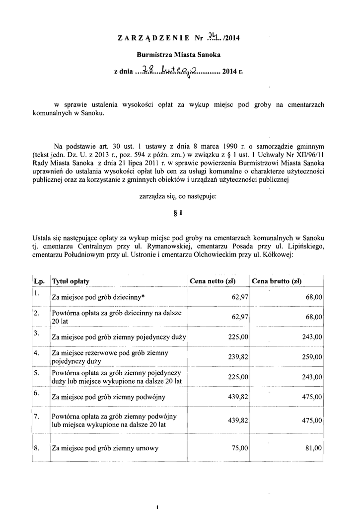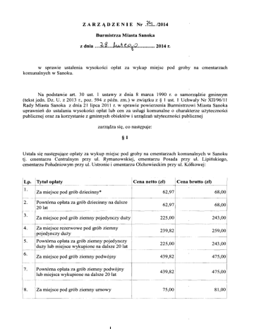Z A R Z 4 I) Z E N I E Nr ?!lie. 12014 Burmistrza Miasta Sanoka z dnia ...?;g .....!&~.~.C?.~Q ............. 2014 r. w sprawie ustalenia wysokoici oplat za wykup miejsc pod groby na cmentarzach komunaln ych w Sanoku. Na podstawie art. 30 ust. 1 ustawy z dnia 8 marca 1990 r. o samorzqdzie grninnym (tekst jedn. Dz. U. z 2013 r., poz. 594 z pozn. zm.) w zwiqzku z 8 1 ust. 1 Uchwaly Nr XII/96/11 Rady Miasta Sanoka z dnia 2 1 lipca 201 1 r. w sprawie powierzenia Burmistrzowi Miasta Sanoka uprawnien do ustalania wysokoSci oplat lub cen za uslugi komunalne o charakterze uzytecznoSci publicznej oraz za korzystanie z gminnych obiektow i urzqdzari uzytecznoSci publicznej zarzqdza sic, co nastcpuje: Ustala siq nastcpujqce oplaty za wykup miejsc pod groby na cmentarzach komunalnych w Sanoku tj. cmentarzu Centralnyrn przy ul. Rymanowskiej, cmentarzu Posada przy ul. Lipinskiego, cmentarzu Poludniowym przy ul. Ustronie i cmentarzu Olchowieckim przy ul. Kolkowej: Tytul oplaty - - -- .. - 1 Cena netto (zl) Cena brutto (zl) 1 Za miejsce pod grob dziecinny* I I oplata za grob dziecinny na dalsze 1 Za miejsce pod grab ziemny pojedynczy duiy 3' 14. Za miej sce rezenvowe pod grob zietnny pojedynczy duzy -.. -- . . 1Powtorna oplata za grob ziemny pojedynczy -- - - - 1 6* -- Za miejsce pod grab ziemny podwbjny Powtorna oplata za grob ziemny podwojny lub miejsca wykupione na dalsze 20 lat I Is. I i -- lub miejsce wykupione na- dalsze 20 lat - . -- 1 Za miejsce pod g o b ziemny urnowy 225.09 - - 1 1 Powtoma oplata za miejsce pod grbb ziemny 1 9. L -~ ~~ I 1I - ~ 10. Za miejsce pod gr6b murowany 1-osobowy I Za rniejsce pod gr6b murowany 2-osobowy 1iondygnacyjny I 1 I I umowy na dalsze 20 lat ~J-... - -- 112. 1 1 Za miejsce pod grob murowany 2-osobowy 2-kondygnacyjny Ii3+ i Za miejsce pod grob murowany 4-osobowy 2-kondygnacyj ny - Za kazdq nastepnq kondygnacje w grobie , murowanym 1 1 l5 Ii 16' Za nisze na umy w kolumbarium Za miejsce pod grbb murowany umowy .~ - - - - -- Oplata za prawo budowy grobu murowanego 17. I -osobowego lub 2-osobowego 1 2-kondygnacyjnego na istniejqcym grobie 1 1 ziemnym I 1 L . za prawo budowy niszy murowanej na istniejqcym grobie ziemnym 620,OO I 1 1 I 181,00( . - _--. -1 * grob dziecinny - grbb ziemny, w kt6rym sklada sie trumng ze zwlokami dziecka do 6 lat. Wykonanie zarzqdzenia powierza sie Naczelnikowi Wydzialu Gospodarki Komunalnej, Ochrony ~rodowiskai Zarzqdzania Kryzysowego Urzqdu Miasta Sanoka. Traci moc Zarzqdzenie Nr 9712011 Burmistrza Miasta Sanoka z dnia 22 lipca 201 1 r. w sprawie ustalenia wysokosci oplat za wykup miejsc pod groby na cmentarzach komunalnych w Sanoku. Zarzqdzenie wchodzi w zycie z dniem podpisania.