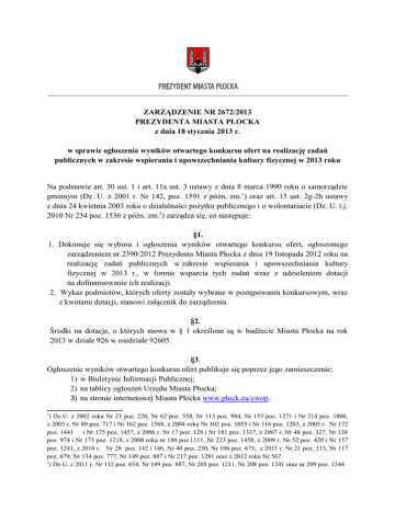ZARZĄDZENIE NR 2672/2013 PREZYDENTA MIASTA PŁOCKA z dnia 18 stycznia 2013 r. w sprawie ogłoszenia wyników otwartego konkursu ofert na realizację zadań publicznych w zakresie wspierania i upowszechniania kultury fizycznej w 2013 roku Na podstawie art. 30 ust. 1 i art. 11a ust. 3 ustawy z dnia 8 marca 1990 roku o samorządzie gminnym (Dz. U. z 2001 r. Nr 142, poz. 1591 z późn. zm.1) oraz art. 15 ust. 2g-2h ustawy z dnia 24 kwietnia 2003 roku o działalności pożytku publicznego i o wolontariacie (Dz. U. t.j. 2010 Nr 234 poz. 1536 z późn. zm.2) zarządza się, co następuje: §1. 1. Dokonuje się wyboru i ogłoszenia wyników otwartego konkursu ofert, ogłoszonego zarządzeniem nr 2390/2012 Prezydenta Miasta Płocka z dnia 19 listopada 2012 roku na realizację zadań publicznych w zakresie wspierania i upowszechniania kultury fizycznej w 2013 r., w formie wsparcia tych zadań wraz z udzieleniem dotacji na dofinansowanie ich realizacji. 2. Wykaz podmiotów, których oferty zostały wybrane w postępowaniu konkursowym, wraz z kwotami dotacji, stanowi załącznik do zarządzenia. §2. Środki na dotacje, o których mowa w § 1 określone są w budżecie Miasta Płocka na rok 2013 w dziale 926 w rozdziale 92605. §3. Ogłoszenie wyników otwartego konkursu ofert publikuje się poprzez jego zamieszczenie: 1) w Biuletynie Informacji Publicznej; 2) na tablicy ogłoszeń Urzędu Miasta Płocka; 3) na stronie internetowej Miasta Płocka www.plock.eu/cwop. 1 ) Dz.U. z 2002 roku Nr 23 poz. 220, Nr 62 poz. 558, Nr 113 poz. 984, Nr 153 poz. 1271 i Nr 214 poz. 1806, z 2003 r. Nr 80 poz. 717 i Nr 162 poz. 1568, z 2004 roku Nr 102 poz. 1055 i Nr 116 poz. 1203, z 2005 r. Nr 172 poz. 1441 i Nr 175 poz. 1457, z 2006 r. Nr 17 poz. 128 i Nr 181 poz. 1337, z 2007 r. Nr 48 poz. 327, Nr 138 poz. 974 i Nr 173 poz. 1218, z 2008 roku nr 180 poz.1111, Nr 223 poz. 1458, z 2009 r. Nr 52 poz. 420 i Nr 157 poz. 1241, z 2010 r. Nr 28 poz. 142 i 146, Nr 40 poz. 230, Nr 106 poz. 675, z 2011 r. Nr 21 poz. 113, Nr 117 poz. 679, Nr 134 poz. 777, Nr 149 poz. 887 i Nr 217 poz. 1281 oraz z 2012 roku Nr 567. 2 ) Dz.U. z 2011 r. Nr 112 poz. 654, Nr 149 poz. 887, Nr 205 poz. 1211, Nr 208 poz. 1241 oraz nr 209 poz. 1244 §4. Wykonanie zarządzenia powierza się Zastępcy Prezydenta Miasta Płocka ds. Polityki Społecznej. §5. Zarządzenie wchodzi w życie z dniem podpisania. Prezydent Miasta Płocka /-/ Andrzej Nowakowski Załącznik do Zarządzenia nr 2672/2013 Prezydenta Miasta Płocka z dnia 18 stycznia 2013 r. Lp. Wnioskodawca Tytuł zadania Kwota udzielonej dotacji 1 Klub Sportowy „Stoczniowiec” Organizacja szkolenia sportowego oraz udział we współzawodnictwie sportowym w zakresie piłki nożnej 65 000,00 zł 2 Uczniowski Klub Sportowy „Mazowsze” Płock Organizacja szkolenia sportowego oraz udział we współzawodnictwie sportowym w zakresie piłki nożnej 18 000,00 zł 3 Klub Sportowy Królewscy Płock Organizacja szkolenia sportowego oraz udział we współzawodnictwie sportowym w zakresie piłki nożnej 13 500,00 zł 4 Klub Sportowy MON-POL Płock Organizacja szkolenia sportowego oraz udział we współzawodnictwie sportowym w zakresie koszykówki kobiet i mężczyzn 55 000,00 zł 5 Międzyszkolny Organizacja szkolenia sportowego oraz udział Uczniowski Klub we współzawodnictwie sportowym w zakresie koszykówki Sportowy „21 Płock” i piłki ręcznej 36 000,00 zł 6 Stowarzyszenie Organizacja szkolenia sportowego oraz udział Sportowe „Mustangs we współzawodnictwie sportowym w zakresie Futbol Płock” Amerykański 23 000,00 zł 7 Międzyszkolny Uczniowski Klub Sportowy Volley Płock Organizacja szkolenia sportowego oraz udział we współzawodnictwie sportowym w zakresie piłki siatkowej 48 000,00 zł 8 Stowarzyszenie Kultury Fizycznej Wisła Płock Organizacja szkolenia sportowego oraz udział we współzawodnictwie sportowym w zakresie piłki ręcznej 60 000,00 zł 9 AZS PWSZ Jutrzenka Płock Organizacja szkolenia sportowego oraz udział we współzawodnictwie sportowym w zakresie piłki ręcznej kobiet i judo 70 000,00 zł 10 Organizacja szkolenia sportowego oraz udział Uczniowski Klub Sportowy Judo Kano we współzawodnictwie sportowym w zakresie judo 27 000,00 zł 11 Uczniowski Klub Sportowy Judo Sensei Organizacja szkolenia sportowego oraz udział we współzawodnictwie sportowym w zakresie judo 22 000,00 zł 12 Uczniowski Klub Sportowy „Eljot” z siedzibą w Płocku Organizacja szkolenia sportowego oraz udział we współzawodnictwie sportowym w zakresie judo 27 000,00 zł 13 Miejski Uczniowski Klub Sportowy Płock Organizacja szkolenia sportowego oraz udział we współzawodnictwie sportowym w zakresie lekkiej atletyki 31 500,00 zł 14 Miejsko-Ludowy Klub Lekkoatletyczny Płock Organizacja szkolenia sportowego oraz udział we współzawodnictwie sportowym w zakresie lekkiej atletyki 15 500,00 zł Lp. Wnioskodawca Tytuł zadania Kwota udzielonej dotacji 15 Organizacja szkolenia sportowego oraz udział Płockie Towarzystwo we współzawodnictwie sportowym w zakresie triathlonu Triathlonu „DELTA” 7 000,00 zł 16 Płockie Towarzystwo Wioślarskie Organizacja szkolenia sportowego oraz udział we współzawodnictwie sportowym w zakresie wioślarstwa 265 000,00 zł 17 Szkółka Żeglarska im. Leonida Teligi Organizacja szkolenia sportowego oraz udział we współzawodnictwie sportowym w zakresie żeglarstwa 11 000,00 zł 18 Klub Pływacki „MZOS Płock” Organizacja szkolenia sportowego oraz udział we współzawodnictwie sportowym w zakresie pływania 38 700,00 zł 19 Płockie Stowarzyszenie Pływackie „SWIM Płock” Organizacja szkolenia sportowego oraz udział we współzawodnictwie sportowym w zakresie pływania 13 500,00 zł 20 Uczniowski Klub Organizacja szkolenia sportowego oraz udział Sportowy „Victoria” we współzawodnictwie sportowym w zakresie tenisa Płock stołowego 21 Uczniowski Klub Sportowy „70” Organizacja szkolenia sportowego oraz udział we współzawo