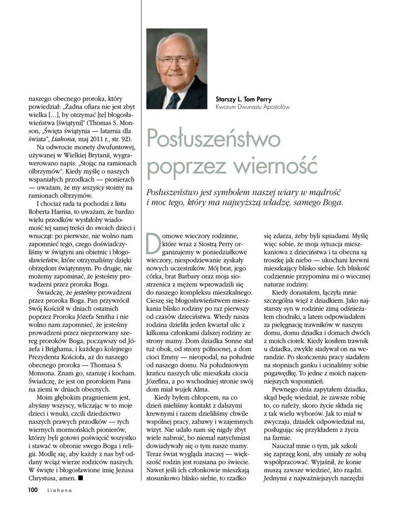 naszego obecnego proroka, który powiedział: „Żadna ofiara nie jest zbyt wielka […], by otrzymać [te] błogosławieństwa [świątyni]” (Thomas S. Monson, „Święta świątynia — latarnia dla świata”, Liahona, maj 2011 r., str. 92). Na odwrocie monety dwufuntowej, używanej w Wielkiej Brytanii, wygrawerowano napis: „Stojąc na ramionach olbrzymów”. Kiedy myślę o naszych wspaniałych przodkach — pionierach — uważam, że my wszyscy stoimy na ramionach olbrzymów. I chociaż rada ta pochodzi z listu Roberta Harrisa, to uważam, że bardzo wielu przodków wysłałoby wiadomość tej samej treści do swoich dzieci i wnucząt: po pierwsze, nie wolno nam zapomnieć tego, czego doświadczyliśmy w świątyni ani obietnic i błogosławieństw, które otrzymaliśmy dzięki obrzędom świątynnym. Po drugie, nie możemy zapominać, że jesteśmy prowadzeni przez proroka Boga. Świadczę, że jesteśmy prowadzeni przez proroka Boga. Pan przywrócił Swój Kościół w dniach ostatnich poprzez Proroka Józefa Smitha i nie wolno nam zapomnieć, że jesteśmy prowadzeni przez nieprzerwany szereg proroków Boga, począwszy od Józefa i Brighama, i każdego kolejnego Prezydenta Kościoła, aż do naszego obecnego proroka — Thomasa S. Monsona. Znam go, szanuję i kocham. Świadczę, że jest on prorokiem Pana na ziemi w dniach obecnych. Moim głębokim pragnieniem jest, abyśmy wszyscy, wliczając w to moje dzieci i wnuki, czcili dziedzictwo naszych prawych przodków — tych wiernych mormońskich pionierów, którzy byli gotowi poświęcić wszystko i stawać w obronie swego Boga i religii. Modlę się, aby każdy z nas był oddany wciąż wierze rodziców naszych. W święte i błogosławione imię Jezusa Chrystusa, amen. ◼ 100 Liahona Starszy L. Tom Perry Kworum Dwunastu Apostołów Posłuszeństwo poprzez wierność Posłuszeństwo jest symbolem naszej wiary w mądrość i moc tego, który ma najwyższą władzę, samego Boga. D omowe wieczory rodzinne, które wraz z Siostrą Perry organizujemy w poniedziałkowe wieczory, niespodziewanie zyskały nowych uczestników. Mój brat, jego córka, brat Barbary oraz moja siostrzenica z mężem wprowadzili się do naszego kompleksu mieszkalnego. Cieszę się błogosławieństwem mieszkania blisko rodziny po raz pierwszy od czasów dzieciństwa. Wtedy nasza rodzina dzieliła jeden kwartał ulic z kilkoma członkami dalszej rodziny ze strony mamy. Dom dziadka Sonne stał tuż obok, od strony północnej, a dom cioci Emmy — nieopodal, na południe od naszego domu. Na południowym krańcu naszych ulic mieszkała ciocia Józefina, a po wschodniej stronie swój dom miał wujek Alma. Kiedy byłem chłopcem, na co dzień mieliśmy kontakt z dalszymi krewnymi i razem dzieliliśmy chwile wspólnej pracy, zabawy i wzajemnych wizyt. Nie udało nam się nigdy zbyt wiele nabroić, bo niemal natychmiast dowiadywały się o tym nasze mamy. Teraz świat wygląda inaczej — większość rodzin jest rozsiana po świecie. Nawet jeśli ich członkowie mieszkają stosunkowo blisko siebie, to rzadko się zdarza, żeby byli sąsiadami. Myślę więc sobie, że moja sytuacja mieszkaniowa z dzieciństwa i ta obecna są troszkę jak niebo — ukochani krewni mieszkający blisko siebie. Ich bliskość codziennie przypomina mi o wiecznej naturze rodziny. Kiedy dorastałem, łączyła mnie szczególna więź z dziadkiem. Jako najstarszy syn w rodzinie zimą odśnieżałem chodniki, a latem odpowiadałem za pielęgnację trawników w naszym domu, domu dziadka i domach dwóch z moich ciotek. Kiedy kosiłem trawnik u dziadka, zwykle siadywał on na werandzie. Po skończeniu pracy siadałem na stopniach ganku i ucinaliśmy sobie pogawędkę. To jedne z moich najcenniejszych wspomnień. Pewnego dnia zapytałem dziadka, skąd będę wiedział, że zawsze robię to, co należy, skoro życie składa się z tak wielu wyborów. Jak to miał w zwyczaju, dziadek odpowiedział mi, posługując się przykładem z życia na farmie. Nauczał mnie o tym, jak szkoli się zaprzęg koni, aby umiały ze sobą współpracować. Wyjaśnił, że konie muszą zawsze wiedzieć, kto rządzi. Jednymi z najważniejszych narzędzi pozwalającymi kontrolować konia i nim kierować są uprząż i wędzidło. Jeśli któryś z koni w zaprzęgu uzna, że nie musi słuchać woźnicy, cały zaprzęg nie ciągnie i nie pracuje razem, czyli nie wykorzystuje w pełni swych możliwości. Przeanalizujmy teraz lekcję, jaką dziadek przekazał mi dzięki temu porównaniu. Kto powozi zaprzęgiem? Dziadek wierzył, że tym woźnicą jest Pan. To On wyznacza cel i ma plan. On również szkoli i trenuje konie w zaprzęgu, czyli w istocie każdego konia z osobna. Woźnica zawsze najlepiej wie, co robić, więc jedynym sposobem na to, by koń zawsze miał pewność, że robi to, co należy, jest posłuszeństwo woli woźnicy i postępowanie wedle jego wskazówek. Do czego dziadek przyrównał uprząż i wędzidło? I wtedy, i dzisiaj wierzę, że dziadek chciał mnie nauczyć, abym postępował zgodnie z podszeptami Ducha Świętego. W jego rozumieniu uprząż i wędzidło były duchowe. Posłusznemu koniowi, pracującemu w dobrze wyszkolonym zaprzęgu, wystarczy zaledwie delikatne pociągnięcie woźnicy, aby zrobił dokładnie to, co ma zrobić. To delikatne wskazanie jest odpowiednikiem spokojnego, cichego głosu, którym przemawia do nas Pan. Z szacunku dla naszej wolnej woli nigdy nie jest to mocne szarpnięcie. Mężczyźni i kobiety, którzy ignorują łagodne podszepty Ducha, często otrzymują nauczkę, podobnie jak syn marnotrawny, poprzez naturalne konsekwencje życia w nieposłuszeństwie i buncie. Dopiero, gdy naturalne skutki wybranego postępowania ukorzyły syna marnotrawnego, „[wejrzał on] w siebie” i usłyszał podszepty Ducha, mówiące mu, że ma powrócić do domu swego ojca (zob. Ew. Łukasza 15:11–32). Zatem nauka, jaką przekazał mi dziadek mówiła, że należy być zaw