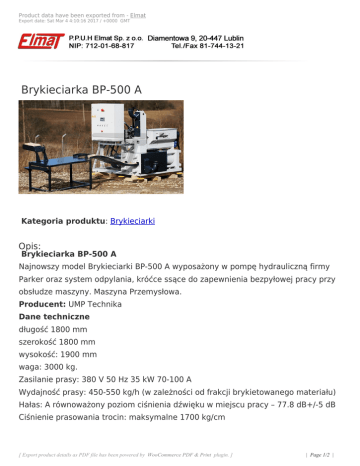 Product data have been exported from - Elmat Export date: Sat Mar 4 4:10:16 2017 / +0000 GMT Brykieciarka BP-500 A Kategoria produktu: Brykieciarki Opis: Brykieciarka BP-500 A Najnowszy model Brykieciarki BP-500 A wyposażony w pompę hydrauliczną firmy Parker oraz system odpylania, króćce ssące do zapewnienia bezpyłowej pracy przy obsłudze maszyny. Maszyna Przemysłowa. Producent: UMP Technika Dane techniczne długość 1800 mm szerokość 1800 mm wysokość: 1900 mm waga: 3000 kg. Zasilanie prasy: 380 V 50 Hz 35 kW 70-100 A Wydajność prasy: 450-550 kg/h (w zależności od frakcji brykietowanego materiału) Hałas: A równoważony poziom ciśnienia dźwięku w miejscu pracy – 77.8 dB+/-5 dB Ciśnienie prasowania trocin: maksymalne 1700 kg/cm [ Export product details as PDF file has been powered by WooCommerce PDF & Print plugin. ] | Page 1/2 | Product data have been exported from - Elmat Export date: Sat Mar 4 4:10:17 2017 / +0000 GMT Umowna wilgotność trocin: 14% Wymiary brykietu: szerokość: 150 mm,grubość: 60 mm,długość: 40-105 mm Interesuje Cię ten produkt? Skontaktuj się z naszym konsultantem Łukasz Tel. Kom. 503 196 829 Tel. 81 446 50 57 [email protected] Robert Tel. Kom. 507 197 677 Tel. 81 446 50 57 [email protected] [ Export product details as PDF file has been powered by WooCommerce PDF & Print plugin. ] | Page 2/2 |