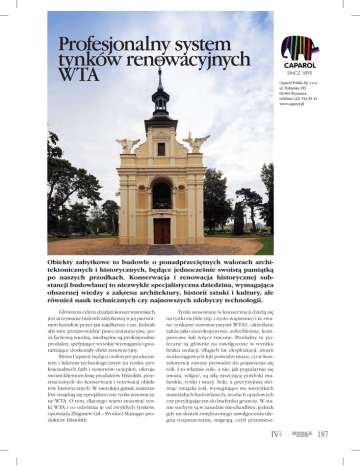 Profesjonalny system tynków renowacyjnych WTA Caparol Polska Sp. z o.o. ul. Puławska 393 02-801 Warszawa infolinia (22) 544 20 44 www.caparol.pl Obiekty zabytkowe to budowle o ponadprzeciętnych walorach architektonicznych i historycznych, będące jednocześnie swoistą pamiątką po naszych przodkach. Konserwacja i renowacja historycznej substancji budowlanej to niezwykle specjalistyczna dziedzina, wymagająca obszernej wiedzy z zakresu architektury, historii sztuki i kultury, ale również nauk technicznych czy najnowszych zdobyczy technologii. Tynki stosowane w konserwacji dzielą się na tynki zwykłe (np. czysto wapienne) i te zwane tynkami renowacyjnymi WTA1, określane także jako szerokoporowe, solochłonne, kompresowe lub wręcz tracone. Produkty te polecane są głównie na zawilgocone w wyniku braku izolacji, długich lat eksploatacji, awarii wodociągowych lub powodzi muru, co w konsekwencji zawsze prowadzi do pojawienia się soli. I to właśnie sole, a nie, jak popularnie się uważa, wilgoć, są siłą niszczącą powłoki malarskie, tynki i mury. Sole, a precyzyjniej mówiąc związki soli, występujące we wszystkich materiałach budowlanych, wodach opadowych czy przylegającym do budynku gruncie. W stanie suchym są w zasadzie nieszkodliwe, jednak gdy na skutek zwiększonego zawilgocenia ulegną rozpuszczeniu, migrują, czyli przemiesz- IV 2014 Głównym celem działań konserwatorskich jest utrzymanie budowli zabytkowej w jej pierwotnym kształcie przez jak najdłuższy czas. Jednak aby móc przeprowadzić prace restauracyjne, poza fachową wiedzą, niezbędne są profesjonalne produkty, spełniające wysokie wymagania i gwarantujące doskonały efekt renowacyjny. Firma Caparol, będąca czołowym producentem i liderem technologicznym na rynku profesjonalnych farb i systemów ociepleń, oferuje swoim klientom linię produktów Histolith, przeznaczonych do konserwacji i renowacji obiektów historycznych. W szerokiej gamie materiałów znajdują się specjalistyczne tynki renowacyjne WTA. O tym, dlaczego warto stosować tynki WTA i co odróżnia je od zwykłych tynków, opowiada Zbigniew Gil – Product Manager produktów Histolith. RENOWACJE I ZABYTKI 187 czają się wraz z wodą ku powierzchni, gdzie wilgoć odparowuje. Podczas wysychania następuje proces krystalizacji, w efekcie którego kryształy soli wielokrotnie zwiększają swoją objętość i niszczą mechanicznie powłoki malarskie i tynkarskie. Stosowanie tradycyjnych materiałów wykończeniowych (w tym tynków gipsowych) na starych murach nie daje właściwych efektów końcowych i najczęściej wiąże się z koniecznością przeprowadzenia kolejnego remontu. W takim przypadku nie pomogą nawet wysokie nakłady na dodatkową izolację czy osuszenie obiektu, a mury nadal pozostaną zawilgocone. Powyżej opisane przypadki stały się istotnym impulsem do wprowadzenia regulacji i standaryzacji pojęcia tynku renowacyjnego. Ostatecznie, niemiecka organizacja naukowo-techniczna wydała instrukcję oznaczoną numerem WTA-2-2-91, w której określono szczegółowe wymagania techniczne oraz kryteria kontroli tynków renowacyjnych. Zgodnie z instrukcją, tynk renowacyjny WTA, bezwzględnie musi posiadać poniższe właściwości: • wysoką dyfuzyjność, • wysoką porowatość, • pory połączone ze sobą kapilarami. Co więcej, regulacje WTA bardzo precyzyjnie wskazują wytyczne oraz zalecenia projektowania i stosowania tynków renowacyjnych. Kluczowe znaczenie mają prace przygotowawcze, podczas których wykonuje się niezbędne badania laboratoryjne, pozwalające na dokładną ocenę podłoża i dobór odpowiedniej technologii. Jest to najważniejszy etap prac, od którego zależy powodzenie dalszej renowacji. Caparol Polska przykłada szczególną uwagę, by proces ten przebiegał w sposób kompleksowy, skrupulatny i zgodny z wytycznymi WTA. Dobór właściwej technologii możemy podzielić na następujące etapy: 1. Badanie zasolenia Instrukcja WTA 2-2-91 wyraźnie określa sposób stosowania tynków renowacyjnych w zależności od stopnia zasolenia obiektu. Dobór odpowiednich grubości tynków jest bowiem uzależniony od wielu czynników, m.in. od rodzaju soli (chlorki, siarczki, azotany) i od ilości tych soli. Określenie zasolenia ma kluczowe znaczenia dla całego, późniejszego procesu renowacyjnego. 2. Dobór technologii Badając zasolenie podłoża, Caparol Polska korzysta z własnego laboratorium. Dysponując wynikami przeprowadzonej ekspertyzy, jesteśmy w stanie bardzo precyzyjnie określić ilość niezbędnych warstw, ich grubość oraz sposób aplikacji systemu tynków WTA na konkretnym obiekcie. RENOWACJE I ZABYTKI IV 2014 188 3. Wykonawstwo Na bazie przeprowadzonych badań możemy określić właściwą technologię renowacyjną. Jednak, aby uzyskać oczekiwany efekt końcowy, niezbędne jest profesjonalne wykonawstwo. I tu po raz kolejny wiele zależy od fachowego wsparcia, udzielanego przez producenta materiałów budowlanych. Caparol Polska jako świadomy producent, dokłada szczególnych starań, by swoim klientom oferować kompleksowe i profesjonalne doradztwo techniczne. Nasi eksperci udzielają fachowej porady na każdym etapie wykonawczym. Dzięki temu, każda realizacja to profesjonalnie przeprowadzony, kompleksowy proces renowacyjny, dający gwarancję znakomitego efektu końcowego. Więcej o profesjonalnych tynkach renowacyjnych WTA znaleźć można na www.histolith.pl System tynków renowacyjnych Caparol: 1. CT Vorspritz WTA 2. CT PorengrundPutz WTA 3. CT RAPID Sanierputz WTA Tynki renowacyjne Caparol z dodatkiem trasu: 1. Histolith Trass Vorspritz 2. Histolith Trass Porenputz 3. Histolith Trass Sanierputz Opracował: Zbigniew Gil Product Manager, Caparol sp. z o.o. Opracowanie redakcyjne: Katarzyna Jaworska Fotografie: Caparol Polska 1. W celu unormowania i standaryzacji pojęcia tynku renowacyjnego niemiecka organizacja Naukowo-Techniczna Grupa Robocza ds. Utrzymania B