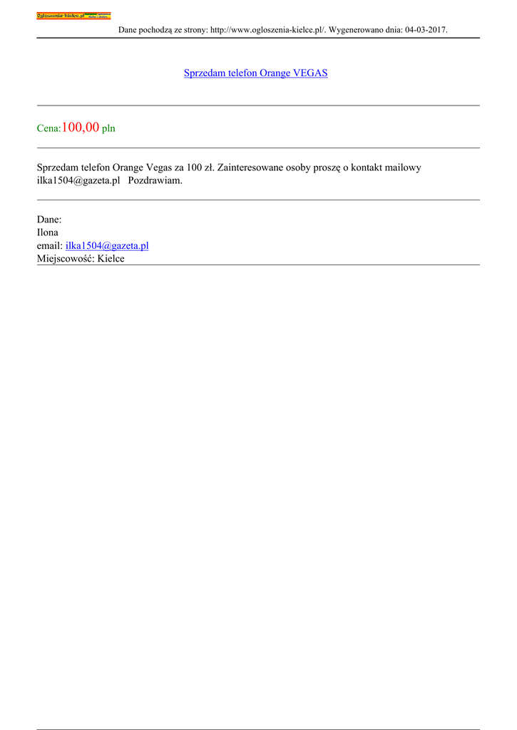 Dane pochodzą ze strony: http://www.ogloszenia-kielce.pl/. Wygenerowano dnia: 04-03-2017. Sprzedam telefon Orange VEGAS Cena:100,00 pln Sprzedam telefon Orange Vegas za 100 zł. Zainteresowane osoby proszę o kontakt mailowy [email protected] Pozdrawiam. Dane: Ilona email: [email protected] Miejscowość: Kielce