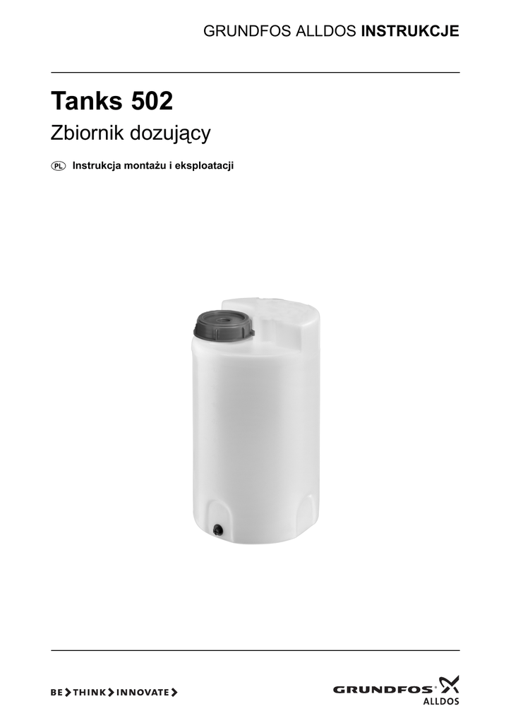 GRUNDFOS ALLDOS INSTRUKCJE Tanks 502 Zbiornik dozujący Instrukcja montażu i eksploatacji 2 SPIS TREŚCI Strona 1. 1.1 Wskazówki ogólne Dokumentacja serwisowa 3 3 2. Dane instalacyjne 4 3. Szkic montażowy 4 4. 4.1 Przeznaczenie Gwarancja 5 5 5. 5.1 5 5.6 5.7 Bezpieczeństwo Oznaczenie wskazówek bezpieczeństwa w niniejszym podręczniku Kwalifikacje i szkolenie personelu Zagrożenia wynikające z nieprzestrzegania wskazówek bezpieczeństwa Praca zgodna z zasadami bezpieczeństwa Wskazówki bezpieczeństwa dotyczące prac przeglądowych i montażowych Samowolna przebudowa i dozwolone części zamienne Nieprawidłowa obsługa 6. 6.1 6.2 6.2.1 6.3 6.4 6.5 6.6 6.7 Opis produktu i akcesoria Opis ogólny Dane techniczne Ciężar Wersje zbiornika Numery produktów Zmontowana stacja dozująca ze zbiornikiem Montaż pompy dozującej i mieszadła Rysunki wymiarowe 7. 7.1 7.2 Transport i składowanie Rozpakowanie Składowanie 11 11 11 8. 8.1 8.2 Instalacja Wskazówki ogólne Kontrola szczelności 11 11 11 9. Uruchomienie i obsługa 11 10. Konserwacja 11 11. 11.1 11.2 11.3 11.4 11.5 11.6 11.7 11 11 11 11 12 12 13 11.8 11.9 Akcesoria Wanny wyłapujące Płytka adaptacyjna Mieszalnik ręczny z PCW Mieszadło elektryczne Boczne urządzenie pobierające Zawór spustowy R 3/4" Zawór napowietrzający / odpowietrzający zbiornik dozujący Zestaw napełniający Lej rozpuszczający 12. Utylizacja 14 5.2 5.3 5.4 5.5 5 5 Ostrzeżenie Niniejsza instrukcja montażu i eksploatacji jest również dostępna na stronie internetowej www.Grundfosalldos.com. Przed przystąpieniem do instalacji należy przeczytać niniejszą instrukcję montażu i eksploatacji. Instalacja i eksploatacja musi się odbywać zgodnie z przepisami lokalnymi oraz zasadami techniki. 1. Wskazówki ogólne 5 5 W niniejszej instrukcji montażu i eksploatacji zawarto wszelkie informacje niezbędne do uruchomienia i eksploatacji niżej wymienionych zbiorników dozujących serii 502. 5 5 5 W celu uzyskania dalszych informacji lub w przypadku wystąpienia problemów, które nie zostały szczegółowo opisane w podręczniku, należy zwrócić się do najbliższego przedstawicielstwa firmy Grundfos Alldos. 6 6 6 6 6 7 7 8 9 1.1 Dokumentacja serwisowa W celu uzyskania dalszych informacji należy zwrócić się do najbliższego przedstawicielstwa firmy Grundfos Alldos. 13 14 14 3 2. Dane instalacyjne RADA Po uruchomieniu należy wpisać następujące dane. Dane te pomogą Państwu i partnerowi serwisowemu firmy Grundfos Alldos w późniejszym wprowadzeniu ustawień instalacji. Użytkownik: Nr klienta firmy Grundfos Alldos: Nr zlecenia: Nr zamówienia: Nr seryjny: Data uruchomienia: Miejsce instalacji: Zastosowanie do: 3. Szkic montażowy 4 4. Przeznaczenie Zbiorniki dozujące firmy Grundfos Alldos serii 502 są przeznaczone do wykorzystania jako zasobniki do dozowania środków chemicznych zgodnie z opisem zawartym w niniejszej instrukcji. UWAGA Inne zastosowania są niedozwolone i niedopuszczalne. Firma Grundfos Alldos nie ponosi odpowiedzialności za szkody powstałe w wyniku niewłaściwego użycia. 5.3 Zagrożenia wynikające z nieprzestrzegania wskazówek bezpieczeństwa Nieprzestrzeganie wskazówek bezpieczeństwa może stanowić zagrożenie dla personelu, środowiska naturalnego i pompy. Nieprzestrzeganie wskazówek bezpieczeństwa może doprowadzić do utraty wszelkich roszczeń z tytułu odpowiedzialności za szkody. Nieprzestrzeganie wskazówek bezpieczeństwa może spowodować następujące zagrożenia: • zaprzestanie działania istotnych funkcji urządzenia; 4.1 Gwarancja • Gwarancja obowiązuje zgodnie z naszymi ogólnymi warunkami sprzedaży i dostawy tylko w przypadku spełnienia następującego warunku: szkody osobowe w wyniku oddziaływań elektrycznych, mechanicznych i chemicznych; • szkody w środowisku naturalnym w wyniku ulatniania się substancji szkodliwych dla zdrowia. • zbiornik dozujący był użytkowany jedynie zgodnie z odpowiednimi wskazówkami. 5. Bezpieczeństwo W niniejszej instrukcji zawarto wskazówki ogólne, których należy przestrzegać w trakcie instalacji i obsługi zbiornika dozującego. Dlatego też przed przystąpieniem do instalacji i uruchomienia urządzenia personel techniczny i odpowiednio przeszkolony personel wykwalifikowany bądź odpowiednio przeszkoleni operatorzy winni starannie przeczytać niniejszą instrukcję, a sama instrukcja winna być zawsze dostępna w miejscu instalacji. Przestrzegać należy nie tylko wskazówek bezpieczeństwa wymienionych w rozdziale „Bezpieczeństwo”, lecz również wszystkich specyficznych wskazówek bezpieczeństwa wymienionych w innych rozdziałach. 5.1 Oznaczenie wskazówek bezpieczeństwa w niniejszym podręczniku Nieprzestrzeganie wskazówek bezpieczeństwa lub innych przepisów wymienionych w niniejszej instrukcji może spowodować szkody osobowe i uszkodzenia zbiorników dozujących. Wskazówki bezpieczeństwa i inne wskazówki oznaczone są za pomocą następujących symboli: Ostrzeżenie Nieprzestrzeganie tej wskazówki bezpieczeństwa może spowodować szkody osobowe! UWAGA Nieprzestrzeganie tej wskazówki bezpieczeństwa może doprowadzić do wadliwego działania i szkód rzeczowych! RADA Wskazówki lub instrukcje, które ułatwiają pracę i zapewniają bezpieczną obsługę. Informacje umieszczone na zbiorniku dozującym zawsze muszą być utrzymywane w stanie dobrze czytelnym. 5.2 Kwalifikacje i szkolenie personelu Personel odpowiedzialny za obsługę, przeglądy i montaż winien być odpowiednio wykwalifikowany. Osoba odpowiedzialna za zakład winna dokładnie zdefiniować zakresy odpowiedzialności i poziomy kompetencji personelu oraz sposób nadzoru nad nim. Jeżeli personel nie dysponuje niezbędną wiedzą, należy go odpowiednio przeszkolić i poinstruować. Obowiązkiem osoby odpowiedzialnej za zakład jest zapewnienie, że personel zrozumie zawartość niniejszej instrukcji. 5.4 Praca zgodna z zasadami bezpieczeństwa Instrukcji be