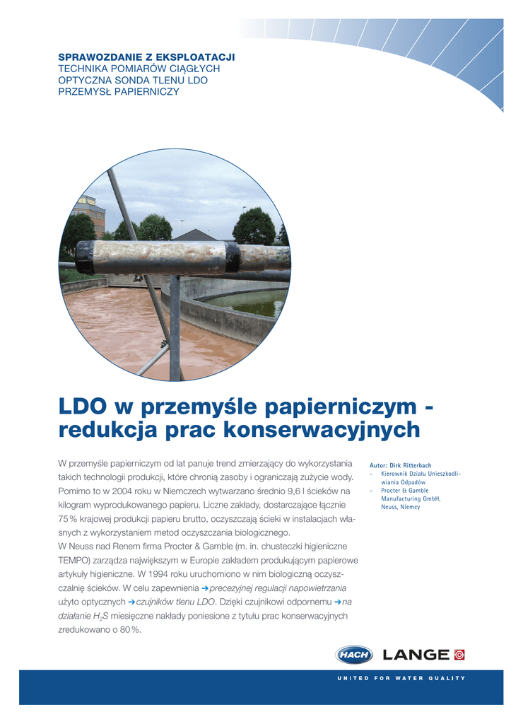 SPRAWOZDANIE Z EKSPLOATACJI TECHNIKA POMIARÓW CIĄGŁYCH OPTYCZNA SONDA TLENU LDO PRZEMYSŁ PAPIERNICZY LDO w przemyśle papierniczym redukcja prac konserwacyjnych W przemyśle papierniczym od lat panuje trend zmierzający do wykorzystania takich technologii produkcji, które chronią zasoby i ograniczają zużycie wody. Pomimo to w 2004 roku w Niemczech wytwarzano średnio 9,6 l ścieków na kilogram wyprodukowanego papieru. Liczne zakłady, dostarczające łącznie 75 % krajowej produkcji papieru brutto, oczyszczają ścieki w instalacjach własnych z wykorzystaniem metod oczyszczania biologicznego. W Neuss nad Renem firma Procter & Gamble (m. in. chusteczki higieniczne TEMPO) zarządza największym w Europie zakładem produkującym papierowe artykuły higieniczne. W 1994 roku uruchomiono w nim biologiczną oczyszczalnię ścieków. W celu zapewnienia ➔ precezyjnej regulacji napowietrzania użyto optycznych ➔ czujników tlenu LDO. Dzięki czujnikowi odpornemu ➔ na działanie H2S miesięczne nakłady poniesione z tytułu prac konserwacyjnych zredukowano o 80 %. Autor: Dirk Ritterbach - Kierownik Działu Unieszkodliwiania Odpadów - Procter & Gamble Manufacturing GmbH, Neuss, Niemcy LDO_PRZEMYSŁ PAPIERNICZY Regulacja napowietrzania prawidłowe parametry wyjściowe Ilustracja 1: Zbiornik obiegowy z sedymentacją końcową Oczyszczalnia biologiczna w firmie Procter & Gamble „Woda i substancje pomocnicze” — oto krótka i wyczerpująca odpowiedź na pytanie dotyczące strumienia ścieków doprowadzanego do oczyszczalni biologicznej pracującej w firmie Procter & Gamble w Neuss od 1994 roku. W ostatnich latach znacznie zredukowano ilość ścieków — zapobieganie jest bowiem dużo tańsze niż oczyszczanie i utylizacja. Woda doprowadzana jest ze studni, a utylizacja odbywa się we własnej oczyszczalni z połączonymi zbiornikami (zbiornik napowietrzania na zewnątrz, sedymentacja końcowa w środku) z odpływem bezpośrednio do Renu (oddalonego o ok. 450 m). Bezpośrednie odprowadzanie ścieków niesie ze sobą oczywiście dużą odpowiedzialność, a ponadto Państwowy Urząd ds. Ochrony Środowiska (StUA) w każdej chwili może przeprowadzić kontrolę bez uprzedzenia. Aby sprostać tym kontrolom, już w osadniku wstępnym szereg krat i sit oraz pomocnicze środki koagulujące na bazie polimerów zapewniają wstępne oczyszczanie. W „koagulatorze”, czyli odstojni- ku o pojemności 380 m3, ze strumienia ścieków usuwane są kłaczki i włókna papierowe po ich uprzedniej sedymentacji. Regulacja napowietrzania przez LDO W zbiorniku napowietrzania czujnik LDO już od dwóch i pół roku kontroluje stężenie tlenu i reguluje je za pomocą napowietrzaczy. Wartość zadana mieści się w zakresie od 1 do 4 mg/l — w zależności od oczyszczanych ścieków, których skład różni się zależnie od rodzaju produktów. Dzięki LDO o ponad 80% mniej prac konserwacyjnych Decyzja o zastosowaniu optycznego pomiaru tlenu nie była szczególnie trudna, ponieważ wcześniej używana elektroda membranowa miała częste przestoje w pracy i wymagała dużych nakładów prac konserwacyjnych. 10 – 12 godzin poświęcanych miesięcznie na czyszczenie i kalibrację zredukowano dzięki czujnikowi LDO do dwóch godzin na prace związane z czyszczeniem i kontrolą (ilustracja 4). Czujnik LDO Ilustracja 2: Czujnik tlenu LDO w użyciu Dane techniczne Oczyszczalnia biologiczna Uruchomienie Wydajność Technika procesu Pomiar tlenu Użytkowanie Kalibracja Czyszczenie i kontrola 1994 200 m3/h Oczyszczanie biologiczne ze zbiornikiem napowietrzania, sedymentacją końcową w środku, napowietrzaczami, 3,5 – 4 g/l suchej masy, regulacja tlenu przez czujnik LDO między 1 a 4 mg/l O2 LDO Od 2004 Nie dotyczy 1× w tygodniu, 2 h w miesiącu www.hach-lange.pl Ilustracja 3: Typowy wykres dziennego stężenia rozpuszczonego tlenu nie wymaga kalibracji. Wynikiem bezpośredniego porównania technologii membranowej z techniką optycznego pomiaru tlenu w tej instalacji jest oszczędność ponad 80 % czasu poświęcanego na konserwację. Na poprzednio stosowane elektrody niekorzystnie działała również obecność H2S i powstające wskutek tego liczne zarysowania membran: rzecz niespotykana w przypadku optycznej techniki pomiarowej, nie wykorzystującej wrażliwych membran. Na końcu widać znakomite efekty Bezpośrednie porównanie jakości wody z dopływu i odpływu oczyszczalni pokazuje wyraźną różnicę — z jednej strony mętna mieszanka składająca się z „wody, włókien papierowych i substancji pomocniczych”, a z drugiej — całkowicie przejrzysta ciecz (ilustracja 5). Stężenia końcowe oznaczanych parametrów również poświadczają dobrą jakość wody odpływowej. Droga i skomplikowana metoda oczyszczania wymaga niezawodnej regulacji napowietrzenia przez czujniki tlenu niewymagające konserwacji, a przede wszystkim — odporne na działanie H2S. Podsumowanie W przypadku biologicznego oczyszczania ścieków z przemysłu papierniczego stawia się szczególnie wysokie wymagania dotyczące pomiaru tlenu. Czujnik tlenu nie powinien wymagać dużego nakładu prac konserwacyjnych oraz musi być odporny na zanieczyszczenia, a przede wszystkim na H2S. Optyczny czujnik LDO w zakładach firmy Procter & Gamble w Neuss już od 2,5 roku udowadnia swoją przydatność również w tak nietypowych warunkach. Oprócz tego, że udało się wyeliminować wcześniej częste awarie, znacznie skrócił się również czas poświęcany na konserwację i kalibrację. Ilustracja 4: Miesięczny nakład prac konserwacyjnych w przypadku konwencjonalnego czujnika tlenu (z lewej) oraz LDO (z prawej) Ilustracja 5: Wystarczy porównać — próbki ścieków z początku i końca procesu Historia firmy Procter & Gamble w Neuss 1960 1962 Rozpoczęcie budowy Przekazanie do użytku i uruchomienie pierwszej maszyny papierniczej — produkcja chusteczek higienicznych 1972 Uruchomienie drugiej maszyny papierniczej — pro