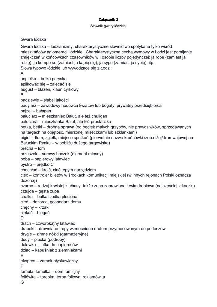 Załącznik 2 Słownik gwary łódzkiej Gwara łódzka Gwara łódzka – łodzianizmy, charakterystyczne słownictwo spotykane tylko wśród mieszkańców aglomeracji łódzkiej. Charakterystyczną cechą wymowy w Łodzi jest pomijanie zmiękczeń w końcówkach czasowników w I osobie liczby pojedynczej: ja robe (zamiast ja robię), ja kompe se (zamiast ja kąpię się), ja sype (zamiast ja sypię), itp. Słowa typowo łódzkie lub wywodzące się z Łodzi: A angielka – bułka paryska aplikować się – zalecać się august – błazen, klaun cyrkowy B badziewie – słabej jakości badylarz – zawodowy hodowca kwiatów lub bogaty, prywatny przedsiębiorca bajzel – bałagan bałuciarz – mieszkaniec Bałut, ale teŜ chuligan bałuciara – mieszkanka Bałut, ale teŜ prostaczka betka, betki – drobna sprawa (od bedłek małych grzybów, nie prawdziwków, sprzedawanych na targach na objętość, mierzonej miseczkami lub szklankami) bigiel – tłum, zgiełk, miejsce spotkań (pierwotnie nazwa krańcówki /zob.niŜej/ tramwajowej na Bałuckim Rynku – w pobliŜu duŜego targowiska) brecha – łom brzuszek – surowy boczek (element mięsny) boba – papierowy latawiec bystro – prędko C chechłać – kroić, ciąć tępym narzędziem cieć – kontroler biletów w środkach komunikacji miejskiej (w innych rejonach Polski oznacza dozorcę) czarne – rodzaj krwistej kiełbasy, takŜe zupa zaprawiana krwią drobiową (najczęściej z kaczki) cztujda – gęsta zupa chałka – bułka słodka pleciona cieć – dozorca, gospodarz domu chęchy – krzaki ciekać – biegać D drach – czworokątny latawiec drapoki – drewniane trepy wzmocnione drutem przymocowanym do podeszew drygle – zimne nóŜki (garmaŜeryjne) dudy – płucka (podroby) dulawka – lufka do papierosów dziad – kapuśniak z ziemniakami E ekspres – zamek błyskawiczny F famuła, famułka – dom familijny foliówka – torebka, torba foliowa, reklamówka G galancie – duŜo, ładnie, dobrze galanty – duŜy, ładny, dobry gołda – wódka J jechać do Rygi – wymiotować K kanar – kontroler biletów MPK klapitka – rodzaj kamienicy (utworzone od nazwiska Klapita, właściciela) kontrol – kontrola biletów w środkach komunikacji miejskiej krańcówka – pętla linii tramwajowej lub autobusowej kole godzina – około godziny kijowo – fatalnie od kija, którym dostawało się lanie kulosy – nogi L lebera – wątrobianka (wyrób garmaŜeryjny) leberka – kiełbasa pasztetowa M migawka – bilet okresowy komunikacji miejskiej N naród – zmiana znaczeniowa słowa, ograniczająca się do grupy np. z danej dzielnicy. P po prosty – często uŜywane, zamiast ?po prostu? praŜoki – potrawa z ziemniaków i mąki przylepka – piętka chleba (krańcowa) R rolwaga – wóz konny słuŜący do przewoŜenia złomu rzeźnik – sklep mięsny S schódki – typowo łódzkie określenie dla schodów złoŜonych tylko z kilku stopni siajowe – podłej jakości, niewiele warte (utworzone od nazwiska fabrykanta, produkującego na przełomie XIX i XX w. tkaniny miernej jakości ? Szai Rosenblatta) spinacz – spinka do włosów sładnie – łatwo, ładnie, dobrze sznytka – kromka chleba szten – latawiec z listew i bibuły T towar – tkanina trambambula – piłkarzyki tytka – papierowa torebka, kawałek papieru spiralnie zwinięty; opakowanie na cukierki; zapoŜyczenie z niemieckiego (die Tüte = torba), znane równieŜ na Śląsku i w poznańskiem Z zalewajka – zupa kartoflana z białym barszczem/ Ŝur ugotowany razem z kartoflami(ziemniakami) z miasta Łodzi – konstrukcja składniowa przestrzegana przez łodzian starszej daty, zamiast wyraŜenia z Łodzi – nasuwającego skojarzenie ze złodziejem. ś Ŝulik – chleb turecki z rodzynkami