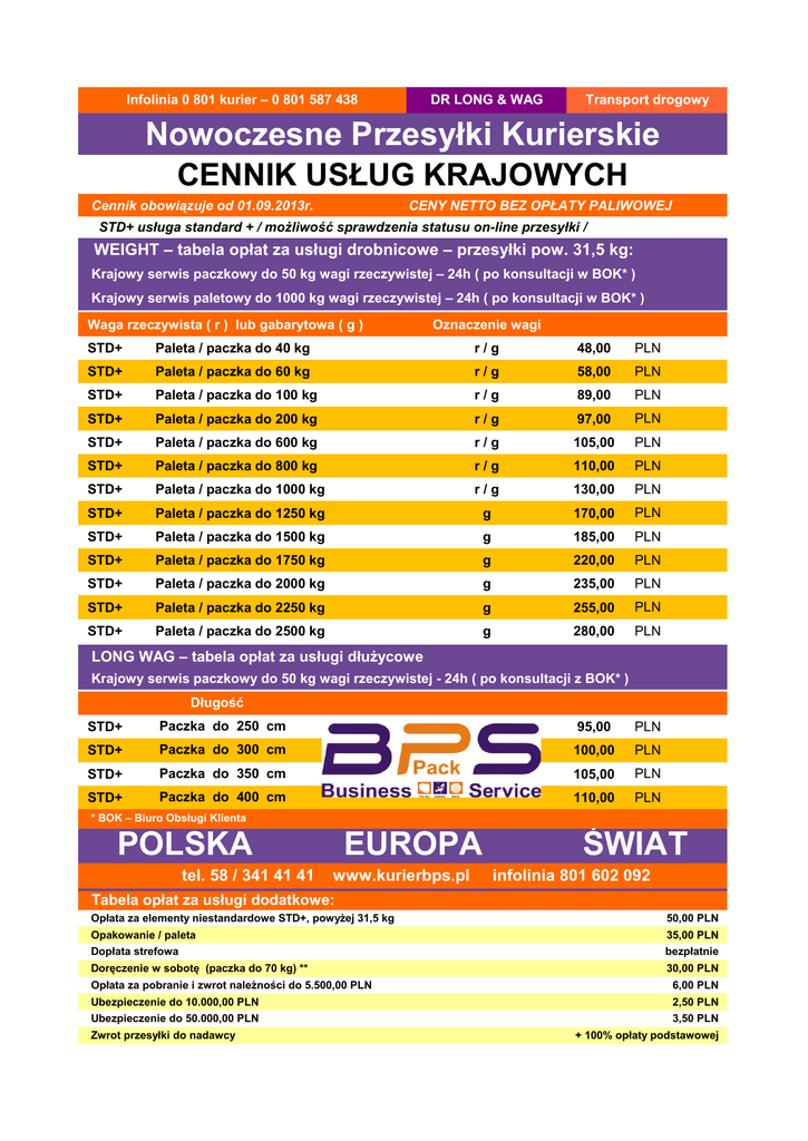 Infolinia 0 801 kurier – 0 801 587 438 DR LONG & WAG Transport drogowy Nowoczesne Przesyłki Kurierskie CENNIK USŁUG KRAJOWYCH Cennik obowiązuje od 01.09.2013r. CENY NETTO BEZ OPŁATY PALIWOWEJ STD+ usługa standard + / możliwość sprawdzenia statusu on-line przesyłki / WEIGHT – tabela opłat za usługi drobnicowe – przesyłki pow. 31,5 kg: Krajowy serwis paczkowy do 50 kg wagi rzeczywistej – 24h ( po konsultacji w BOK* ) Krajowy serwis paletowy do 1000 kg wagi rzeczywistej – 24h ( po konsultacji w BOK* ) Waga rzeczywista ( r ) lub gabarytowa ( g ) Oznaczenie wagi STD+ Paleta / paczka do 40 kg r/g 48,00 PLN STD+ Paleta / paczka do 60 kg r/g 58,00 PLN STD+ Paleta / paczka do 100 kg r/g 89,00 PLN STD+ Paleta / paczka do 200 kg r/g 97,00 PLN STD+ Paleta / paczka do 600 kg r/g 105,00 PLN STD+ Paleta / paczka do 800 kg r/g 110,00 PLN STD+ Paleta / paczka do 1000 kg r/g 130,00 PLN STD+ Paleta / paczka do 1250 kg g 170,00 PLN STD+ Paleta / paczka do 1500 kg g 185,00 PLN STD+ Paleta / paczka do 1750 kg g 220,00 PLN STD+ Paleta / paczka do 2000 kg g 235,00 PLN STD+ Paleta / paczka do 2250 kg g 255,00 PLN STD+ Paleta / paczka do 2500 kg g 280,00 PLN LONG WAG – tabela opłat za usługi dłużycowe Krajowy serwis paczkowy do 50 kg wagi rzeczywistej - 24h ( po konsultacji z BOK* ) Długość STD+ Paczka do 250 cm 95,00 PLN STD+ Paczka do 300 cm 100,00 PLN STD+ Paczka do 350 cm 105,00 PLN STD+ Paczka do 400 cm 110,00 PLN * BOK – Biuro Obsługi Klienta POLSKA tel. 58 / 341 41 41 EUROPA www.kurierbps.pl ŚWIAT infolinia 801 602 092 Tabela opłat za usługi dodatkowe: Opłata za elementy niestandardowe STD+, powyżej 31,5 kg 50,00 PLN Opakowanie / paleta 35,00 PLN Dopłata strefowa bezpłatnie Doręczenie w sobotę (paczka do 70 kg) ** 30,00 PLN Opłata za pobranie i zwrot należności do 5.500,00 PLN 6,00 PLN Ubezpieczenie do 10.000,00 PLN 2,50 PLN Ubezpieczenie do 50.000,00 PLN Zwrot przesyłki do nadawcy 3,50 PLN + 100% opłaty podstawowej Przeadresowanie przesyłki + 100% opłaty podstawowej (zgodnie z tabelą kodów pocztowych) Zmiana płatnika 15,00 PLN za każdą przesyłkę Transport bezpośredni cena ustalana z BOK* Zwrot potwierdzonych dokumentów 8,00 PLN Potwierdzenie doręczenia w formie ustnej bezpłatnie Potwierdzenie doręczenia w formie innej niż ustna: Kopia potwierdzonego LP 12,00 PLN Telefonicznie, fax, sms 6,00 PLN Pisemne potwierdzenie doręczenia po nadaniu Telefoniczne przyjecie zlecenia odbioru przesyłki 18,00 PLN 5,00 PLN Informacja dla Odbiorcy przed doręczeniem PDI 5,00 PLN Opłata za eAwizo - informacja o nieskutecznej próbie doręczenia 3,00 PLN Faktura w innej postaci niż w wersji e-mail PDF, duplikat faktury 5,00 PLN Charakterystyka usług Terminy doręczeń: Standardowo przesyłki doręczane są następnego dnia roboczego po nadaniu. W przypadku niektórych obszarów określonych za pomocą kodów pocztowych dostępnych w BOK* terminy doręczeń wynoszą do 2 dni roboczych. Terminowe doręczenia nie są realizowane dla paczek powyżej 50 kg i palet (dotyczy również sobót). Odbiór i doręczenie: Przesyłki paczkowe o wadze od 31,5 kg i palety odbierane i doręczane są w systemie „burta-burta”. Za czynności załadunkowe i rozładunkowe odpowiada klient. Pobranie i zwrot należności: Maksymalna kwota pobrania wynosi 11.000,00 PLN; w przypadku kwoty przekraczającej 5.500,00 PLN odbiorca zobowiązany jest do osobistego odbioru przesyłki w przedstawicielstwie firmy. Kwota pobrania zwracana jest w ciągu 10 dni roboczych od daty doręczenia przesyłki. Każda przesyłka za pobraniem podlega dodatkowemu ubezpieczeniu. Definicja elementu niestandardowego: Elementy na paletach o wymiarach podstawy przekraczających 120 dł x 80 szer cm; paleta na której towar wykracza poza jej obrys; element niespaletyzowany oklejony naklejkami DHL "GÓRA" oraz "UWAGA! NST"; element niespaletyzowany zawierający substancje płynne (beczki, karnistry, wiadra itp.): element umieszczony na palecie, ale do niej nieprzymocowany (np. za pomocą folii, taśm bindujących, śrub, itp. ): element niespaletyzowany o wymiarach większych niż 140 x 60 x 60 cm; element niespaletyzowany o kształcie okrągłym, cylindrycznym bądź owalnym lub o nieregularnych kształtach z wystającymi elementami; elementy nienadające się ze względu na swoją specyfikę spaletyzować np. urządzenia na kółkach. Wykaz towarów wyłączonych z przewozu dostępny w oddziałach firmy BPS i na www.kurierbps.pl Waga i wymiary: Każdy element w przesyłce powinien spełniać następujące kryteria:długość paczki do 200 cm; suma wymiarów do 300 cm (dł.+szer.+wys); limit wagowy - element nie umieszczony na palecie max 50 kg. Maksymalne wymiary elementu umieszczonego na palecie 200 cm długość, 200 cm szerokość i maksymalna wysokość elementu na palecie 210 cm. Waga przestrzenna przesyłki liczona jest według przelicznika 1m3=250kg. Paleta euro powyżej 80 cm wysokości liczona jest z wagi gabarytowej np. do 160 cm wysokości jako 400 kg, do 200 cm wysokości jako 600 kg. Obowiązuje zasada wyboru wyższej wagi przesyłki – rzeczywistej, przeliczeniowej przestrzennej lub dłużycowej. Waga rzeczywista lub przestrzenna przesyłki nie może przekraczać 2500 kg. Nadawane do jednego Odbiorcy spaletyzowane przesyłki o wadze powyżej 2 500 kg albo przesyłki obejmujące więcej niż 5 palet mogą być obsługiwane na indywidualnych zasadach po uzgodnieniach z Działem Obsługi Klienta DHL Parcel. W przypadku nadania do jednego Odbiorcy przesyłek zawierających więcej niż 5 palet bez uprzedniego uzgodnienia z Działem Obsługi Klienta DHL Parcel, termin doręczenia każdej kolejnej przesyłki ponad pierwszą przesyłkę wydłuża się: (a) jeśli doręczenie powinno nastąpić kolejnego dnia roboczego – o jeden dzień roboczy lub więcej, zależnie od ilości nadanych przesyłek; (b) jeśli doręczenie powinno nastąpić w ciągu dwóch dni roboczych – o dwa dni robocze lub ich w