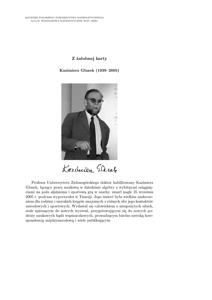 ROCZNIKI POLSKIEGO TOWARZYSTWA MATEMATYCZNEGO Seria II: WIADOMOŚCI MATEMATYCZNE XLIV (2008) Z żałobnej karty Kazimierz Głazek (1939–2005) Profesor Uniwersytetu Zielonogórskiego doktor habilitowany Kazimierz Głazek, łączący pracę naukową w dziedzinie algebry z wybitnymi osiągnięciami na polu alpinizmu i sportową grą w szachy, zmarł nagle 25 września 2005 r. podczas wypoczynku w Tunezji. Jego śmierć była wielkim zaskoczeniem dla rodziny i szerokich kręgów znajomych z różnych sfer jego kontaktów zawodowych i sportowych. Wydawał się człowiekiem o niespożytych siłach, stale spieszącym do nowych wyzwań, przygotowującym się do nowych podróży naukowych bądź wspinaczkowych, prowadzącym bardzo szeroką korespondencję międzynarodową i wiele publikującym. 140 Z żałobnej karty Kazimierz Bolesław Jacek Głazek urodził się 20 lutego 1939 r. w Warszawie jako drugi syn Marii z Doborzyńskich i Stanisława Głazków. Rodzice byli studentami zoologii na Uniwersytecie Warszawskim i wiązali koniec z końcem dzięki pomocy rodziny. Ojciec był zatrudniany dorywczo w Państwowym Muzeum Zoologicznym przy porządkowaniu zbiorów chrząszczy, bądź w Państwowym Instytucie Geologicznym do prac terenowych i bibliotecznych, opublikował jedyną pracę naukową w r. 19391, zaś matka od roku była zatrudniona jako asystent w SGGW. Ta względna stabilizacja została utracona wraz z wybuchem wojny. Mieszkanie w Warszawie zostało zniszczone we wrześniu, a ojciec, który wyruszył na wschód na apel płk. Umiastowskiego2 , został aresztowany przez sowietów w Brześciu nad Bugiem, lecz jako krótkowidz (Kazik odziedziczył tę wadę wzroku po ojcu) niezdolny do służby wojskowej został wypuszczony w listopadzie, zgodnie z drugim układem Mołotow–Ribbentrop3 , gdyż urodził się i mieszkał na zachód od Bugu. Wrócił chory na gruźlicę do rodziców w Kielcach, gdzie zmarł w r. 1941. Matka ukończyła kursy pielęgniarskie i pracowała w wiejskich ośrodkach zdrowia we Mniowie i w Daleszycach pod Kielcami. Po pacyfikacji i spaleniu Daleszyc dotrwała końca wojny z synami w Bukowinie Tatrzańskiej, gdzie Kazimierz rozpoczął naukę w Szkole Powszechnej. Matka w roku 1945 została zatrudniona jako starszy asystent w Uniwersytecie Wrocławskim, a Kazik kontynuował naukę w szkołach Bukowiny, Kielc i Wrocławia, gdyż matka korzystała z pomocy dziadków i zwykle, dla spokoju podczas pracy, tylko jeden syn przebywał z nią we Wrocławiu. Kazik uzyskał maturę w roku 1957 w IV Państwowej Szkole Ogólnokształcącej we Wrocławiu i rozpoczął studia matematyczne na Uniwersytecie Wrocławskim, które ukończył w roku 1962. Jako wyróżniający się student został zatrudniony na stanowisku asystenta w Instytucie Matematycznym Uniwersytetu Wrocławskiego, gdzie wkrótce awansował na starszego asystenta, a po doktoracie w roku 1969 na adiunkta. Podczas nauki w szkole średniej i studiów grał zawodniczo w szachy w AZS Wrocław, gdzie osiągnął I kategorię szachową i finał mistrzostw Polski juniorów. W czasie studiów rozpoczął też wyczynowe uprawianie taternictwa, głównie powierzchniowego, choć mógł się również poszczycić znaczącym osiągnięciem w taternictwie jaskiniowym. Jako asystent K. Głazek prowadził różnorodne ćwiczenia, głównie z algebry, 1 Por. J. Głazek, Głazek Stanisław (1908–1941), [w:] Feliksiak S. (red.) Słownik Biologów Polskich, PWN Warszawa 1987: 183–184. 2 Był to apel radiowy przed zamknięciem pierścienia oblężenia Warszawy „do wszystkich mężczyzn zdolnych do noszenia broni”, a nie uczestniczących w obronie stolicy, o wyjście na wschód i wstąpienie do jednostek wojskowych formowanych za Bugiem (np. armia „Polesie” gen. F. Kleberga). 3 Był to układ zawarty w listopadzie 1939, ustalający granice wpływów Rzeszy i Związku Radzieckiego na terenach zagarniętych jesienią i zawierający klauzulę, że Polacy, do których ani naziści, ani sowieci nie mieli podejrzeń, mogą wracać do miejsc zamieszkania. Z żałobnej karty 141 a jako adiunkt wykłady z matematyki dla różnych wydziałów i studiów Uniwersytetu Wrocławskiego oraz przez dwa lata w Wyższej Szkole Oficerskiej we Wrocławiu4. Pracę naukową rozpoczął jeszcze będąc studentem – dwukrotnie, w latach 1960 i 1962, jego prace były wyróżniane przez PTM III nagrodą w Konkursie im. J. Marcinkiewicza. Po uzyskaniu asystentury prowadził badania w dziedzinie algebry pod kierunkiem prof. Edwarda Marczewskiego, który był promotorem jego rozprawy doktorskiej Niezależność względem rodziny odwzorowań w algebrach ogólnych obronionej 27 maja 1969 roku w Instytucie Matematycznym Uniwersytetu Wrocławskiego, a opublikowanej dwa lata później [1]. Rozprawę habilitacyjną Morfizmy systemów algebraicznych bez wyróżnionych działań podstawowych [3] przedstawił w Instytucie Matematyki Politechniki Warszawskiej w roku 1991. Po uzyskaniu stopnia doktora habilitowanego (1992) został zatrudniony od 1 października 1993 na stanowisku profesora nadzwyczajnego w Instytucie Matematyki Wydziału Podstawowych Problemów Techniki w Wyższej Szkole Inżynierskiej w Zielonej Górze, gdzie pracował do końca życia, podczas gdy ranga uczelni stopniowo rosła – w roku 1996 stała się Politechniką Zielonogórską, a w roku 2001, po połączeniu z Wyższą Szkołą Pedagogiczną im. Tadeusza Kotarbińskiego, Uniwersytetem Zielonogórskim. K. Głazek w roku 2003 wypromował dwoje doktorów (J. Skowronek-Kaziów i S. Niwczyk), a trzecia rozprawa (A. M. Chwastyk) w chwili jego śmierci była na ukończeniu. Kazimierz Głazek był naczelnym redaktorem Discussiones Mathematicae – General Algebra and Applications od założenia tej serii czasopisma w roku 2000, poprzednio zaś, w latach 1995–1999, redaktorem odpowiedzialnym za część algebraiczną Discussiones Mathematicae – Algebra and Stochastic Methods5, był też członki