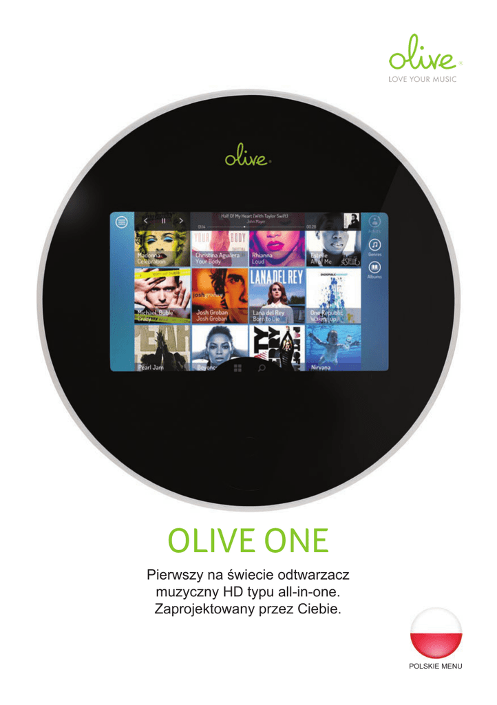 OLIVE ONE Pierwszy na świecie odtwarzacz muzyczny HD typu all-in-one. Zaprojektowany przez Ciebie. POLSKIE MENU Teraz wszyscy razem Olive ONE jest rozwiązaniem stworzonym przez ludzi dla ludzi. Rozwój ONE, wspierany przez społeczność i oparty o otwartą architekturę, jest kierowany przez melomanów, artystów i deweloperów aplikacji na całym świecie. Naszą misją jest zapewnienie absolutnie najlepszego wrażenia muzycznego, jakie można osiągnąć, w przystępnej cenie. Wzywamy miłośników muzyki na całym świecie. Niech dźwięk nas połączy! Wszystko w jednym. Odtwarzaj całą muzykę przy pomocy ekranu dotykowego z prostym interfejsem. Mamy na myśli CAŁĄ Twoją muzykę. Pliki MP3, FLAC, ALAC, WAV, AIFF i iTunes. Usługi strumieniowania, z których korzystasz, jak Spotify, Pandora i YouTube. Usługi w chmurze. Wszystko sterowane przez Twojego iPhona, iPada, urządzenie z Android lub bezpośrednio przez ekran dotykowy ONE. Podłącz głośniki i gotowe. Inteligentny. Społeczny. Otwarty. Oparty o nowy ultraszybki system operacyjny ONE Music. Olive ONE automatycznie nauczy się Twojego gustu muzycznego i zintegruje się z Twoimi sieciami społecznościowymi. Użycie otwartego kodu otwiera świat możliwości nowych aplikacji muzycznych i interakcji z ulubionymi artystami. Innymi słowy, ONE jest niesamowity, a będzie jeszcze lepszy. Niewiarygodny dźwięk. Od dawna ukochany przez audiofilów, Olive oferuje miłośnikom muzyki na całym świecie swoją nagradzaną technologię dźwięku HD. Wyposażony w zaawansowany przetwornik C/A 32-bit/384kHz Burr-Brown oraz podwójne wzmacniacze HD, Olive ONE zapewni doskonałą jakość Twojej ulubionej muzyce. ONE + ONE + ONE... Umieść ONE w kilku pomieszczeniach i odtwarzaj w nich te same lub różne piosenki. Wszystko sterowane bezprzewodowo z Twojego ONE, smartfona lub tabletu. Zaprojektowany przez Ciebie Wybraliśmy piękną formę oraz wykonanie z najlepszej jakości aluminium i szkła. Ty dopasujesz go do własnych preferencji. Wybierz dowolny kolor lub wzór, a nawet dostosuj tło pulpitu. To Twoja własna edycja limitowana. ONE jest produkowane ręcznie w USA. To dopiero rozgrzewka Olive ONE to tylko pierwszy krok na naszej drodze do zapewnienia użytkownikom domowym najlepszego możliwego odbioru muzyki. Pracujemy już nad innymi wspaniałymi pomysłami m.in. systemem głośników ustawianych jeden na drugim, pięknymi modułami LED czy niewidocznym mocowaniem. Dołącz do nas, by je zrealizować. Przetwornik cyfrowo-analogowy HD Burr-Brown PCM5142 • 32-bit/384kHz • Zakres dynamiki / SNR: 112 dB • THD+N: - 93 dB @ - 1 dBFS • 8X nadpróbkowanie Wi-Fi (802.11a/b/g/n) • Obsługuje funkcję WPS • Certyfikat DLNA® • Odtwarzaj muzykę z Mac, PC, NAS (UPnP) • Multi-room (wymaga ONE dla każdego pomieszczenia) Podwójne wzmacniacze HD i DSP • 2 x 32W/kanał przy 8 Ohm, o wysokiej sprawności (92%) • 1 wzmacniacz na kanał, doskonała separacja kanałów • DSP z technologią PRISM (zgłoszenie patentowe) Bluetooth/Wi-Fi Direct™ • Strumieniowanie muzyki z urządzeń przenośnych • Podłącz bezprzewodowe słuchawki lub głośniki Wbudowany dysk twardy AV Opcjonalny Wyjścia Audio • 2.5” dysk twardy AV lub dysk SSD • Wyjście analogowe: wyjście głośnikowe • Od 500GB do 2.5TB (pozłacane 24k) • Cyfrowe: Wi-Fi CERTIFIED Miracast™ Serwis Olive Home Cloud • Bluetooth (A2DP) • Dostęp do muzyki z dowolnego miejsca na • Wi-Fi Direct™ świecie. • Dynamiczna kompresja: Strumieniowanie Wejścia Cyfrowe Audio w jakości Full HD (24-bit/192kHz) • Bluetooth (A2DP) • Wi-Fi: Miracast™, Direct™, DLNA/UPnP Środowisko • Zasilanie: Spełnia wymogi PWE Graficzny Interfejs Użytkownika (GUI) (0,5 W w trybie czuwania) • Wbudowany 7-calowy wyświetlacz LCD • Zgodny z RoHS z pojemnościowym ekranem dotykowym • Podlega recyklingowi (aluminium i szkło) • Interfejs TV poprzez Wi-Fi CERTIFIED Miracast™ Wymiary i waga • Darmowa aplikacja dla Apple® iPhone®, • Średnica: 9,0 cala (22.9 cm) iPad® i Android • Wysokość: 1,61 cala (4.1 cm) max • Waga: 2,7 kg (bez dysku twardego) Konsbud Hi-Fi Sp. z o.o. ul. Nowa 23, Stara Iwiczna, 05-500 Piaseczno tel. (22) 750-23-22, faks (22) 750-23-04, e-mail: [email protected], www.konsbud-hifi.pl