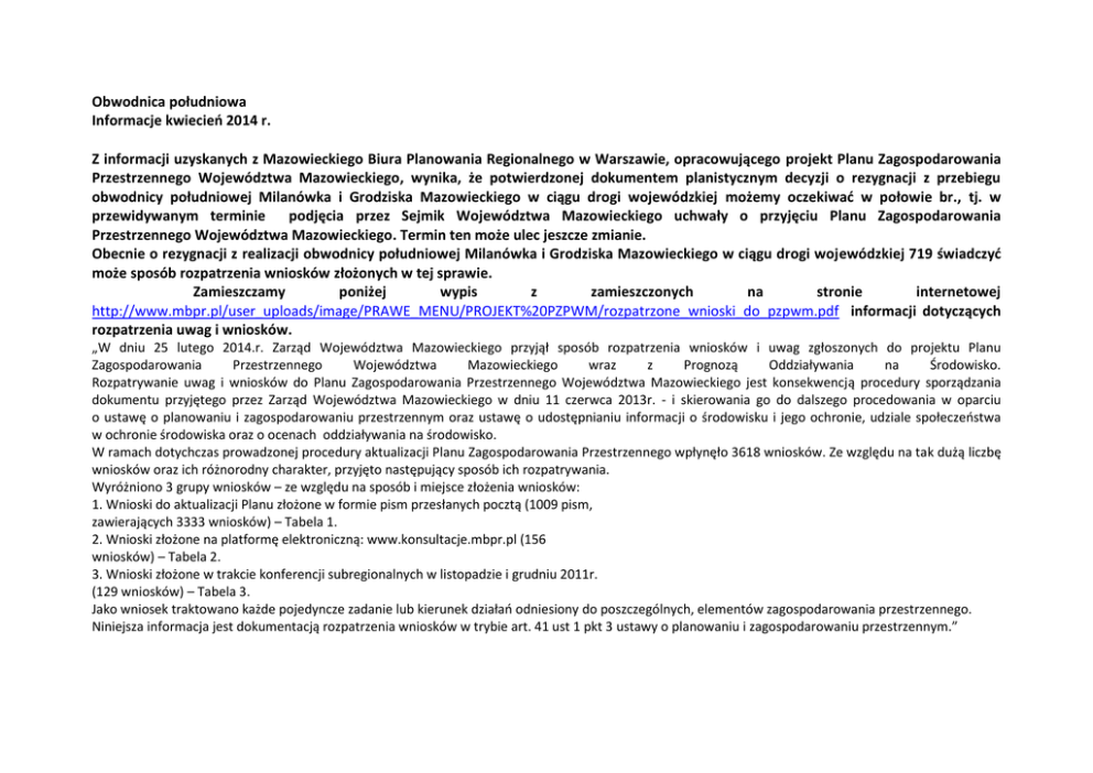 Obwodnica południowa Informacje kwiecień 2014 r. Z informacji uzyskanych z Mazowieckiego Biura Planowania Regionalnego w Warszawie, opracowującego projekt Planu Zagospodarowania Przestrzennego Województwa Mazowieckiego, wynika, że potwierdzonej dokumentem planistycznym decyzji o rezygnacji z przebiegu obwodnicy południowej Milanówka i Grodziska Mazowieckiego w ciągu drogi wojewódzkiej możemy oczekiwać w połowie br., tj. w przewidywanym terminie podjęcia przez Sejmik Województwa Mazowieckiego uchwały o przyjęciu Planu Zagospodarowania Przestrzennego Województwa Mazowieckiego. Termin ten może ulec jeszcze zmianie. Obecnie o rezygnacji z realizacji obwodnicy południowej Milanówka i Grodziska Mazowieckiego w ciągu drogi wojewódzkiej 719 świadczyć może sposób rozpatrzenia wniosków złożonych w tej sprawie. Zamieszczamy poniżej wypis z zamieszczonych na stronie internetowej http://www.mbpr.pl/user_uploads/image/PRAWE_MENU/PROJEKT%20PZPWM/rozpatrzone_wnioski_do_pzpwm.pdf informacji dotyczących rozpatrzenia uwag i wniosków. „W dniu 25 lutego 2014.r. Zarząd Województwa Mazowieckiego przyjął sposób rozpatrzenia wniosków i uwag zgłoszonych do projektu Planu Zagospodarowania Przestrzennego Województwa Mazowieckiego wraz z Prognozą Oddziaływania na Środowisko. Rozpatrywanie uwag i wniosków do Planu Zagospodarowania Przestrzennego Województwa Mazowieckiego jest konsekwencją procedury sporządzania dokumentu przyjętego przez Zarząd Województwa Mazowieckiego w dniu 11 czerwca 2013r. - i skierowania go do dalszego procedowania w oparciu o ustawę o planowaniu i zagospodarowaniu przestrzennym oraz ustawę o udostępnianiu informacji o środowisku i jego ochronie, udziale społeczeństwa w ochronie środowiska oraz o ocenach oddziaływania na środowisko. W ramach dotychczas prowadzonej procedury aktualizacji Planu Zagospodarowania Przestrzennego wpłynęło 3618 wniosków. Ze względu na tak dużą liczbę wniosków oraz ich różnorodny charakter, przyjęto następujący sposób ich rozpatrywania. Wyróżniono 3 grupy wniosków – ze względu na sposób i miejsce złożenia wniosków: 1. Wnioski do aktualizacji Planu złożone w formie pism przesłanych pocztą (1009 pism, zawierających 3333 wniosków) – Tabela 1. 2. Wnioski złożone na platformę elektroniczną: www.konsultacje.mbpr.pl (156 wniosków) – Tabela 2. 3. Wnioski złożone w trakcie konferencji subregionalnych w listopadzie i grudniu 2011r. (129 wniosków) – Tabela 3. Jako wniosek traktowano każde pojedyncze zadanie lub kierunek działań odniesiony do poszczególnych, elementów zagospodarowania przestrzennego. Niniejsza informacja jest dokumentacją rozpatrzenia wniosków w trybie art. 41 ust 1 pkt 3 ustawy o planowaniu i zagospodarowaniu przestrzennym.” ROZPATRZENIE WNIOSKÓW ZŁOŻONYCH DO PLANU ZAGOSPODAROWANIA PRZESTRZENNEGO WOJEWÓDZTWA MAZOWIECKIEGO Lp. Znak wniosku Wnioskodawca 1) WNIOSKI ZŁOŻONE W FORMIE PISM 1128 Plan1/PBWM/1/41 Urząd Miasta Milanówka Treść wniosku usunięcie z Planu południowej obwodnicy Grodziska Mazowieckiego i Milanówka Sposób uwzględnienia wniosku Uzasadnienie przyjęty Nie przewiduje się realizacji obwodnicy południowej Milanówka i Grodziska Mazowieckiego w ciągu drogi wojewódzkiej 719. Wobec niezwykle silnego oporu społecznego przed realizacją tej inwestycji zarządca drogi wojewódzkiej zamierza odstąpić od jej dalszego przygotowywania. Funkcje planowanego nowego przebiegu drogi wojewódzkiej 719 w części przejmie autostrada A2, droga ekspresowa S8 oraz planowane przedłużenie „Paszkowianki” wzdłuż A2 do węzła Grodzisk. przyjęty Nie przewiduje się realizacji obwodnicy południowej Milanówka i Grodziska Mazowieckiego w ciągu drogi wojewódzkiej 719. Wobec niezwykle silnego oporu społecznego przed realizacją tej inwestycji zarządca drogi wojewódzkiej zamierza odstąpić od jej dalszego przygotowywania. Funkcje planowanego nowego przebiegu drogi wojewódzkiej 719 w części przejmie autostrada A2, droga ekspresowa S8 oraz planowane przedłużenie „Paszkowianki” wzdłuż A2 do węzła Grodzisk. Nie przewiduje się realizacji obwodnicy południowej Milanówka i Grodziska Mazowieckiego w ciągu drogi wojewódzkiej 719. Wobec niezwykle silnego oporu społecznego przed realizacją tej inwestycji zarządca drogi wojewódzkiej zamierza odstąpić od jej dalszego przygotowywania. Funkcje planowanego nowego przebiegu 2) WNIOSKI ZŁOŻONE POPRZEZ PLATFORMĘ www.konsultacje.mbpr.pl 16 Plan1E/OF/9 Cezary Mikulski 18 Plan1E/OF/11 Emil Kośka wykreślenie z planu nowego przebiegu drogi 719 (obwodnicy południowej) przez południowe tereny Milanówka i analizę wariantu północnego, preferowanego przez władze i samorząd Milanówka oraz mieszkańców wykreślenie z planu nowego przebiegu drogi 719 (obwodnicy południowej) przez południowe tereny Milanówka i analizę wariantu północnego, preferowanego przyjęty 20 Plan1E/OF/13 przyjęty Barbara Sęczek 28 Plan1E/OF/20 Marta Święcka 29 Plan1E/OF/21 Tomasz Grzelczyk 30 Plan1E/OF/22 Piotr Skrzyński przez władze i samorząd Milanówka oraz mieszkańców wykreślenie z planu nowego przebiegu drogi 719 (obwodnicy południowej) przez południowe tereny Milanówka wykreślenie z planu nowego przebiegu drogi 719 (obwodnicy południowej) przez południowe tereny Milanówka i analizę wariantu północnego, preferowanego przez władze i samorząd Milanówka oraz mieszkańców wykreślenie z planu nowego przebiegu drogi 719 (obwodnicy południowej) przez południowe tereny Milanówka i analizę wariantu północnego, preferowanego przez władze i samorząd Milanówka oraz mieszkańców wykreślenie przebiegu planowanej południowej obwodnicy Grodziska przyjęty przyjęty przyjęty przyjęty drogi wojewódzkiej 719 w części przejmie autostrada A2, droga ekspresowa S8 oraz planowane przedłużenie „Paszkowianki” wzdłuż A2 do węzła Grodzisk. Nie przewiduje się realiza