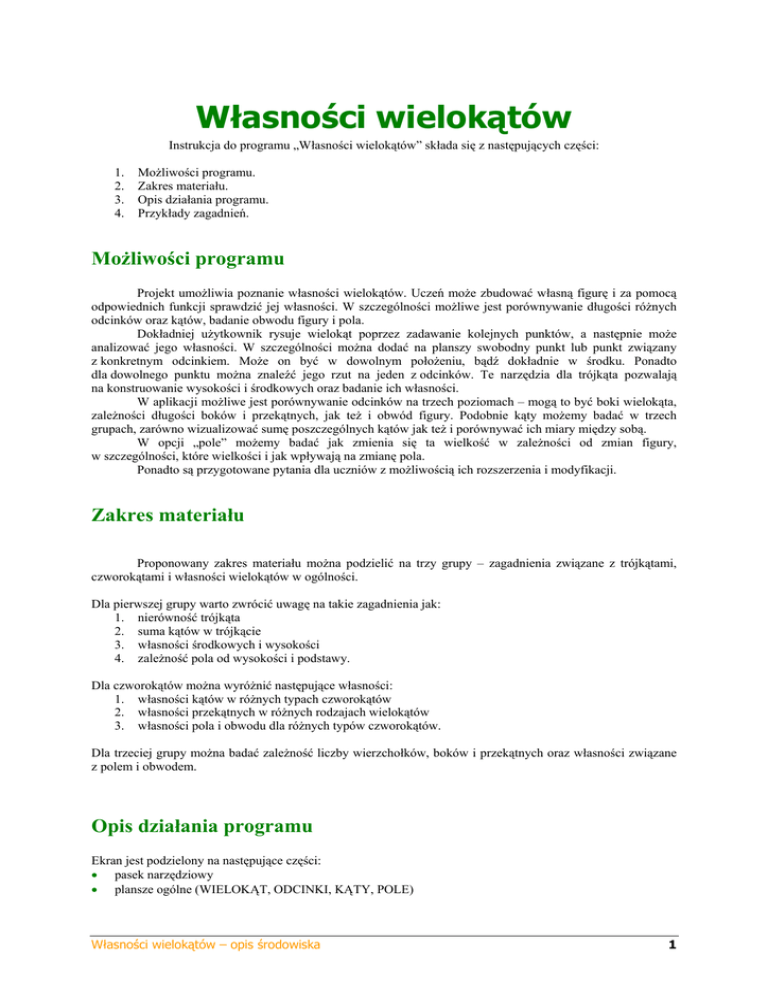 Własności wielokątów Instrukcja do programu „Własności wielokątów” składa się z następujących części: 1. 2. 3. 4. Możliwości programu. Zakres materiału. Opis działania programu. Przykłady zagadnień. Możliwości programu Projekt umożliwia poznanie własności wielokątów. Uczeń może zbudować własną figurę i za pomocą odpowiednich funkcji sprawdzić jej własności. W szczególności możliwe jest porównywanie długości różnych odcinków oraz kątów, badanie obwodu figury i pola. Dokładniej użytkownik rysuje wielokąt poprzez zadawanie kolejnych punktów, a następnie może analizować jego własności. W szczególności można dodać na planszy swobodny punkt lub punkt związany z konkretnym odcinkiem. Może on być w dowolnym położeniu, bądź dokładnie w środku. Ponadto dla dowolnego punktu można znaleźć jego rzut na jeden z odcinków. Te narzędzia dla trójkąta pozwalają na konstruowanie wysokości i środkowych oraz badanie ich własności. W aplikacji możliwe jest porównywanie odcinków na trzech poziomach – mogą to być boki wielokąta, zależności długości boków i przekątnych, jak też i obwód figury. Podobnie kąty możemy badać w trzech grupach, zarówno wizualizować sumę poszczególnych kątów jak też i porównywać ich miary między sobą. W opcji „pole” możemy badać jak zmienia się ta wielkość w zależności od zmian figury, w szczególności, które wielkości i jak wpływają na zmianę pola. Ponadto są przygotowane pytania dla uczniów z możliwością ich rozszerzenia i modyfikacji. Zakres materiału Proponowany zakres materiału można podzielić na trzy grupy – zagadnienia związane z trójkątami, czworokątami i własności wielokątów w ogólności. Dla pierwszej grupy warto zwrócić uwagę na takie zagadnienia jak: 1. nierówność trójkąta 2. suma kątów w trójkącie 3. własności środkowych i wysokości 4. zależność pola od wysokości i podstawy. Dla czworokątów można wyróżnić następujące własności: 1. własności kątów w różnych typach czworokątów 2. własności przekątnych w różnych rodzajach wielokątów 3. własności pola i obwodu dla różnych typów czworokątów. Dla trzeciej grupy można badać zależność liczby wierzchołków, boków i przekątnych oraz własności związane z polem i obwodem. Opis działania programu Ekran jest podzielony na następujące części: • pasek narzędziowy • plansze ogólne (WIELOKĄT, ODCINKI, KĄTY, POLE) Własności wielokątów – opis środowiska 1 • plansze – menu. Nie wszystkie elementy są jednocześnie widoczne -pojawiają się na żądanie. Plansze można modyfikować – przesuwać lub zmieniać ich rozmiar. W razie potrzeby większość z nich można schować klikając na ikonę Pasek narzędziowy składa się z czterech części: 1. 2. 3. 4. opcje rozpoczęcia i zakończenia programu dodanie nowych elementów porównywanie długości odcinków, miar kątów i pola. funkcje o charakterze pomocniczym Opcje rozpoczęcia i zakończenia programu ponowne rozpoczęcie działania programu zakończenie działania programu Dodanie nowych elementów Ikona Rada Opis wstaw nowe punkty klikając na planszy WIELOKĄT wstaw punkt dodatkowy utwórz nowy odcinek - połącz punkty Dodanie nowego punktu następuje, gdy użytkownik kliknie na planszy WIELOKĄT. Jeśli są przynajmniej trzy punkty i zostanie naciśnięty prawy przycisk myszy łamana zostanie zamknięta i na ekranie utworzy się wielokąt. Dodanie dodatkowego punkty następuje po wybraniu jednej z opcji: • swobodny punkt • punkt na odcinku - w dowolnym miejscu lub w środku odcinka, na przecięciu się dwóch odcinków • jako rzut punktu na wskazany odcinek. Nowy odcinek zostanie utworzony, gdy użytkownik wskaże dwa różne punkty nie połączone odcinkiem. Własności wielokątów – opis środowiska 2 Dokładniej dodatkowe punkty można stworzyć jako: • „swobodne punkty” – klikamy w dowolnym miejscu planszy WIELOKĄT • „na odcinku” – wskazujemy żądany odcinek • „w środku odcinka” - wskazujemy żądany odcinek • „na przecięciu” – wskazujemy dwa różne odcinki • „rzut” – wskazujemy punkt, który chcemy rzutować, a następnie odcinek na który rzutujemy. Można zmienić kolor odcinka klikając na nim prawym przyciskiem myszy. Porównywanie długości odcinków, miar kątów i pola: Ikona Rada Opis odłóż odcinki Użytkownik wskazuje odcinek przez kliknięcie na nim myszą lub przez wskazanie dwóch punktów. Dwie możliwości odkładania odcinków są dodane w celu uniknięcia niejednoznaczności przy odcinkach nakładających się na siebie. Ponadto możemy określić poziom, na którym chcemy odłożyć odcinek. odłóż kąt Podobnie jak dla odcinków możemy odkładać kąty w celu porównania ich miary. Użytkownik wskazuje trzy kolejne punkty. Orientacja kąta będzie zgodna ze wskazówkami zegara. Ponadto określamy nr kąta na którym ma być odłożony nowy kąt. pokaż pole Zielony prostokąt obrazuje pole wielokąta. Za pomocą suwaka można zmieniać długość podstawy prostokąta, wtedy automatycznie zostanie dopasowana wysokość. Wysokość prostokąta jest ograniczona poprzez rozmiar planszy POLE. Program nie wskazuje poprawnego pola dla wielokąta samoprzecinającego się. Odkładanie odcinków W celu porównywania długości różnych odcinków należy zmieniać poziom, na którym odpowiednie odcinki będą odkładane. Zmianę poziomu uzyskujemy klikając na ikonę: W programie dostępne są trzy poziomy zmieniające się cyklicznie tzn. z pierwszego poziomu przechodzimy na drugi, z drugiego na trzeci, a z trzeciego z powrotem na pierwszy. Istnieje możliwość skasowania wszystkich odcinków odłożonych na bieżącym poziomie. W tym celu naciskamy przycisk „skasuj aktywny poziom”, który znajduje się na planszy ODKŁADANIE ODCINKÓW. Własności wielokątów – opis śr