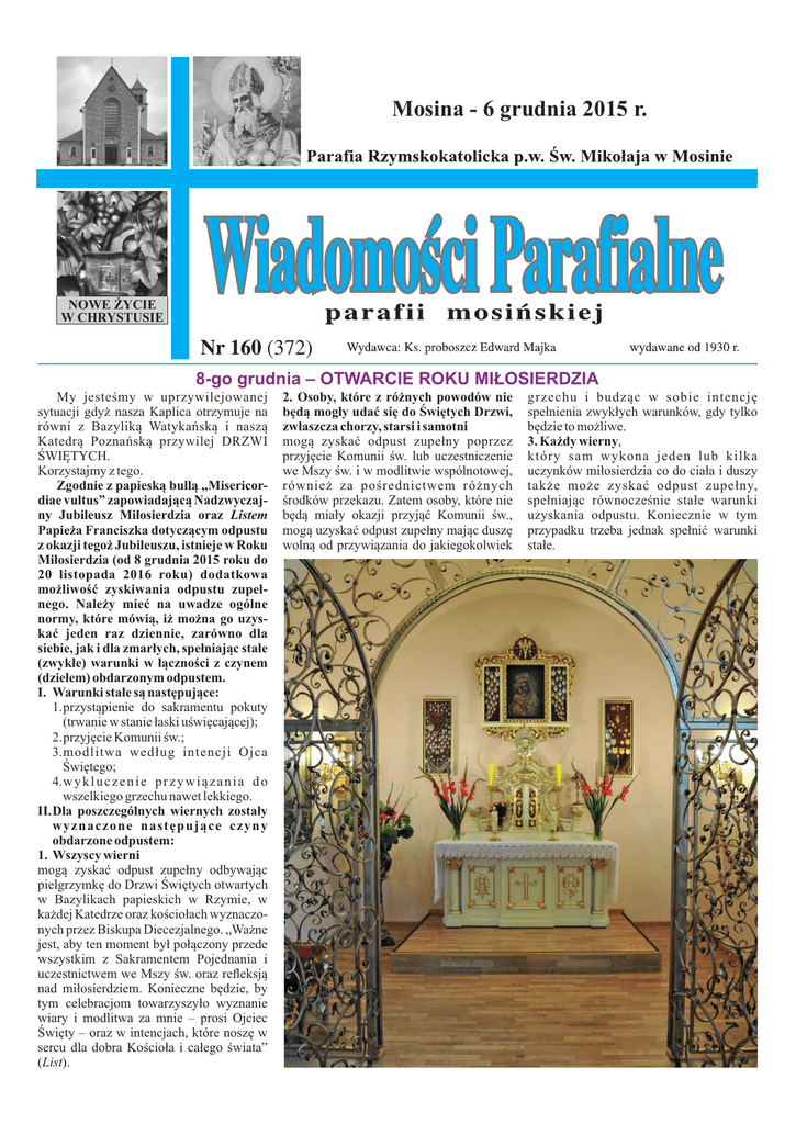 Mosina - 6 grudnia 2015 r. NOWE ŻYCIE W CHRYSTUSIE Nr 160 (372) 8-go grudnia – OTWARCIE ROKU MIŁOSIERDZIA My jesteśmy w uprzywilejowanej sytuacji gdyż nasza Kaplica otrzymuje na równi z Bazyliką Watykańską i naszą Katedrą Poznańską przywilej DRZWI ŚWIĘTYCH. Korzystajmy z tego. Zgodnie z papieską bullą „Misericordiae vultus” zapowiadającą Nadzwyczajny Jubileusz Miłosierdzia oraz Listem Papieża Franciszka dotyczącym odpustu z okazji tegoż Jubileuszu, istnieje w Roku Miłosierdzia (od 8 grudnia 2015 roku do 20 listopada 2016 roku) dodatkowa możliwość zyskiwania odpustu zupełnego. Należy mieć na uwadze ogólne normy, które mówią, iż można go uzyskać jeden raz dziennie, zarówno dla siebie, jak i dla zmarłych, spełniając stałe (zwykłe) warunki w łączności z czynem (dziełem) obdarzonym odpustem. I. Warunki stałe są następujące: 1. przystąpienie do sakramentu pokuty (trwanie w stanie łaski uświęcającej); 2. przyjęcie Komunii św.; 3. modlitwa według intencji Ojca Świętego; 4. w y k l u c z e n i e p r z y w i ą z a n i a d o wszelkiego grzechu nawet lekkiego. II. Dla poszczególnych wiernych zostały wyznaczone następujące czyny obdarzone odpustem: 1. Wszyscy wierni mogą zyskać odpust zupełny odbywając pielgrzymkę do Drzwi Świętych otwartych w Bazylikach papieskich w Rzymie, w każdej Katedrze oraz kościołach wyznaczonych przez Biskupa Diecezjalnego. „Ważne jest, aby ten moment był połączony przede wszystkim z Sakramentem Pojednania i uczestnictwem we Mszy św. oraz refleksją nad miłosierdziem. Konieczne będzie, by tym celebracjom towarzyszyło wyznanie wiary i modlitwa za mnie – prosi Ojciec Święty – oraz w intencjach, które noszę w sercu dla dobra Kościoła i całego świata” (List). 2. Osoby, które z różnych powodów nie będą mogły udać się do Świętych Drzwi, zwłaszcza chorzy, starsi i samotni mogą zyskać odpust zupełny poprzez przyjęcie Komunii św. lub uczestniczenie we Mszy św. i w modlitwie wspólnotowej, również za pośrednictwem różnych środków przekazu. Zatem osoby, które nie będą miały okazji przyjąć Komunii św., mogą uzyskać odpust zupełny mając duszę wolną od przywiązania do jakiegokolwiek grzechu i budząc w sobie intencję spełnienia zwykłych warunków, gdy tylko będzie to możliwe. 3. Każdy wierny, który sam wykona jeden lub kilka uczynków miłosierdzia co do ciała i duszy także może zyskać odpust zupełny, spełniając równocześnie stałe warunki uzyskania odpustu. Koniecznie w tym przypadku trzeba jednak spełnić warunki stałe. KONFESJONAŁ O. PIO Na drzwiach pod chórem od pewnego czasu widnieje napis: „KONFESJONAŁ O. PIO”. Nad drzwiami – duża figura O. Pio i zegar. Cóż to takiego? Drzwi oszklone w górnej części prowadzą do małego pomieszczenia, w którym ustawiono nowy prosty konfesjonał z klęcznikiem i krzesło. Nad nim duży Krucyfiks. We framudze witrażowego okna figura św. O. Pio. To On czuwa nad penitentem klęczącym przy kratkach konfesjonału i nad kapłanem sprawującym sakrament Pojednania, który cierpliwie słucha wyznań, poucza i pociesza, udziela Bożego przebaczenia grzechów i posyła: „Pan przebaczył ci grzechy. – Idź w pokoju, Pan jest z tobą. A św. O. Pio oręduje za nami w niebie, gdy tu, na ziemi, dzieje się cud Bożego Miłosierdzia. Stąd ten napis na drzwiach. Sakrament Pojednania odbywa się w świątyni św. Mikołaja jak dotąd i w nawie pokutnej przy czterech konfesjonałach. Ten nowy – piąty, umieszczony w wyciszonym pomieszczeniu ma służyć szczególnie osobom starszym i wszystkim, którzy mają problemy z klęczeniem. To właśnie dla nich ustawiono tam krzesło, na którym siedząc, mogą spokojnie odbyć Spowiedź Świętą. W wyciszonym pomieszczeniu można spokojnie rozmawiać bez uciążliwego szeptu, który czasem uniemożliwia wzajemne porozumienie między penitentem a spowiednikiem. Konfesjonał O. Pio stwarza optymalne warunki tym osobom, które mają potrzebę kierownictwa duchowego. A czasem chcą po prostu z kapłanem porozmawiać o swych trudnych problemach życiowych. Bardzo potrzebują również takich rozmów ludzie młodzi, którzy często odwiedzają Konfesjonał O. Pio – i odchodzą podniesieni na duchu. Konfesjonał O. Pio to pomysł i dzieło naszego Księdza Proboszcza, którego Pan Bóg obdarzył szczególnym charyzmatem, służby ludziom w tym, co służy ich zbawieniu. Konfesjonał O. Pio jest wspaniałym darem na Rok Miłosierdzia, który wkrótce, 8 grudnia rozpocznie się w Kościele. W tym zbawiennym czasie Pan Jezus będzie uczył nas, byśmy byli miłosierni jak Ojciec nasz niebieski. Jego wzrok pełen miłości uwolnił Zacheusza oraz Mateusza – celników od niewoli pieniądza, a kobietę grzeszną i Magdalenę od szukania szczęścia wyłącznie w rzeczach stworzonych. Wzrok ten sprawił, że Piotr zapłakał po zdradzie, a żałujący Dobry Łotr Dyzma usłyszał zapewnienie: „Dziś ze Mną będziesz w raju”. Nam też pozwoli wysłuchać słów, które wypowiedział do Samarytanki przy studni: - „O. gdybyś znała dar Boży”. Dlatego z ufnością prośmy Pana: Ty, który jesteś Obliczem widzialnym Ojca niewidzialnego, Boga, który objawia swoją wszechmoc przede wszystkim przez przebaczenie i miłosierdzie: spraw, aby kościół na świecie stał się widzialnym obliczem Ciebie, swojego Pana Zmartwychwstałego i uwielbionego. Ty zechciałeś również, aby Twoi słudzy konfesjonału przybrani byli w słabość po to, aby mogli okazywać słuszne współczucie tym, którzy trwają w niewiedzy i błędzie: niech każda osoba, która się do nich zwraca czuła się oczekiwana, kochana oraz doświadczała przebaczenia od Boga. KONFESJONAŁ O. PIO w kościele mosińskim jest realizacją wezwania Papieża Franciszka, aby Kościół miał swój „szpital polowy” a jego pasterze „mieli zapach owiec”. Jeśli przyjmiemy to wez