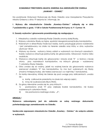 KOMUNIKAT PREZYDENTA MIASTA GNIEZNA DLA MIESZKAŃCÓW OSIEDLA „KAWIARY - OSINIEC” Na podstawie Ordynacji Wyborczej do Rady Osiedla oraz Zarządzenia Prezydenta Miasta Gniezna z dnia 19 sierpnia br. informuję, że: I. Wybory dla mieszkańców Osiedla „Kawiary-Osiniec” odbędą się w dniu 7 października o godz. 17.00 w Szkole Podstawowej Nr 8 przy ul. P. Cymsa 14. II. Zasady wyborów i głosowania przedstawiają się następująco: 1. Mieszkańcy osiedla wybierają Radę Osiedla zwaną dalej Radą. 2. Wybory członków Rady są tajne, spośród nieograniczonej liczby kandydatów. 3. Wybranym w skład Rady może być każdy, komu przysługuje prawo wybierania i jest zameldowany na stałe na terenie osiedla oraz który w dniu wyborów ukończył 18 lat. 4. Wybory są równe, wyborcy biorą udział w wyborach na równych zasadach. Każdy wyborca otrzymuje jedną kartę do głosowania. Głosować można tylko osobiście. 5. Wyborca otrzymuje kartę do głosowania i stawia znak "X" w kratce z lewej strony przy nazwiskach kandydatów, na których głosuje – wybieramy 7 członków Rady Osiedla. 6. Głos uważa się za ważny, jeżeli na ważnej karcie do głosowania wyborca zaznaczył znakiem "X" tylu kandydatów, ilu ma być wybranych do Rady (można mniejszą liczbę, ale trzeba zaznaczyć co najmniej 1 kandydata). 7. Za kartę nieważną, której nie bierze się pod uwagę przy obliczeniach, uważa się : a. kartę całkowicie przedartą na dwie lub więcej części, b. inną niż wydrukowało Biuro RMG. 8. Za głosy nieważne uważa się te, przy których : 1) postawiono znak "X" przy większej liczbie kandydatów, niż liczba wybieranych członków Rady. 2) nie postawiono żadnego znaku „X”, UWAGA ! Wyborca zobowiązany jest do zabrania ze sobą ważnego dokumentu potwierdzającego zameldowanie na Osiedlu. Serdecznie zapraszam mieszkańców Osiedla „Kawiary - Osiniec” do wzięcia udziału w wyborach. /-/ Tomasz Budasz Prezydent Miasta Gniezna