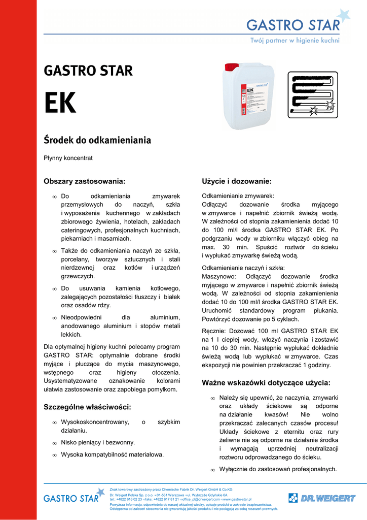 GASTRO STAR EK Środek do odkamieniania Płynny koncentrat Obszary zastosowania: Użycie i dozowanie: odkamieniania zmywarek • Do przemysłowych do naczyń, szkła i wyposażenia kuchennego w zakładach zbiorowego żywienia, hotelach, zakładach cateringowych, profesjonalnych kuchniach, piekarniach i masarniach. • Także do odkamieniania naczyń ze szkła, porcelany, tworzyw sztucznych i stali nierdzewnej oraz kotłów i urządzeń grzewczych. usuwania kamienia kotłowego, • Do zalegających pozostałości tłuszczy i białek oraz osadów rdzy. dla aluminium, • Nieodpowiedni anodowanego aluminium i stopów metali lekkich. Dla optymalnej higieny kuchni polecamy program GASTRO STAR: optymalnie dobrane środki myjące i płuczące do mycia maszynowego, wstępnego oraz higieny otoczenia. Usystematyzowane oznakowanie kolorami ułatwia zastosowanie oraz zapobiega pomyłkom. Szczególne właściwości: • Wysokoskoncentrowany, działaniu. o szybkim • Nisko pieniący i bezwonny. • Wysoka kompatybilność materiałowa. Odkamienianie zmywarek: Odłączyć dozowanie środka myjącego w zmywarce i napełnić zbiornik świeżą wodą. W zależności od stopnia zakamienienia dodać 10 do 100 ml/l środka GASTRO STAR EK. Po podgrzaniu wody w zbiorniku włączyć obieg na max. 30 min. Spuścić roztwór do ścieku i wypłukać zmywarkę świeżą wodą. Odkamienianie naczyń i szkła: Maszynowo: Odłączyć dozowanie środka myjącego w zmywarce i napełnić zbiornik świeżą wodą. W zależności od stopnia zakamienienia dodać 10 do 100 ml/l środka GASTRO STAR EK. Uruchomić standardowy program płukania. Powtórzyć dozowanie po 5 cyklach. Ręcznie: Dozować 100 ml GASTRO STAR EK na 1 l ciepłej wody, włożyć naczynia i zostawić na 10 do 30 min. Następnie wypłukać dokładnie świeżą wodą lub wypłukać w zmywarce. Czas ekspozycji nie powinien przekraczać 1 godziny. Ważne wskazówki dotyczące użycia: • Należy się upewnić, że naczynia, zmywarki oraz układy ściekowe są odporne na działanie kwasów! Nie wolno przekraczać zalecanych czasów procesu! Układy ściekowe z eternitu oraz rury żeliwne nie są odporne na działanie środka i wymagają uprzedniej neutralizacji roztworu odprowadzanego do ścieku. • Wyłącznie do zastosowań profesjonalnych. Znak towarowy zastrzeżony przez Chemische Fabrik Dr. Weigert GmbH & Co.KG Dr. Weigert Polska Sp. z o.o. • 01-531 Warszawa • ul. Wybrzeże Gdyńskie 6A tel.: +4822 616 02 23 • faks: +4822 617 81 21 • [email protected] • www.gastro-star.pl Powyższa informacja, odpowiednia do naszej aktualnej wiedzy, opisuje produkt w zakresie bezpieczeństwa. Odstępstwa od zaleceń stosowania nie gwarantują jakości produktu i nie pociągają za sobą roszczeń prawnych. • Roztwór roboczy GASTRO STAR EK należy całkowicie spłukać wodą. • Dla ekonomicznego i bezpiecznego dozowania i użycia produktu dostępne są akcesoria pomocnicze, jak pompki do kanistrów. • Nie mieszać z innymi produktami. • Nie przelewać do innych pojemników, butelek itp.! Dane techniczne: wartość pH lepkość gęstość ok. 1 (koncentrat) <50 mPas (koncentrat, 20°C) 3 1,4 g/cm (20°C) Skład: Zawartość składników według Rozporządzenia WE 648/2004 w sprawie detergentów: <5% niejonowe środki powierzchniowo czynne Magazynowanie: Przechowywać w chłodnym i ciemnym miejscu w temperaturach od 0 do 30°C. Chronić przed mrozem poniżej -15°C. W trakcie magazynowania produktu może wystąpić zmiana koloru nie mająca wpływu na jego właściwości użytkowe. Rodzaje zagrożeń i środki ostrożności: Informacje dotyczące bezpieczeństwa i ochrony środowiska znajdują się w karcie charakterystyki dostępnej na stronie www.gastro-star.pl Jeżeli produkt używany jest zgodnie z zaleceniami, nie stanowi on zagrożenia w rozumieniu dyrektywy dot. przetwórstwa spożywczego. Zamknięte opakowania należy usuwać jako odpady tylko po całkowitym opróżnieniu. Usuwanie resztek produktu według zaleceń zamieszczonych w karcie charakterystyki. MB 3141/2-2_09/2014 Znak towarowy zastrzeżony przez Chemische Fabrik Dr. Weigert GmbH & Co.KG Dr. Weigert Polska Sp. z o.o. • 01-531 Warszawa • ul. Wybrzeże Gdyńskie 6A tel.: +4822 616 02 23 • faks: +4822 617 81 21 • [email protected] • www.gastro-star.pl Powyższa informacja, odpowiednia do naszej aktualnej wiedzy, opisuje produkt w zakresie bezpieczeństwa. Odstępstwa od zaleceń stosowania nie gwarantują jakości produktu i nie pociągają za sobą roszczeń prawnych. PL 3.0 / 06.2015