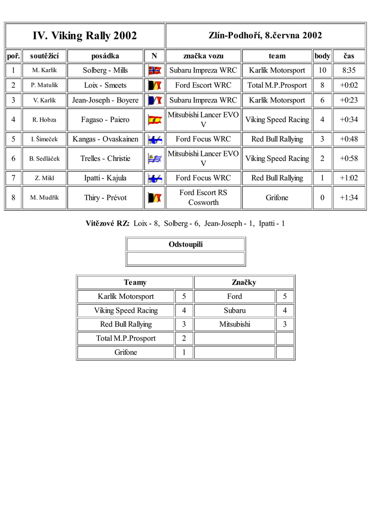 IV. Viking Rally 2002 poř. soutěžící posádka 1 M. Karlík 2 Zlín-Podhoří, 8.června 2002 N značka vozu team body čas Solberg - Mills Subaru Impreza WRC Karlík Motorsport 10 8:35 P. Matulík Loix - Smeets Ford Escort WRC Total M.P.Prosport 8 +0:02 3 V. Karlík Jean-Joseph - Boyere Subaru Impreza WRC Karlík Motorsport 6 +0:23 4 R. Hobza Fagaso - Paiero 4 +0:34 5 I. Šimeček Kangas - Ovaskainen 3 +0:48 6 B. Sedláček Trelles - Christie 2 +0:58 7 Z. Mikl Ipatti - Kajula Ford Focus WRC Red Bull Rallying 1 +1:02 8 M. Mudřík Thiry - Prévot Ford Escort RS Cosworth Grifone 0 +1:34 Mitsubishi Lancer EVO Viking Speed Racing V Ford Focus WRC Red Bull Rallying Mitsubishi Lancer EVO Viking Speed Racing V Vítězové RZ: Loix - 8, Solberg - 6, Jean-Joseph - 1, Ipatti - 1 Odstoupili Teamy Značky Karlík Motorsport 5 Ford 5 Viking Speed Racing 4 Subaru 4 Red Bull Rallying 3 Mitsubishi 3 Total M.P.Prosport 2 Grifone 1