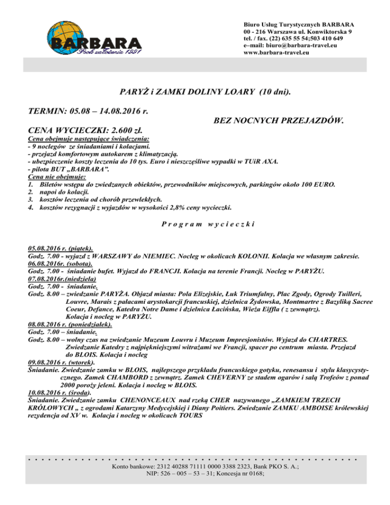Biuro Usług Turystycznych BARBARA 00 - 216 Warszawa ul. Konwiktorska 9 tel. / fax. (22) 635 55 54;503 410 649 e–mail: [email protected] www.barbara-travel.eu PARYŻ i ZAMKI DOLINY LOARY (10 dni). TERMIN: 05.08 – 14.08.2016 r. BEZ NOCNYCH PRZEJAZDÓW. CENA WYCIECZKI: 2.600 zł. Cena obejmuje następujące świadczenia: - 9 noclegów ze śniadaniami i kolacjami. - przejazd komfortowym autokarem z klimatyzacją. - ubezpieczenie koszty leczenia do 10 tys. Euro i nieszczęśliwe wypadki w TUiR AXA. - pilota BUT „BARBARA”. Cena nie obejmuje: 1. Biletów wstępu do zwiedzanych obiektów, przewodników miejscowych, parkingów około 100 EURO. 2. napoi do kolacji. 3. kosztów leczenia od chorób przewlekłych. 4. kosztów rezygnacji z wyjazdów w wysokości 2,8% ceny wycieczki. Program wycieczki 05.08.2016 r. (piątek). Godz. 7.00 - wyjazd z WARSZAWY do NIEMIEC. Nocleg w okolicach KOLONII. Kolacja we własnym zakresie. 06.08.2016r. (sobota). Godz. 7.00 - śniadanie bufet. Wyjazd do FRANCJI. Kolacja na terenie Francji. Nocleg w PARYŻU. 07.08.2016r.(niedziela) Godz. 7.00 - śniadanie. Godz. 8.00 – zwiedzanie PARYŻA. Objazd miasta: Pola Elizejskie, Łuk Triumfalny, Plac Zgody, Ogrody Tuilleri, Louvre, Marais z pałacami arystokarcji francuskiej, dzielnica Żydowska, Montmartre z Bazyliką Sacree Coeur, Defance, Katedra Notre Dame i dzielnica Łacińska, Wieża Eiffla ( z zewnątrz). Kolacja i nocleg w PARYŻU. 08.08.2016 r. (poniedziałek). Godz. 7.00 – śniadanie. Godz. 8.00 – wolny czas na zwiedzanie Muzeum Louvru i Muzeum Impresjonistów. Wyjazd do CHARTRES. Zwiedzanie Katedry z najpiękniejszymi witrażami we Francji, spacer po centrum miasta. Przejazd do BLOIS. Kolacja i nocleg 09.08.2016 r. (wtorek). Śniadanie. Zwiedzanie zamku w BLOIS, najlepszego przykładu francuskiego gotyku, renesansu i stylu klasycystycznego. Zamek CHAMBORD z zewnątrz. Zamek CHEVERNY ze stadem ogarów i salą Trofeów z ponad 2000 poroży jeleni. Kolacja i nocleg w BLOIS. 10.08.2016 r. (środa). Śniadanie. Zwiedzanie zamku CHENONCEAUX nad rzeką CHER nazywanego „ZAMKIEM TRZECH KRÓLOWYCH „ z ogrodami Katarzyny Medycejskiej i Diany Poitiers. Zwiedzanie ZAMKU AMBOISE królewskiej rezydencja od XV w. Kolacja i nocleg w okolicach TOURS .................................................. Konto bankowe: 2312 40288 71111 0000 3388 2323, Bank PKO S. A.; NIP: 526 – 005 – 53 – 31; Koncesja nr 0168; 11.08.2016 r. (czwartek). Śniadanie. Zwiedzanie TOURS: Bazylika św. Marcina z XIX w., sztachulcowe średniowieczne domy, Ratusz, kamienny most. Zwiedzanie ZAMKU VILLARDY pięknej renesansowej rezydencji z tarasowo położonymi ogrodami Kwiatowym i warzywnym. Kolacja i nocleg. 12.08.2016 r. (piątek). Godz. 7.30 – śniadanie. Przejazd do FONTAINEBLEAU i zwiedzanie zamku. Spacer z pilotem po SENS. Kolacja i nocleg. 13.08.2016 r. (sobota). Godz. 7.00 – śniadanie. Spacer po TROYES . Kolacja i nocleg na terenie NIEMIEC. 14.08.2016r. (niedziela). Godz. 7.00 – śniadanie i wyjazd do POLSKI. Przyjazd do Warszawy około godz. 21.00. 1. 2. 3. 4. 5. 6. przy zapisie wpłata zaliczki w wysokości 30% ceny wycieczki i wybór miejsca w autokarze. w autokarze obowiązuje zakaz palenia tytoniu. Postoje na toaletę i papierosa co 3 godziny. wycieczkę organizujemy przy minimum 25 osobach. organizator zastrzega sobie zmianę kolejności zwiedzanie. cena wycieczki może ulec zmianie przy drastycznym wzroście kursu Euro. Wycieczka rozpoczyna się i kończy na ul. Bonifraterskiej.