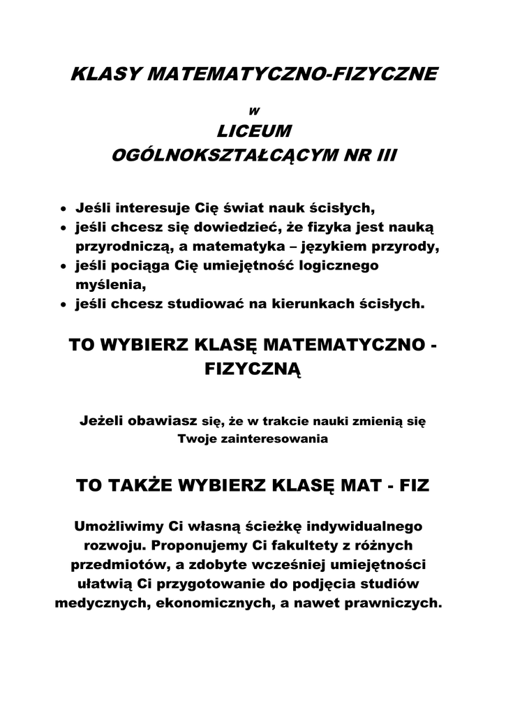KLASY MATEMATYCZNO-FIZYCZNE W LICEUM OGÓLNOKSZTAŁCĄCYM NR III Jeśli interesuje Cię świat nauk ścisłych, jeśli chcesz się dowiedzieć, że fizyka jest nauką przyrodniczą, a matematyka – językiem przyrody, jeśli pociąga Cię umiejętność logicznego myślenia, jeśli chcesz studiować na kierunkach ścisłych. TO WYBIERZ KLASĘ MATEMATYCZNO FIZYCZNĄ Jeżeli obawiasz się, że w trakcie nauki zmienią się Twoje zainteresowania TO TAKŻE WYBIERZ KLASĘ MAT - FIZ Umożliwimy Ci własną ścieżkę indywidualnego rozwoju. Proponujemy Ci fakultety z różnych przedmiotów, a zdobyte wcześniej umiejętności ułatwią Ci przygotowanie do podjęcia studiów medycznych, ekonomicznych, a nawet prawniczych. siatki godzin - klasa matematyczna- fizyczna status język polski j. ang/niem wiedza o kulturze historia wiedza o społeczeństwie podst. przeds. geografia biologia chemia fizyka matematyka matematyka rozsz. informatyka wychowanie fizyczne PO-edukacja dla bezp. spotkania klasowe obow. podst. obow. podst. obow. podst. obow. podst. obow. podst. obow. podst. obow. podst. obow. podst. obow. podst. obow. podst. obow. podst. obow. rozsz. obow. podst. obow. podst. obow. podst. obow. podst. wybór w połowie kl. I FAKULTETY ŚCIEŻKA I wybór po klasie I przedm. uzupełniający wybór w połowie kl. I FAKULTETY ŚCIEŻKA II wybór po klasie I przedm. uzupełniający FAKULTETY ŚCIEŻKA III religia / etyka wychowanie do życia w rodzinie zajęcia rewalidacyjne dla uczniów niepełnosprawnych klasa I I II 4 4 4 4 2 4 2 2 2 1 1 2 2 2 3 3 2 2 3 3 2 1 1 wybór w połowie kl. I po klasie I przedm. uzupełniający mat fiz inf / geo hist. i społ. chem biol mat / fiz1 hist. i społ. WOS hist pol przyroda przedmioty opcjonalne dla ucznia liczba godzin dla ucznia klasa II klasa III 4 8 4 3 3 4 3 3 1 1 34 22 19 15 0 0 0 2 2 0 3 4 4 3 5 4 0 0 2 2 34 26 32 29 0 0 0 4 2 0 3 4 4 3 5 4 0 0 2 2 34 28 32 29 0 0 0 0 4 2 0 0 3 4 4 2 3 5 4 2 34 28 32 29 2 2 2 2 14 h/rok 2 2 14 h/rok 14 h/rok 2 2