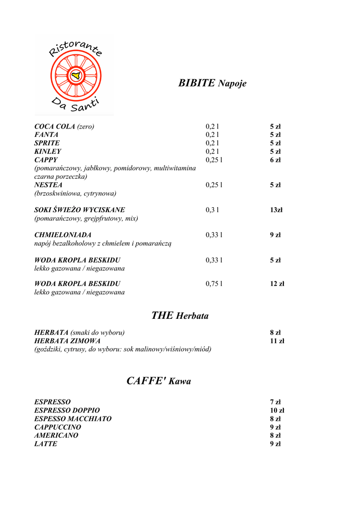 BIBITE Napoje COCA COLA (zero) FANTA SPRITE KINLEY CAPPY (pomarańczowy, jabłkowy, pomidorowy, multiwitamina czarna porzeczka) NESTEA (brzoskwiniowa, cytrynowa) 0,2 l 0,2 l 0,2 l 0,2 l 0,25 l 5 zł 5 zł 5 zł 5 zł 6 zł 0,25 l 5 zł SOKI ŚWIEŻO WYCISKANE (pomarańczowy, grejpfrutowy, mix) 0,3 l 13zł CHMIELONIADA napój bezalkoholowy z chmielem i pomarańczą 0,33 l 9 zł WODA KROPLA BESKIDU lekko gazowana / niegazowana 0,33 l 5 zł WODA KROPLA BESKIDU lekko gazowana / niegazowana 0,75 l 12 zł THE Herbata HERBATA (smaki do wyboru) HERBATA ZIMOWA (goździki, cytrusy, do wyboru: sok malinowy/wiśniowy/miód) 8 zł 11 zł CAFFE' Kawa ESPRESSO ESPRESSO DOPPIO ESPESSO MACCHIATO CAPPUCCINO AMERICANO LATTE 7 zł 10 zł 8 zł 9 zł 8 zł 9 zł VINI Wino VINO ROSSO DELLA CASA VINO BIANCO DELLA CASA kieliszek 150 ml/karafka 0,50 / 1l kieliszek 150 ml/karafka 0,50 / 1l 10 zł/28 zł/49 zł 10 zł/28 zł/49 zł wino półwytrawne, pochodzenie: Abruzja we Włoszech, wybrane przez serce i duszę restauracji, ojca szefa kuchni i znawcę, wytwórcę i smakosza win - Francesco Gugliotta GRZANIEC GALICYJSJKI z cytrusamii i goździkami 250 ml 13 zł PROSECCO Alberto Torresi D.O.C kieliszek 120 ml/0,75 l 12 zł/55 zł wino prosecco pochodzenie: Włochy ORYGINALNE WŁOSKIE KOKTAJLE APEROL APERITIVO udekorowany plastrem pomarańczy MARTINI BIANCO APERITIVO udekorowane zieloną oliwką MARTINI ROSSO APERITIVO udekorowane plastrem pomarańczy APEROL SPRITZ Aperol, prosecco oraz woda gazowana, udekorowany plastrem pomarańczy 0,6 cl 15 zł 0,8 cl 13 zł 0,8 cl 13 zł 250 ml 21 zł