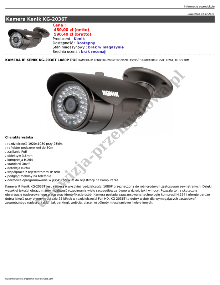 Informacje o produkcie Utworzono 04-03-2017 Kamera Kenik KG-2036T Cena : 480,00 zł (netto) 590,40 zł (brutto) Producent : Kenik Dostępność : Dostępny Stan magazynowy : brak w magazynie Średnia ocena : brak recenzji ze m ys lo w a. pl KAMERA IP KENIK KG-2036T 1080P POE KAMERA IP KENIK KG-2036T ROZDZIELCZOŚĆ 1920X1080 ONVIF, H264, IR DO 30M Charakterystyka ● ● ● ● ● ● ● ● rozdzielczość 1920x1080 przy 25kl/s reflektor podczerwieni do 30m zasilanie PoE obiektyw 3.6mm kompresja H.264 standard Onvif detekcja ruchu współpraca z rejestratorami IP NVR podgląd mobilny na telefonie darmowe oprogramowanie w języku polskim do rejestracji na komputerze -p r ● w iz ja ● te le Kamera IP Kenik KG-2036T jest kamerą o wysokiej rozdzielczości 1080P przeznaczoną do różnorodnych zastosowań zewnętrznych. Dzięki wysokiej jakości obrazu mamy możliwość rozpoznania wielu szczegółów zarówno w dzień, jak i w nocy. Pozwala to na skuteczną obserwację nadzorowanego placu oraz identyfikację osób. Kamera posiada zaawansowaną technologię kompresji H.264 i oferuje bardzo dobrą jakość przy płynnym obrazie 25 kl/sek w rozdzielczości Full HD. KG-2036T to dobry wybór dla wymagających zastosowań zewnętrznego nadzoru, takich jak parkingi, wejścia, place, wspólnoty mieszkaniowe i wiele innych. Wygenerowano w programie www.oscGold.com pl a. ze m ys lo w te le w iz ja Przetwornik Rozdzielczość Kompresja Obiektyw Częstotliwość odświeżania (kl/s) Czułość Onvif Reflektor IR Filtr IR-CUT Detekcja ruchu Podgląd mobilny Interjefs WWW Obsługiwane protokoły Stopień ochrony Zasilanie Pobór prądu -p r Specyfikacja: 1/2.5" CMOS Micron 1920x1080; 704x576 H.264 3.6mm 25 (1920 x 1080) kolor 0.6 [email protected], B/W 0.08 [email protected] tak do 30m tak tak Android, iOS, Windows Mobile, Symbian wielojęzyczny (w tym polski) RTSP/FTP/PPPOE/DHCP/DDNS/NTP/UPnP IP66 12V DC / PoE (802.3af) IR wł.: 600mA max., IR wył.: 200mA W zestawie z kamerą otrzymujemy darmowe oprogramowanie w języku polskim pozwalające na zarządzanie oraz rejestrację obrazu z kamer IP Kenik. Daje nam to możliwość stworzenia rozbudowanego systemu monitoringu z zapisem na komputerze. W dodatku CMS pozwala na połączenie z obecnym systemem analogowym w jednym programie! Obsługuje tylko wybrane rejestratory (np. Kenik, EasyCam). W SKŁAD ZESTAWU WCHODZI ● ● ● kamera IP KG-2036T (nr kat. 7719) płyta z oprogramowaniem w języku polskim kołki montażowe Informacje o produkcie te le w iz ja -p r ze m ys lo w a. pl zadzwoń i zapytaj o rabat (22 672-36-36) (505-130-571) Wygenerowano w programie www.oscGold.com