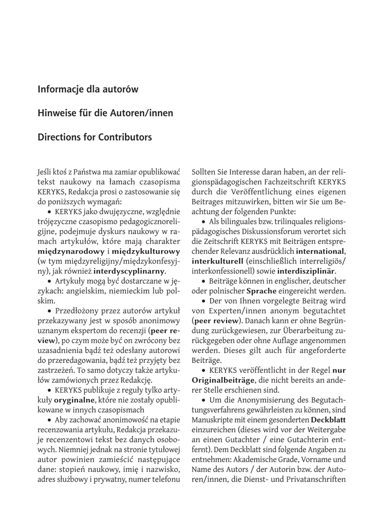 Informacje dla autorów Hinweise für die Autoren/innen Directions for Contributors Jeśli ktoś z Państwa ma zamiar opublikować tekst naukowy na łamach czasopisma KERYKS, Redakcja prosi o zastosowanie się do poniższych wymagań: KERYKS jako dwujęzyczne, względnie trójęzyczne czasopismo pedagogicznoreligijne, podejmuje dyskurs naukowy w ramach artykułów, które mają charakter międzynarodowy i międzykulturowy (w tym międzyreligijny/międzykonfesyjny), jak również interdyscyplinarny. Artykuły mogą być dostarczane w językach: angielskim, niemieckim lub polskim. Przedłożony przez autorów artykuł przekazywany jest w sposób anonimowy uznanym ekspertom do recenzji (peer review), po czym może być on zwrócony bez uzasadnienia bądź też odesłany autorowi do przeredagowania, bądź też przyjęty bez zastrzeżeń. To samo dotyczy także artykułów zamówionych przez Redakcję. KERYKS publikuje z reguły tylko artykuły oryginalne, które nie zostały opublikowane w innych czasopismach Aby zachować anonimowość na etapie recenzowania artykułu, Redakcja przekazuje recenzentowi tekst bez danych osobowych. Niemniej jednak na stronie tytułowej autor powinien zamieścić następujące dane: stopień naukowy, imię i nazwisko, adres służbowy i prywatny, numer telefonu Sollten Sie Interesse daran haben, an der religionspädagogischen Fachzeitschrift KERYKS durch die Veröffentlichung eines eigenen Beitrages mitzuwirken, bitten wir Sie um Beachtung der folgenden Punkte: Als bilinguales bzw. trilinquales religionspädagogisches Diskussionsforum verortet sich die Zeitschrift KERYKS mit Beiträgen entsprechender Relevanz ausdrücklich international, interkulturell (einschließlich interreligiös/ interkonfessionell) sowie interdisziplinär. Beiträge können in englischer, deutscher oder polnischer Sprache eingereicht werden. Der von Ihnen vorgelegte Beitrag wird von Experten/innen anonym begutachtet (peer review). Danach kann er ohne Begründung zurückgewiesen, zur Überarbeitung zurückgegeben oder ohne Auflage angenommen werden. Dieses gilt auch für angeforderte Beiträge. KERYKS veröffentlicht in der Regel nur Originalbeiträge, die nicht bereits an anderer Stelle erschienen sind. Um die Anonymisierung des Begutachtungsverfahrens gewährleisten zu können, sind Manuskripte mit einem gesonderten Deckblatt einzureichen (dieses wird vor der Weitergabe an einen Gutachter / eine Gutachterin entfernt). Dem Deckblatt sind folgende Angaben zu entnehmen: Akademische Grade, Vorname und Name des Autors / der Autorin bzw. der Autoren/innen, die Dienst- und Privatanschriften KERYKS Informacje dla autorów / Hinweise für Autoren/innen / Directions for Contributors i ewentualnie faxu, adres mailowy, a także dla optymalnej łączności z autorem – numer telefonu komórkowego. Niazamówione materiały prosimy przesyłać na adres mailowy Redaktora Naczelnego, ks. prof. dra hab. Cypriana Rogowskiego ([email protected]), artykuły zamówione w ramach określonej problematyki – na adres Redaktora Numeru Specjalnego, jak również Redaktora Naczelnego. Objętość artykułów łącznie z przypisami z reguły nie może przekraczać 10 stron, 1800 znaków na stronie (łącznie ze spacjami); w wyjątkowych przypadkach (po konsultacji) – nie może przekroczyć 15 stron. Ograniczenie to wynika z faktu, iż w czasopiśmie zamieszczane są 2 wersje – w języku polskim i niemieckim. Artykułów prosimy nie formatować. Każdy artykuł w języku niemieckim tłumaczony jest na język polski i każdy polski – na język niemiecki. Artykuły nadesłane w języku angielskim będą opublikowane bez tłumaczenia. Koszt przekładu pokrywa autor – z zastrzeżeniem, iż Redakcja wskazuje doświadczonego tłumacza, współpracującego z czasopismem KERYKS. Koszty tłumaczenia i przygotowania do publikacji obecnie wynoszą 25 Euro za stronę 1800 znaków łącznie ze spacjami. Autor otrzymuje rachunek. W wyjątkowych przypadkach Redakcja może przyjąć również artykuł przetłumaczony we własnym zakresie, jeśli przekład nie będzie budził zastrzeżeń. Każdy artykuł powinien być przez autora uzupełniony streszczeniem (od 5 do 8 wierszy) oraz słowami kluczowymi (od 4 do 8). Autor powinien też dołączyć an- sowie Telefon- und Faxverbindung, Emailverbindung und – im Interesse einer optimalen Erreichbarkeit – eine Handynummer. Unverlangte Manuskripte sind per Email an den Hauptschriftleiter, Prof. Dr. Cyprian Rogowski ([email protected]) zu senden. Beiträge, die einem Themenschwerpunkt gelten und dafür eigens angefordert worden sind, sind dem Redakteur der speziellen Nummer sowie dem Hauptschriftleiter vorzulegen. Die Länge der Beiträge sollte (einschließlich Fußnoten) in der Regel bei 5-10 Seiten à 1.800 Zeichen (inklusive Leerzeichen), in Ausnahmefällen und nach Absprache bei 10-15 Seiten, liegen. Beachten Sie bitte, dass sich die Seiten durch die Übersetzung verdoppeln. Die Beiträge sind unformatiert einzureichen. Jeder deutsche Beitrag erscheint in polnischer Übersetzung, jeder polnische in deutscher Übersetzung. Englischsprachige Beiträge werden ohne Übersetzung ins Deutsche bzw. Polnische veröffentlicht. Übersetzungen sind kostenpflichtig. Für die Durchführung der Übersetzung durch erfahrene Übersetzer/innen sorgt KERYKS. Die Übersetzungs- und Bearbeitungskosten von zurzeit 25,00 € pro Seite (1.800 Zeichen inkl. Leerzeichen) trägt der jeweilige Autor bzw. die jeweilige Autorin selbst. Sie werden von uns in Rechnung gestellt. In Ausnahmefällen und nach Absprache akzeptieren wir auch von Ihnen mitgelieferte Übersetzungen. Bitte stellen Sie Ihrem Beitrag eine ca. fünfbis achtzeilige Zusammenfassung (Summary, Abstract) voran. Diese und die von Ihnen vorgeschlagenen 4 bis 8 Schlüsselwörter (Keywords) sowie die Überschrift ihres Beitrages sind durch Sie selbst bzw. eine/n durch Sie beauftragte(n) Übersetzer/in ins Englische zu übersetzen. Informa
