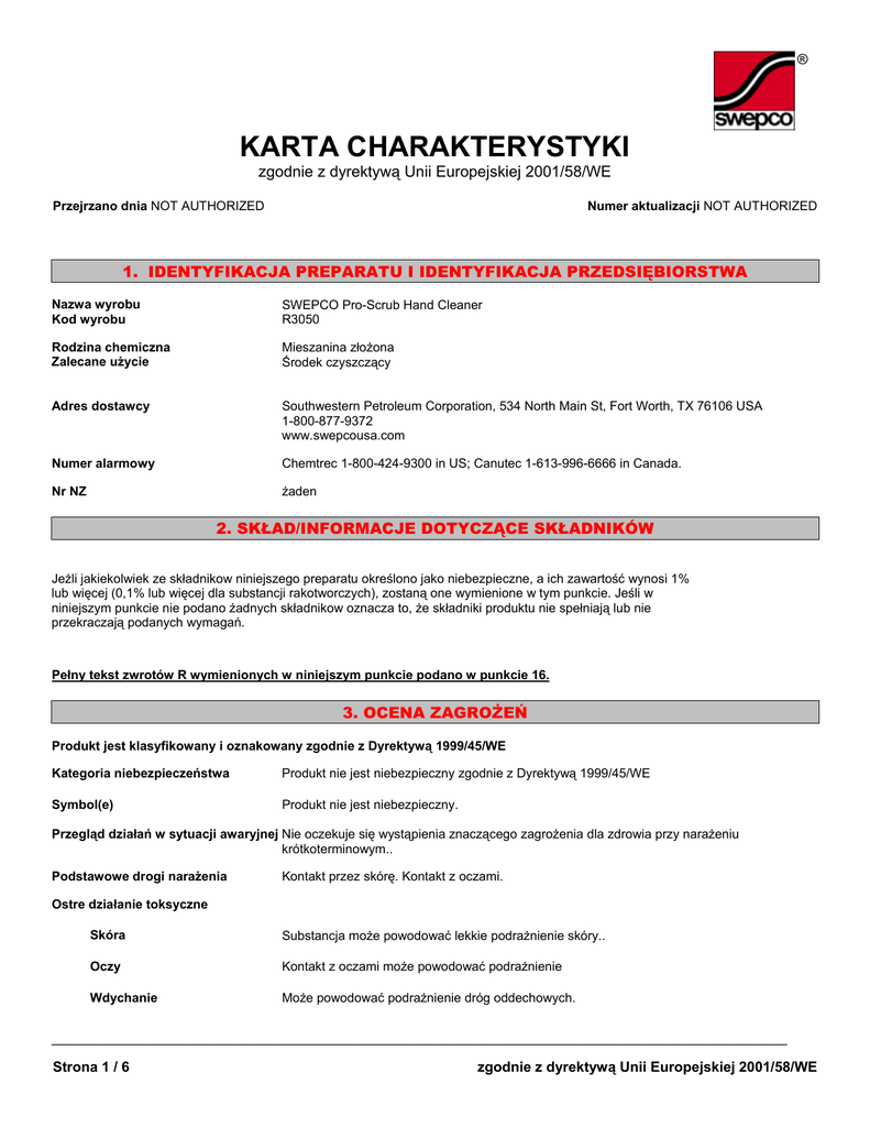 ® KARTA CHARAKTERYSTYKI zgodnie z dyrektywą Unii Europejskiej 2001/58/WE Przejrzano dnia NOT AUTHORIZED Numer aktualizacji NOT AUTHORIZED 1. IDENTYFIKACJA PREPARATU I IDENTYFIKACJA PRZEDSIĘBIORSTWA Nazwa wyrobu Kod wyrobu SWEPCO Pro-Scrub Hand Cleaner R3050 Rodzina chemiczna Zalecane użycie Mieszanina złożona Środek czyszczący Adres dostawcy Southwestern Petroleum Corporation, 534 North Main St, Fort Worth, TX 76106 USA 1-800-877-9372 www.swepcousa.com Numer alarmowy Chemtrec 1-800-424-9300 in US; Canutec 1-613-996-6666 in Canada. Nr NZ żaden 2. SKŁAD/INFORMACJE DOTYCZĄCE SKŁADNIKÓW Jeżli jakiekolwiek ze składnikow niniejszego preparatu określono jako niebezpieczne, a ich zawartość wynosi 1% lub więcej (0,1% lub więcej dla substancji rakotworczych), zostaną one wymienione w tym punkcie. Jeśli w niniejszym punkcie nie podano żadnych składnikow oznacza to, że składniki produktu nie spełniają lub nie przekraczają podanych wymagań. Pełny tekst zwrotów R wymienionych w niniejszym punkcie podano w punkcie 16. 3. OCENA ZAGROŻEŃ Produkt jest klasyfikowany i oznakowany zgodnie z Dyrektywą 1999/45/WE Kategoria niebezpieczeństwa Produkt nie jest niebezpieczny zgodnie z Dyrektywą 1999/45/WE Symbol(e) Produkt nie jest niebezpieczny. Przegląd działań w sytuacji awaryjnej Nie oczekuje się wystąpienia znaczącego zagrożenia dla zdrowia przy narażeniu krótkoterminowym.. Podstawowe drogi narażenia Kontakt przez skórę. Kontakt z oczami. Ostre działanie toksyczne Skóra Substancja może powodować lekkie podrażnienie skóry.. Oczy Kontakt z oczami może powodować podrażnienie Wdychanie Może powodować podrażnienie dróg oddechowych. _____________________________________________________________________________________________ Strona 1 / 6 zgodnie z dyrektywą Unii Europejskiej 2001/58/WE R3050 - SWEPCO Pro-Scrub Hand Cleaner _____________________________________________________________________________________________ Połknięcie Spożycie może powodować podrażnienie żołądkowo-jelitowe, nudności, wymioty i biegunkę.. Działanie rakotwórcze Działanie rakotwórcze całej mieszaniny nie zostało ocenione. Informacje dotyczące poszczególnych składników, które mogą mieć działanie rakotwórcze, o ile występują, podano w punkcie 2. i 11. Przewlekłe działanie toksyczne Brak znanych skutków. 4. PIERWSZA POMOC Kontakt z oczami Przemywać dokładnie dużą ilością wody przynajmniej przez 15 minut i skonsultować się z lekarzem. Kontakt przez skóre Natychmiast zmyć mydłem z dużą ilością wody. Wdychanie Przenieść na świeże powietrze. Połknięcie Natychmiast powiadomić lekarza. Nie wywoływać wymiotów bez konsultacji z lekarzem. W przypadku wymiotów opuścić głowę poniżej ramion, aby zapobiec aspiracji.. Uwagi dla lekarza Leczenie objawowe 5. OCHRONA PRZECIWPOŻAROWA Właściwości palne Niepalny. Stosowne środki gaśnicze Rozpylony strumień wody lub mgła wodna, proszek gaśniczy, ditlenek węgla (CO2) lub piana. Pojemniki chłodzić poprzez zalewanie wodą jeszcze przez pewien czas po ugaszeniu pożaru Niebezpieczne produkty spalania Produkty rozkładu i spalania mogą być toksyczne.. Tlenek węgla. Dwutlenek węgla (CO2). Specyficzne zagrożenia związane z produktem Brak dostępnej informacji. Wyposażenie ochronne i środki ostrożności dla strażaków Założyć sprzęt do oddychania z obiegiem zamkniętym i odzież ochronną 6. ŚRODKI ZAPOBIEGANIA PRZYPADKOWEMU UWOLNIENIU Indywidualnych środków ostrożności Unikać kontaktu ze skórą, oczami i ubraniem Metody ograniczania Zapobiegać dalszemu wyciekowi lub rozlaniu jeżeli to bezpieczne. Do ograniczania i absorbowania wycieków stosować obojętne materiały absorbujące.. Metody oczyszczania Wchłonąć w obojętny materiał sorpcyjny (np. piasek, żel krzemionkowy, pochłaniacz kwasów, pochłaniacz uniwersalny, trociny) Inne informacje Zgłosić rozlania zgodnie z zaleceniami odpowiednim służbom. 7. POSTĘPOWANIE I SKŁADOWANIE Postępowanie Stosować zgodnie z zasadami bezpieczeństwa i higieny pracy Składowanie Przechowywać pojemniki szczelnie zamknięte w suchym, chłodnym i dobrze wentylowanym miejscu _____________________________________________________________________________________________ Strona 2 / 6 zgodnie z dyrektywą Unii Europejskiej 2001/58/WE R3050 - SWEPCO Pro-Scrub Hand Cleaner _____________________________________________________________________________________________ 8. ŚRODKI ZMNIEJSZENIA NARAŻENIA NA DZIAŁANIE/ŚRODKI OCHRONY INDYWIDUALNEJ Limity nateżen Niniejszy produkt nie zawiera żadnych materiałów niebezpiecznych o ustalonych przez właściwy dla regionu organ regulacyjny wartościach granicznych narażenia zawodowego. Środki zmniejszające narażenie na działanie Technologiczne środki kontroli Brak dostępnej informacji. Ochrona oczu/twarzy Okulary ochronne z osłonami bocznymi Ochrona skóry Nie wymagane specjalne wyposażenie ochronne. Ochrona rąk Brak dostępnej informacji Ochrona dróg oddechowych Nie wymagane specjalne wyposażenie ochronne. Ogólne uwagi dotyczące higieny Stosować zgodnie z zasadami bezpieczeństwa i higieny pracy Środki zmniejszenia narażania na oddziaływanie środowiska Brak dostępnej informacji. 9. WŁAŚCIWOŚCI FIZYCZNE I CHEMICZNE Wygląd Stan fizyczny Bladożółty Paste/Gel Zapach pH Temperatura zapłonu Temperatura wrzenia/Zakres temperatur wrzenia Granice zapalności w powietrzu, % >100°C >100°C Temperatura samozapłonu brak dostępnych danych Temperatura topnienia/zakres >100°C temperatur topnienia Ciężar właściwy (Woda=1) Szybkość odparowywania Gęstość pary (powietrze = 1) Lepkość brak dostępnych danych brak dostępnych danych brak dostępnych danych brak dostępnych danych przyjemny 7.18 Nie stosować Rozpuszczalność w wodzie Prezność pary Składniki lotne, % obj. Stała podziału (n-oktanol/woda) > 18% brak dostępnych danych < 0.1% brak dostępnych 