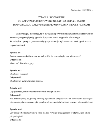 Trębaczów, 11-07-2016 r. PYTANIA I ODPOWIEDZI DO ZAPYTANIA OFERTOWEGO NR 8/2016 Z DNIA 24. 06. 2016 DOTYCZĄCEGO ZAKUPU SYSTEMU ODPYLANIA WRAZ Z FILTRAMI Zamawiający informuje,że w związku z powyższym zapytaniem ofertowym do zamawiającego wpłynęły pytania dotyczące treści zapytania ofertowego. W związku z powyższym zamawiający przekazuje wykonawcom treść pytań wraz z odpowiedziami. Pytanie nr 1: System czyszczenia filtra- czy ma to być filtr do pracy ciągłej czy wibracyjny? Odpowiedź: Ma to być filtr wibracyjny. Pytanie nr 2: Obrabiany materiał? Odpowiedź: Obrabianym materiałem jest drewno. Pytanie nr 3: Czy posiadają Państwo szkic ustawienia maszyn i filtra? Odpowiedź: Nie. Informujemy, że główny rurociąg będzie miał długość ok 85 m. Podłączone zostaną do niego następujące maszyny:piła panelowa-2 szt, okleiniarka-3 szt, centrum wiertarskie-3 szt Pytanie nr 4: Czy transport pneumatyczny z filtra ma być również uwzględniony w ofercie, jeśli tak na jaką odległość Odpowiedź: Nie, zostanie przerobiony i podłączony do istniejącego. Pytanie nr 5: Czy dopuszcza się wykonanie centrali z wkładami patronowymi? Odpowiedź: Nie dopuszcza się.