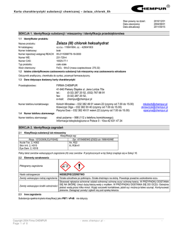 Karta chara kte rys tyki substan cj i chem i cznej – żelaza_chl orek _6h Stan prawny na dzień: Data utworzenia: Data aktualizacji: 2010/12/01 2004/08/01 2011/09/15 SEKCJA 1. Identyfikacja substancji / mieszaniny i identyfikacja przedsiębiorstwa 1.1 Identyfikator produktu Nazwa produktu: Żelaza (III) chlorek heksahydrat Nr katalogowy: cz.d.a.- 119041804, cz. - 429041803 Numer indeksowy: brak Numer rejestracji wstępnej REACH: 05-2115399778-18-0000 Numer WE: 231-729-4 Numer CAS: 10025-77-1 Typ produktu: ciało stałe Wzór chemiczny: FeCl3 · 6H2O (masa cząsteczkowa: 270,32) 1.2 Istotne zidentyfikowane zastosowania substancji lub mieszaniny oraz zastosowania odradzane Odczynnik analityczny, chemikalia do syntez, przemysł farmaceutyczny. 1.3 Dane dotyczące dostawcy karty charakterystyki Przedsiębiorstwo: FIRMA CHEMPUR 41-940 Piekary Śląskie ul. Jana Lortza 70a tel.: (0-32) 287 20 52, (032) 767 88 91 fax: (0-32) 287 20 52, e-mail: [email protected] Numer telefonu kontaktowego: Koloch Mirosław – 032 382 49 01 wewn.22 (czynny od 7.00 do 15.00) Krawczyk Olga – 032 382 00 40 (czynny od 7.00 do 15.00) Pacyna Ewa – 032 382 49 01 wewn.22 (czynny od 7.00 do 15.00) 1.4 Numer telefonu alarmowego Numer telefonu alarmowego: [email protected] [email protected] [email protected] straż pożarna – 998 (112 z telefonu komórkowego); Informacja toksykologiczna w Polsce 0 - 10xx-42 631 47 24 SEKCJA 2. Identyfikacja zagrożeń 2.1 Klasyfikacja substancji lub mieszaniny Klasyfikacja wg: Rozp. 1272/2008 [CLP/GHS] Dyr. 67/548/EWG [DSD] lub 1999/45/WE Acute Tox. 2, H302 Xn, R22 Skin Irrit. 2, H315 Xi, R38-41 Eye Dam. 2, H318 Pełny tekst zwrotów wskazujących zagrożenie (H) oraz zwrotów R przytoczonych w tej Sekcji znajduje się w Sekcji 16. 2.2 Elementy oznakowania Piktogramy zagrożenia Hasło ostrzegawcze NIEBEZPIECZEŃSTWO Zwroty wskazujące rodzaj zagrożenia Działa szkodliwie po połknięciu. Działa drażniąco na skórę. Powoduje poważne uszkodzenie oczu. Stosować rękawice ochronne/ odzież ochronną/ ochronę oczu/ ochronę twarzy. W PRZYPADKU DOSTANIA SIĘ NA SKÓRĘ: Umyć dużą ilością wody z mydłem. W PRZYPADKU DOSTANIA SIĘ DO OCZU: Ostrożnie Zwroty wskazujące środki ostrożności płukać wodą przez kilka minut. Wyjąć soczewki kontaktowe, jeżeli są i można je łatwo usunąć. Kontynuować płukanie. Zasięgnąć porady/ zgłosić się pod opiekę lekarza. 2.3 Inne zagrożenia Substancja spełnia kryteria klasyfikacji jako PBT / vPvB: nie dotyczy Copyright 2004 Firma CHEMPUR P age 1 of 8 - www. c hem pu r. pl - - Karta chara kte rys tyki substan cj i chem i cznej – żelaza_chl orek _6h SEKCJA 3. Skład / informacje o składnikach Nazwa produktu / składnika Identyfikatory Zaw. [%] Żelaza chlorek heksahydrat WE: 231-729-4 CAS: 10025-77-1 min. 98 Klasyfikacja wg: 67/548/EWG lub 1999/45/WE 1272/2008 Xn, R22 Acute Tox. 2, H302 Xi, R38-41 Skin Irrit. 2, H315 Eye Dam. 2, H318 Pełny tekst zwrotów wskazujących zagrożenie (H) oraz zwrotów R przytoczonych w tej Sekcji znajduje się w Sekcji 16. SEKCJA 4. Środki pierwszej pomocy 4.1 Opis środków pierwszej pomocy Bezzwłocznie zasięgnąć porady medycznej. Natychmiast płukać oczy z otwartą powieką przez minimum 10 minut pod bieżącą Kontakt z okiem wodą. W Usunąć szkła kontaktowe, jeżeli są i można je łatwo usunąć. Oparzenia chemikaliami powinny być opatrzone przez lekarza. Wyprowadzić poszkodowanego na świeże powietrze, ewentualnie sztuczne oddychanie, ciepło. Zapewnić spokój. W przypadku Przez drogi utrzymujących się dolegliwości skonsultować się z lekarzem. Może być niebezpiecznym dla osoby udzielającej sztucznego oddechowe oddychania metodą usta – usta. W przypadku utraty przytomności należy ułożyć w pozycji bocznej ustalonej i natychmiast wezwać pomoc medyczną. zapewnić otwartą wentylację. Rozluźnić ciasną odzież, na przykład krawat, kołnierz lub pasek. Przemyć usta wodą. Wynieść narażoną osobę na świeże powietrze. Zapewnić osobie spokój i ciepło. Jeżeli materiał został połknięty a narażona osoba jest przytomna, należy podać do wypicia małą ilość wody. Przerwać jeżeli narażona osoba ma mdłości, ponieważ wymioty mogą być niebezpieczne. Nie wywoływać wymiotów, jeśli nie jest to zalecane przez personel Przez przewód medyczny. W przypadku wystąpienia wymiotów, głowa powinna być utrzymywana nisko, tak aby wymiociny nie dostały się do pokarmowy płuc. Zasięgnąć porady medycznej. Nigdy nie podaw3ać niczego osobie nieprzytomnej. W przypadku utraty przytomności, należy ułożyć poszkodowanego w pozycji bocznej ustalonej i natychmiast wezwać pomoc lekarską. Rozluźnić ciasną odzież, na przykład krawat, kołnierz lub pasek. Kontakt ze Spłukać skażoną skórę dużą ilością wody. Zdjąć skażoną odzież i buty. Należy kontynuować płukanie przez co najmniej 10 minut. skórą Zasięgnąć porady medycznej. Ochrona osób Nie należy podejmować żadnych działań, które stwarzałyby ryzyko dla kogokolwiek chyba, że jest się odpowiednio udzielających przeszkolonym. Jeżeli podejrzewa się, że opary są wciąż obecne ratownik powinien założyć właściwą maskę lub oddechowy pierwszej aparat izolacyjny. Może być niebezpiecznym dla osoby udzielającej sztucznego oddychania metodą usta – usta. Należy dokładnie pomocy zmyć zanieczyszczone ubranie wodą przed jego zdjęciem lub założyć rękawice. 4.2 Najważniejsze ostre i opóźnione objawy oraz skutki narażenia Narażenie: Ostre działanie na zdrowie: Kontakt z okiem Powoduje poważne uszkodzenie oczu. Może wydzielać gazy, opary, które mogą być Przez drogi oddechowe mocno drażniące dla układu oddechowego. Działa szkodliwie po połknięciu. Może powodować Przez przewód pokarmowy oparzenia ust, gardła lub żołądka. Kontakt ze skórą Działa drażniąco na skórę. Nadmierna ekspozycja powoduje: Ból, łzawienie, zaczerwieni