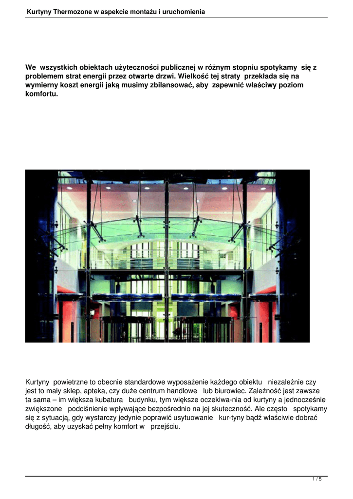 Kurtyny Thermozone w aspekcie montażu i uruchomienia We wszystkich obiektach użyteczności publicznej w różnym stopniu spotykamy się z problemem strat energii przez otwarte drzwi. Wielkość tej straty przekłada się na wymierny koszt energii jaką musimy zbilansować, aby zapewnić właściwy poziom komfortu. Kurtyny powietrzne to obecnie standardowe wyposażenie każdego obiektu niezależnie czy jest to mały sklep, apteka, czy duże centrum handlowe lub biurowiec. Zależność jest zawsze ta sama – im większa kubatura budynku, tym większe oczekiwa-nia od kurtyny a jednocześnie zwiększone podciśnienie wpływające bezpośrednio na jej skuteczność. Ale często spotykamy się z sytuacją, gdy wystarczy jedynie poprawić usytuowanie kur-tyny bądź właściwie dobrać długość, aby uzyskać pełny komfort w przejściu. 1/5 Kurtyny Thermozone w aspekcie montażu i uruchomienia Właściwy montaż przy drzwiach Mówimy o sytuacji, gdy długość kurtyny jest zbyt krótka w stosunku do szerokości światła otworu lub gdy zasięg kur-tyny nie odpowiada jego wysokości. W pierwszym przypadku sprawa jest prosta – kurtyna musi być co najmniej tak długa jak szerokość światła otworu. Celowo podkreślamy to stwierdze-nie, gdyż często zdarza się że kurtyna jest krótsza – wtedy jej skuteczność spada o ponad 50%. Jest to jeden z najważniej-szych kryteriów doboru – w materiałach technicznych FRICO – podawany zawsze jako jedna z najważniejszych danych. Druga kwestia to wysokość montażu – dostosowana do określonego zasięgu kurtyny. Te dwa elementy najczęściej decydują w dużym stopniu o skuteczności urządzeń i zapewnieniu właściwego komfortu. Dodatkowym czynnikiem wspomagającym dzia-łanie kurtyny jest odpowiednio skonfi gurowana automatyka oraz rodzaj drzwi np. obrotowe – skutecznie ograniczające efekt podciśnienia. Dobrą ilustracją tego problemu są zdjęcia z kamery termowizyjnej pokazujące dwie sytuacje – kurtyny właściwie dobranej oraz przewymiarowanej, a także ze zbyt krótkim strumieniem powietrza (rys. 1, 2). W każdym z tych przypadków istotnym elementem jest geometria przepływu powietrza i kształt strugi. Chodzi o to by geometria przepływu została utrzymana na całej długości strumienia powietrza. Na rysunku 2 pokazano właściwy rozkład strumienia powietrza, a tym samym dzięki technologii Thermozone® zapewniono optymalny komfort w wejściu. Rys. 1-2. Dzięki zachowaniu odpowiedniego kształtu strugi, technologia Thermozone zapewnia skuteczną barierę powietrzną 2/5 Kurtyny Thermozone w aspekcie montażu i uruchomienia Rys. 3-5. Różne wersje montażu i wykończenia – cel jest zawsze ten sam – zapewnienie komfortu w przejściu Technologia Thermozone® to efekt ponad 30 letniej pracy inżynierów FRICO nad zapewnieniem optymalnej wydajności i skuteczności kurtyn powietrznych. Projektowanie kurtyn FRICO jest zoptymalizowane przez trzy elementy: geometrię przepływu powietrza, wydajność oraz poziomu hałasu. Stanowi to najlepszy punkt wyjścia dla przyszłego użytkownika do dobrania właściwego urządzenia. Dodatkowo w celu poprawienia skuteczności urządzeń, większość kurtyn FRICO wyposażona jest w regulowaną kratkę wylotową. Pozwala ona na ukierunkowanie powietrza z kurtyny pod maksymalnym kątem 15°. Tak samo istotnym elementem zapewniającym skuteczność kurtyny jest zachowanie optymalnej prędkości powietrza na poszczególnych odległościach od wylotu. Każda kurtyna FRICO posiada odrębną charakterystykę prędkości powietrza i jest ona zamieszczona w danych technicznych. Przyjmuje się, że minimalna prędkość przy podłodze zapewniająca komfort to ok. 3 m/s. Alternatywą dla montażu nad drzwiami jest montaż w układzie pionowym. Przy zachowaniu zasad opisanych powyżej zapewnia on maksymalny komfort dla przechodzących osób, utrzymując jednocześnie stałą prędkość powietrza na całej wysokości wejścia. Jeśli konstrukcja budynku na to pozwala doskonałą alternatywą dla tradycyjnego montażu jest umieszczenie kurtyny w stropie podwieszanym. Na przykładzie kurtyny FRICO AR 200 widać jak ukrycie kurtyny w stropie podwieszanym poprawia samą estetykę wejścia i dobrze komponuje widoczne elementy kurtyny z samym sufitem. Kurtyny elektryczne i wodne – podłączenie, prawidłowa praca (…) 3/5 Kurtyny Thermozone w aspekcie montażu i uruchomienia Najważniejsze wskazówki do doboru kurtyny to: - dobranie właściwego zasięgu do wysokości montażu, - pokrycie długością kurtyny całej szerokości światła otworu, - uwzględnienie czynników pogarszających wydajności: naporu wiatru, podciśnienia, uwzględnienie częstotliwości ruchu przez wejście, - montaż pionowy tam, gdzie jest to możliwe i dostosowanie długości kurtyny do wysokości światła otworu. Ponadto należy pamiętać, że zrównoważony bilans wentylacyjny budynku to podstawa efektywnego działania kurtyn powietrznych. Sterowanie – źródło oszczędności(…) Kurtyna – wszystko jedno jaka?(…) Zalecenia serwisowe Kurtyny powietrzne są urządzeniami stosunkowo prostymi konstrukcyjnie w porównaniu do innych jednostek wentylacyjnych czy też klimatyzacyjnych. Wymagają jednak stałej obsługi serwisowej. Chodzi tu zwłaszcza o przegląd i czyszczenie filtrów w kurtynach z wymiennikiem 4/5 Kurtyny Thermozone w aspekcie montażu i uruchomienia wodnym oraz sprawdzanie drożności kratek zasysających powietrze w samej kurtynie. Nie wymaga to specjalnych zabiegów, wystarczy wyczyścić odkurzaczem kratę wlotową powietrza. W przypadku kurtyn pracujących w systemie ciągłym, zabieg ten powinien być przeprowadzany co najmniej dwa razy do roku, w środowiskach o większym zanieczyszczeniu częściej. Często zdarza się, że dostęp powietrza do kurtyny jest utrudniony – zwykle poprzez zabudowę kratki zasysającej powietrze. W dokumentacji kurtyn Thermozone® zawsze znajdują się mini