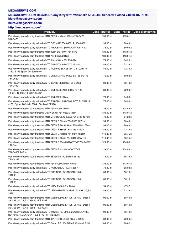 MEGASERWIS.COM MEGASERWIS.COM Dekrets Brudny Krzysztof Wislanska 56 43-430 Skoczow Poland +48 33 482 79 93 [email protected] [email protected] http://megaserwis.com/ Produkty Pas klinowy napędu noży traktorka MTD DECK N 40cali 102cm 754-0470, 954-0470 Cena (brutto) Cena (netto) Cena promocyjna 139,00 zł 113,01 zł Pas klinowy napędu jazdy traktorka MTD 5/8" x 69" 754-04001A, 954-04001 99,00 zł 80,49 zł Pas klinowy napędu jazdy traktorka MTD / BOLENS / SIMPLICITY 5/8" x 42" 75,00 zł 60,98 zł Pas klinowy napędu noży traktorka MTD 92cm 5/8'' x 97'' 754-0479 139,00 zł 113,01 zł Pas klinowy napędu noży traktorka MTD 754-04075 241cm 139,00 zł 113,01 zł Pas klinowy napędu jazdy traktorka MTD 89cm 5/8" x 35" 754-0241 79,00 zł 64,23 zł Pas klinowy napędu jazdy traktorka MTD 754-0370, 954-0370 121cm 89,00 zł 72,36 zł Pas klinowy napędu jazdy traktorka MTD Gudbrod SLX 96 | MTD B10, B115, J130, B155 Spider 76, Spider 91 89,00 zł 72,36 zł Pas klinowy napędu jazdy traktorka MTD JE125 JN150 JN200 SG155 SG175 754-0629 75,00 zł 60,98 zł Pas klinowy napędu jazdy traktorka MTD SE135 SE150 SE155 SE160 754-0499 99,00 zł 80,49 zł Pas klinowy napędu jazdy traktorka MTD 754-0444 E130, E165, RH180, 13-904, 13-906, 13-920 127,5cm 89,00 zł 72,36 zł Pas klinowy napędu jazdy traktorka MTD 754-0626 172cm 79,00 zł 64,23 zł Pas klinowy napędu jazdy traktorka MTD 754-0281, 954-0281, MTD B10/ B115/ J130, Spider 76/91 do 2004r, Gudbrod SLX96 75,00 zł 60,98 zł Pas klinowy napędu noży traktorka MTD 754-04069 267cm 129,00 zł 104,88 zł Pas klinowy napędu noży traktorka DECK 36cali 754-0632 241cm 139,00 zł 113,01 zł Pas klinowy napędu noży traktorka MTD MTD DECK C 30cali 754-0445 127cm 79,00 zł 64,23 zł Pas klinowy napędu noży traktorka MTD DECK D 32cale 754-0363 167cm 99,00 zł 80,49 zł Pas klinowy napędu noży traktorka MTD DECK E 36cali 91cm 754-0364 173cm 99,00 zł 80,49 zł Pas klinowy napędu noży traktorka MTD DECK F 38cali 754-0329 175cm 89,00 zł 72,36 zł Pas klinowy napędu noży traktorka MTD DECK G 42cale 754-0371 188cm 119,00 zł 96,75 zł Pas klinowy napędu noży traktorka MTD DECK N 40cali 754-0443 stary typ 119,00 zł 96,75 zł Pas klinowy napędu noży traktorka MTD DECK F 38cali NOWY TYP 754-04062 197,5cm 129,00 zł 104,88 zł Pas klinowy napędu noży traktorka MTD DECK G 42cale NOWY TYP 754-04060 246cm 129,00 zł 104,88 zł Pas klinowy napędu noży traktorka MTD SE135 SE150 SE155 SE160 754-04175 119,00 zł 96,75 zł Pas klinowy napędu noży traktorka MTD 754-04069 267cm Kevlar 139,00 zł 113,01 zł Pas klinowy napędu jazdy traktorka MTD / GUDBROD (12,7 x 2667) 79,99 zł 65,03 zł Pas klinowy napędu jazdy traktorka MTD / SPIDER / GUDBROD (15,8 x 1346,2) 69,00 zł 56,10 zł Pas klinowy napędu jazdy traktorka MTD / SPIDER / GUDBROD (15,8 x 1122,7) 69,00 zł 56,10 zł Pas klinowy napędu jazdy traktorka MTD / BOLENS (9,5 x 990,6) 59,00 zł 47,97 zł Pas klinowy napędu jazdy traktorka MTD JE130/RH125/Spider92/SLX92 (15,8 x 2470) 89,00 zł 72,36 zł Pas klinowy napędu noży traktorka MTD Mastercut 96, LF 125, LF 150 - Deck F 36" / 96 cm (12,7 x 1968,5) - KEVLAR 99,00 zł 80,49 zł Pas klinowy napędu noży traktorka MTD Mastercut 96, LF 125, LF 150 - Deck F 36" / 96 cm (12,7 x 1968,5) - KEVLAR 99,00 zł 80,49 zł Pas klinowy napędu jazdy traktorka MTD modele 760-799 (automatic), LA135, BL175/107T, JLX76RA (15,8 x 1701,8) - KEVLAR 99,00 zł 80,49 zł Pas klinowy napędu nozy traktorka MTD 46", TORO LX460 (12,7 x 2292) 89,00 zł 72,36 zł 109,00 zł 88,62 zł Pas klinowy napędu jazdy traktorka MTD Smart RG125/ RG145, Optima LF130 (17 x 1803) Pas klinowy napędu noży traktorka MTD / SOLO / ALKO / GOLD (12,7 x 2311) 139,00 zł 113,01 zł Pas klinowy napędu noży traktorka MTD (12,7 x 2287) 59,00 zł 47,97 zł Pas klinowy napędu jazdy traktorka MTD Spider76/91/76RD, RH115/76, JA115 (17 x 1320,8) 69,00 zł 56,10 zł Pas klinowy napędu jazdy traktorka MTD Mastercut 76, Mastercut 92, L145, LE130, LE135 (15,8 x 1676,4 La) 79,00 zł 64,23 zł Pas klinowy napędu noży traktorka MTD JN150/JN200 (15,8 x 2672) 79,00 zł 64,23 zł Pas klinowy napędu jazdy traktorka MTD Spider 76/91/76RD, JA115, RH115/76 (15,8 x 1016) 79,00 zł 64,23 zł Pas klinowy napędu jazdy traktorka MTD Spider 76/91/76RD, JA115, RH115/76 (15,8 x 1016) - KEVLAR 90,00 zł 73,17 zł 100,00 zł 81,30 zł Pas klinowy napędu jazdy traktorka MTD T13-102HD, T15-102HD, T17-102HD, T20-1032HDE Pas klinowy MTD-YARDMAN 754-04002 (806mm x 15,8 mm) 70,00 zł 56,91 zł 100,00 zł 81,30 zł 50,00 zł 40,65 zł Pas klinowy MTD-YARDMAN 13AX605G755 (1975 mm x 12,7) 200,00 zł 162,60 zł Pas klinowy MTD-YARDMAN 754-0125 (2654,3 mm x 12,7) 200,00 zł 162,60 zł Pas klinowy MTD-YARDMAN 754-0629 (1342 mm x 115,87) 60,00 zł 48,78 zł 80,00 zł 65,04 zł 190,00 zł 154,47 zł Pas klinowy MTD-YARDMAN 954-0497 (1525,5 mm x 12,7 mm) Pas klinowy MTD-YARDMAN 754-0637 (780 mm x 9,5 mm) Pas klinowy MTD-YARDMAN 754-0630 (2510 mm x 13,5) Pas klinowy MTD-YARDMAN 754-04175 (2335 lw mm x 13)