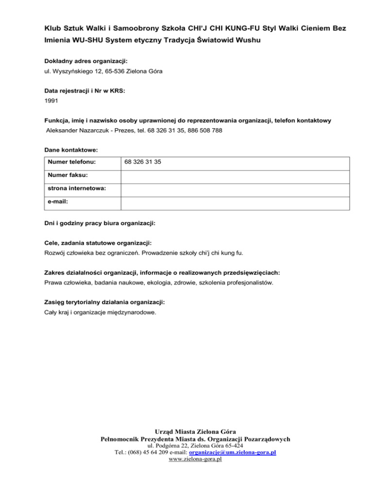 Klub Sztuk Walki i Samoobrony Szkoła CHI’J CHI KUNG-FU Styl Walki Cieniem Bez Imienia WU-SHU System etyczny Tradycja Światowid Wushu Dokładny adres organizacji: ul. Wyszyńskiego 12, 65-536 Zielona Góra Data rejestracji i Nr w KRS: 1991 Funkcja, imię i nazwisko osoby uprawnionej do reprezentowania organizacji, telefon kontaktowy Aleksander Nazarczuk - Prezes, tel. 68 326 31 35, 886 508 788 Dane kontaktowe: Numer telefonu: 68 326 31 35 Numer faksu: strona internetowa: e-mail: Dni i godziny pracy biura organizacji: Cele, zadania statutowe organizacji: Rozwój człowieka bez ograniczeń. Prowadzenie szkoły chi’j chi kung fu. Zakres działalności organizacji, informacje o realizowanych przedsięwzięciach: Prawa człowieka, badania naukowe, ekologia, zdrowie, szkolenia profesjonalistów. Zasięg terytorialny działania organizacji: Cały kraj i organizacje międzynarodowe. Urząd Miasta Zielona Góra Pełnomocnik Prezydenta Miasta ds. Organizacji Pozarządowych ul. Podgórna 22, Zielona Góra 65-424 Tel.: (068) 45 64 209 e-mail: [email protected] www.zielona-gora.pl