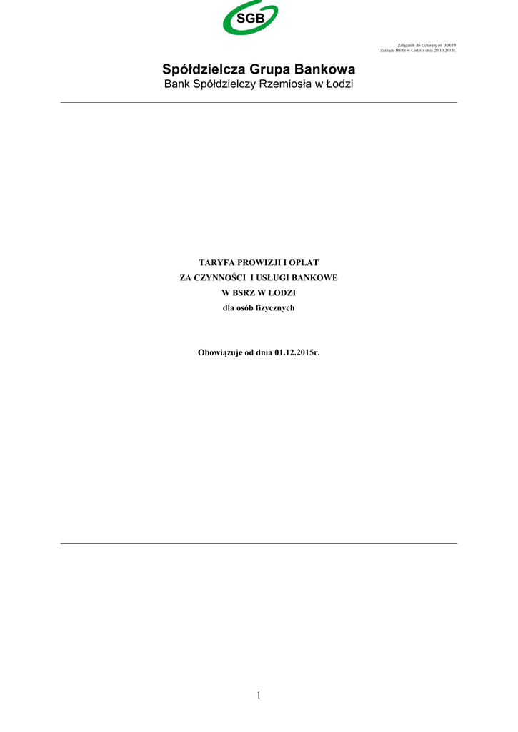 Załącznik do Uchwały nr 303/15 Zarządu BSRz w Łodzi z dnia 20.10.2015r. Spółdzielcza Grupa Bankowa Bank Spółdzielczy Rzemiosła w Łodzi TARYFA PROWIZJI I OPŁAT ZA CZYNNOŚCI I USŁUGI BANKOWE W BSRZ W ŁODZI dla osób fizycznych Obowiązuje od dnia 01.12.2015r. 1 ROZDZIAŁ I ZASADY POBIERANIA PROWIZJI I OPŁAT 1. Zasady ogólne 1) Prowizje od wpłat wnoszonych na rachunki bankowe prowadzone w innych bankach niż BSRz w Łodzi pobiera się od wpłacającego. 2) Prowizje od wpłat wnoszonych na rachunki bankowe prowadzone w BSRz w Łodzi pobiera się od posiadacza rachunku, chyba że zawarta umowa pomiędzy BSRz w Łodzi a posiadaczem tego rachunku nie stanowi inaczej. 3) Za czynności i usługi wykonywane na podstawie umów zawartych z innymi bankami, instytucjami lub przedsiębiorcami, na zlecenie których dokonywane są operacje, BSRz w Łodzi pobiera prowizję lub opłatę w wysokości określonej w tych umowach. 4) Nie pobiera się opłat i prowizji od: a) otwarcia i prowadzenia rachunków: oszczędnościowego a’vista terminowych lokat oszczędnościowych, na których gromadzone są środki na cele charytatywne, środków, które na mocy ustawy powinny być wyodrębnione na oddzielnych kontach bankowych. b) wpłat na pokrycie innych zobowiązań w stosunku do BSRz w Łodzi (np. z tytułu najmu lokalu, dostaw robót i usług) oraz wypłat na rzecz dostawców usług dla BSRz w Łodzi. 5) Nie pobiera się opłat za udzielanie pisemnej informacji o obrotach i stanach rachunków udzielanych na żądanie osób, o których mowa w art. 105 Prawa bankowego i innych przepisach prawa, z wyjątkiem udzielania informacji innym bankom oraz – na zasadzie wzajemności – innym instytucjom upoważnionym do udzielania kredytów (art. 105 ust. 1 pkt 1 i 1a Prawa bankowego). 6) Opłaty pobiera się w odpowiedniej wysokości, gotówką lub bezgotówkowo. 7) Na wniosku umieszcza się adnotację określającą kwotę uiszczonej opłaty, datę wpłaty, numer komputerowy tej wpłaty lub numer rachunku, na który wpłacono opłatę. 8) Kwoty pobieranych prowizji i opłat podlegają zaokrągleniu na zasadach ogólnie obowiązujących - do dwóch miejsc po przecinku. Kwota ta nie może być niższa niż stawka minimalna określona w Taryfie 9) Zarząd BSRz może podjąć decyzję o nie pobieraniu prowizji i opłat lub o pobieraniu prowizji i opłat w wysokościach innych niż określone zostały w niniejszej Taryfie prowizji i opłat za czynności i usługi bankowe w BSRz w Łodzi. 10) Za usługi inne (nietypowe), nie wyszczególnione w niniejszej Taryfie prowizji i opłat za czynności i usługi bankowe w BSRz w Łodzi prowizję lub opłatę ustala Zarząd BSRz 11) BSRz w Łodzi zastrzega sobie prawo dokonania zmiany Taryfy prowizji i opłat za czynności i usługi bankowe w BSRz w Łodzi. Zmiana prowizji i opłat może nastąpić w przypadku wystąpienia jednego z poniższych warunków: a) zmiany cennika usług świadczonych przez Krajową Izbę Rozliczeniową S.A. lub bank zrzeszający o co najmniej 0,1%, b) zmiany cen energii, taryf telekomunikacyjnych oraz opłat stosowanych przez inne instytucje, z usług których korzysta bank przy wykonywaniu danej czynności o co najmniej 0,1%, c) zmiany poziomu inflacji w wysokości podanej przez Główny Urząd Statystyczny o co najmniej 0,1%, d) zmiany przepisów podatkowych lub rachunkowych dotyczących działalności banku i świadczonych przez bank usług, w zakresie wynikającym ze zmiany. 2. Warunki korzystania z pakietu „mKONTO” 1) Osobą uprawnioną do skorzystania z pakietu „mKONTO” jest osoba fizyczna w przedziale wiekowym 18 – 30 lat. 2) W ramach pakietu „mKONTO” Klient podpisuje z Bankiem umowę o prowadzenie rachunków dla osób fizycznych, oraz otrzymuje kartę płatniczą i dostęp do usług bankowości elektronicznej (UBE), 3) Osoba fizyczna może korzystać z pakietu „mKONTO” do końca miesiąca, w którym kończy 30 lat. 4) Po okresie określonym w pkt.3 usługi oferowane przez Bank w ramach pakietu „mKONTO” będą kontynuowane na zasadach ogólnych dla rachunku ROR standardowy lub rachunku ROR nowy – do wyboru Klienta. 2 ROZDZIAŁ II. RACHUNKI OSZCZĘDNOŚCIOWO-ROZLICZENIOWE 1. Taryfa dla ROR standardowy Lp. Wyszczególnienie 1. Za prowadzenie rachunku oszczędnościowo-rozliczeniowego ROR (miesięcznie) 2. 3. 4. 5. Uwaga: w przypadku otwarcia rachunku po 15-tym dniu miesiąca opłata ulega zmniejszeniu o połowę Dostęp do Usług Bankowości Elektronicznej (UBE)* 1) abonament miesięczny za korzystanie z UBE 2) wydanie Tokena 3) wygenerowanie identyfikatora usługi SMS 4) autoryzacja transakcji poprzez Token 5) autoryzacja transakcji poprzez SMS: do 9 transakcji w miesiącu powyżej 9 transakcji w miesiącu – za każdy SMS 6) zastrzeżenie Tokena lub usługi SMS 7) odblokowanie dostępu do UBE *) nie można posiadać jednocześnie kilku różnych dostępów do UBE Wpłaty gotówkowe na rachunek Wypłata gotówkowa: 1. nie wymagająca awizowania 2. wymagająca awizowania a) awizowana i zrealizowana b) awizowana i nie zrealizowana– różnica między kwotą zgłoszoną a nie podlegającą awizowaniu c) nie awizowana i zrealizowana (w miarę posiadanych przez bank środków) – różnica między kwotą zrealizowaną a nie podlegającą awizowaniu Polecenie zapłaty: - realizacja polecenia zapłaty z r-ku dłużnika - zmiana, odwołanie polecenia zapłaty przez dłużnika Stawka 2,00 zł 4,00 zł 100,00zł 20,00 zł bez opłat bez opłat 1,00zł 50,00zł 50,00zł bez opłat bez opłat bez opłat 0,10% 0,20% 1,20 zł 2,00 zł Uwaga: opłatę pobiera się z r-ku dłużnika za każdą operację 6. 1. Przelewy wewnętrzne tj. z rachunku w BSRz na rachunek w BSRz 2. Przelewy, przekazy itp. z rachunku w BSRz na rachunki prowadzone przez inne banki poprzez : 1) złożenie dyspozycji w BSRz: a) przekazania środków za pośrednictwem systemu eliksir, b) przekazania środków za pośrednictwem systemu sorbnet (na zle
