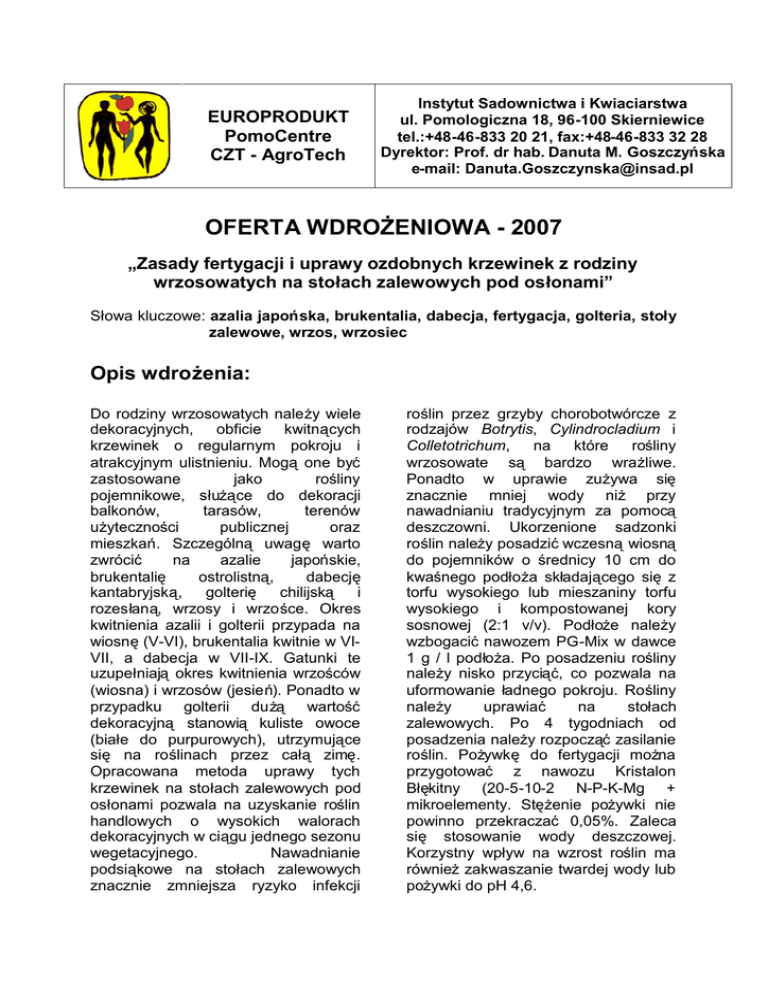 EUROPRODUKT PomoCentre CZT - AgroTech Instytut Sadownictwa i Kwiaciarstwa ul. Pomologiczna 18, 96-100 Skierniewice tel.:+48-46-833 20 21, fax:+48-46-833 32 28 Dyrektor: Prof. dr hab. Danuta M. Goszczyńska e-mail: [email protected] OFERTA WDROŻENIOWA - 2007 „Zasady fertygacji i uprawy ozdobnych krzewinek z rodziny wrzosowatych na stoł ach zalewowych pod osł onami” Sł owa kluczowe: azalia japońska, brukentalia, dabecja, fertygacja, golteria, stoł y zalewowe, wrzos, wrzosiec Opis wdrożenia: Do rodziny wrzosowatych należy wiele dekoracyjnych, obficie kwitnących krzewinek o regularnym pokroju i atrakcyjnym ulistnieniu. Mogąone być zastosowane jako rośliny pojemnikowe, sł użące do dekoracji balkonów, tarasów, terenów użyteczności publicznej oraz mieszkań. Szczególną uwagę warto zwrócić na azalie japońskie, brukentalię ostrolistną, dabecję kantabryjską, golterię chilijską i rozesł aną, wrzosy i wrzośce. Okres kwitnienia azalii i golterii przypada na wiosnę(V-VI), brukentalia kwitnie w VIVII, a dabecja w VII-IX. Gatunki te uzupeł niająokres kwitnienia wrzośców (wiosna) i wrzosów (jesień). Ponadto w przypadku golterii duż ą wartość dekoracyjną stanowią kuliste owoce (biał e do purpurowych), utrzymujące się na roślinach przez cał ą zimę. Opracowana metoda uprawy tych krzewinek na stoł ach zalewowych pod osł onami pozwala na uzyskanie roślin handlowych o wysokich walorach dekoracyjnych w ciągu jednego sezonu wegetacyjnego. Nawadnianie podsiąkowe na stoł ach zalewowych znacznie zmniejsza ryzyko infekcji roślin przez grzyby chorobotwórcze z rodzajów Botrytis, Cylindrocladium i Colletotrichum, na które rośliny wrzosowate są bardzo wrażliwe. Ponadto w uprawie zużywa się znacznie mniej wody niż przy nawadnianiu tradycyjnym za pomocą deszczowni. Ukorzenione sadzonki roślin należy posadzićwczesnąwiosną do pojemników o średnicy 10 cm do kwaśnego podł oża skł adającego sięz torfu wysokiego lub mieszaniny torfu wysokiego i kompostowanej kory sosnowej (2:1 v/v). Podł oże należy wzbogacićnawozem PG-Mix w dawce 1 g / l podł oża. Po posadzeniu rośliny należy nisko przyciąć, co pozwala na uformowanie ł adnego pokroju. Rośliny należy uprawiać na stoł ach zalewowych. Po 4 tygodniach od posadzenia należy rozpocząćzasilanie roślin. Poż ywkę do fertygacji moż na przygotować z nawozu Kristalon Bł ękitny (20-5-10-2 N-P-K-Mg + mikroelementy. Stężenie pożywki nie powinno przekraczać 0,05%. Zaleca się stosowanie wody deszczowej. Korzystny wpł yw na wzrost roślin ma równieżzakwaszanie twardej wody lub pożywki do pH 4,6. Calluna vulgaris Bruckenthalia spiculifolia Daboecia scotiana Gaultheria mucronata Rhododendron Daboecia cantabrica Innowacyjnośćwdrożeniowa – efekty gospodarcze i społ eczne Opracowana technologia uprawy mał o znanych krzewinek z rodziny wrzosowatych pozwoli zwiększyćasortyment roślin pojemnikowych do dekoracji wnętrz, balkonów i tarasów oraz zwiększy podażtych dekoracyjnych krzewinek. Proponowana metoda uprawy na stoł ach zalewowych pozwoli na uzyskanie roślin o wysokich walorach dekoracyjnych oraz ograniczy zużycie wody i nawozów w produkcji. Podmioty, do których skierowana jest oferta wdrożeniowa Szkół ki roślin ozdobnych, Ośrodki Doradztwa Rolniczego Twórcy oferty wdrożeniowej: Pracownia Szkół karstwa Roślin Ozdobnych Zakł ad Planowania Naukowego Autor: Dr Bożena Matysiak tel. (046) 833 20 41 e-mail: [email protected] Współ autorzy: Dr Adam Marosz Mgr Grzegorz Falkowski