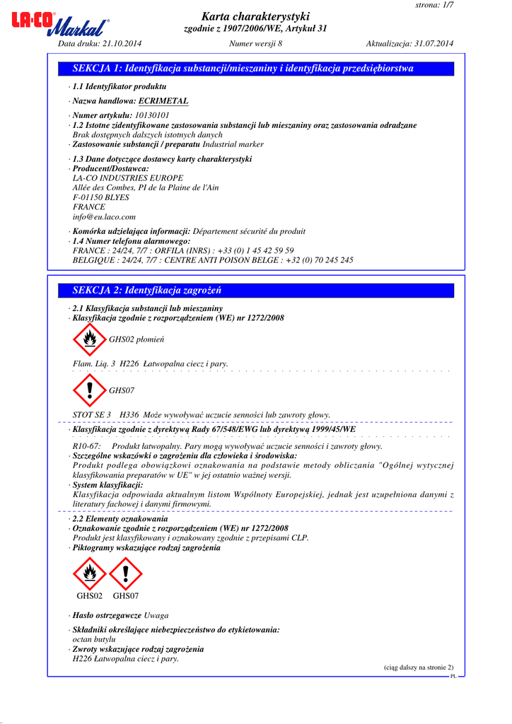 38.0.32 strona: 1/7 Karta charakterystyki zgodnie z 1907/2006/WE, Artykuł 31 Data druku: 21.10.2014 Numer wersji 8 Aktualizacja: 31.07.2014 SEKCJA 1: Identyfikacja substancji/mieszaniny i identyfikacja przedsiębiorstwa · 1.1 Identyfikator produktu · Nazwa handlowa: ECRIMETAL · Numer artykułu: 10130101 · 1.2 Istotne zidentyfikowane zastosowania substancji lub mieszaniny oraz zastosowania odradzane Brak dostępnych dalszych istotnych danych · Zastosowanie substancji / preparatu Industrial marker · 1.3 Dane dotyczące dostawcy karty charakterystyki · Producent/Dostawca: LA-CO INDUSTRIES EUROPE Allée des Combes, PI de la Plaine de l'Ain F-01150 BLYES FRANCE [email protected] · Komórka udzielająca informacji: Département sécurité du produit · 1.4 Numer telefonu alarmowego: FRANCE : 24/24, 7/7 : ORFILA (INRS) : +33 (0) 1 45 42 59 59 BELGIQUE : 24/24, 7/7 : CENTRE ANTI POISON BELGE : +32 (0) 70 245 245 SEKCJA 2: Identyfikacja zagrożeń · 2.1 Klasyfikacja substancji lub mieszaniny · Klasyfikacja zgodnie z rozporządzeniem (WE) nr 1272/2008 ~ GHS02 płomień Flam. Liq. 3 H226 Łatwopalna ciecz i pary. ~ GHS07 STOT SE 3 H336 Może wywoływać uczucie senności lub zawroty głowy. · Klasyfikacja zgodnie z dyrektywą Rady 67/548/EWG lub dyrektywą 1999/45/WE R10-67: Produkt łatwopalny. Pary mogą wywoływać uczucie senności i zawroty głowy. · Szczególne wskazówki o zagrożeniu dla człowieka i środowiska: Produkt podlega obowiązkowi oznakowania na podstawie metody obliczania "Ogólnej wytycznej klasyfikowania preparatów w UE" w jej ostatnio ważnej wersji. · System klasyfikacji: Klasyfikacja odpowiada aktualnym listom Wspólnoty Europejskiej, jednak jest uzupełniona danymi z literatury fachowej i danymi firmowymi. · 2.2 Elementy oznakowania · Oznakowanie zgodnie z rozporządzeniem (WE) nr 1272/2008 Produkt jest klasyfikowany i oznakowany zgodnie z przepisami CLP. · Piktogramy wskazujące rodzaj zagrożenia ~ ~ GHS02 GHS07 · Hasło ostrzegawcze Uwaga · Składniki określające niebezpieczeństwo do etykietowania: octan butylu · Zwroty wskazujące rodzaj zagrożenia H226 Łatwopalna ciecz i pary. (ciąg dalszy na stronie 2) PL 38.0.32 strona: 2/7 Karta charakterystyki zgodnie z 1907/2006/WE, Artykuł 31 Data druku: 21.10.2014 Numer wersji 8 Aktualizacja: 31.07.2014 Nazwa handlowa: ECRIMETAL (ciąg dalszy od strony 1) H336 Może wywoływać uczucie senności lub zawroty głowy. · Zwroty wskazujące środki ostrożności P210 Przechowywać z dala od źródeł ciepła/iskrzenia/otwartego ognia/gorących powierzchni. Palenie wzbronione. P241 Używać elektrycznego/wentylującego/oświetleniowego/przeciwwybuchowego sprzętu. P261 Unikać wdychania pyłu/dymu/gazu/mgły/par/rozpylonej cieczy. P303+P361+P353 W PRZYPADKU KONTATKU ZE SKÓRĄ (lub z włosami): Natychmiast usunąć/zdjąć całą zanieczyszczoną odzież. Spłukać skórę pod strumieniem wody/prysznicem. P405 Przechowywać pod zamknięciem. P501 Zawartość / pojemnik usuwać zgodnie z przepisami miejscowymi / regionalnymi / narodowymi / międzynarodowymi. · Oznakowanie opakowań, których zawartość nie przekracza 125 ml · Piktogramy wskazujące rodzaj zagrożenia ~ ~ GHS02 GHS07 · Hasło ostrzegawcze Uwaga · Składniki określające niebezpieczeństwo do etykietowania: octan butylu · Zwroty wskazujące rodzaj zagrożenia brak · 2.3 Inne zagrożenia · Wyniki oceny właściwości PBT i vPvB · PBT: Nie nadający się do zastosowania. · vPvB: Nie nadający się do zastosowania. SEKCJA 3: Skład/informacja o składnikach · 3.2 Charakterystyka chemiczna: Mieszaniny · Opis: Mieszanka z niżej wymienionych składników z bezpiecznymi domieszkami. · Składniki niebezpieczne: CAS 13463-67-7 just in STYLMARK White, Yellow, Pink, Purple CAS 1333-86-4 just in STYLMARK Black CAS: 123-86-4 octan butylu 25-50% EINECS: 204-658-1 R10-66-67 Flam. Liq. 3, H226; ~ ~ STOT SE 3, H336 CAS: 14808-60-7 Quartz (SiO2) 1-≤ 2,5% EINECS: 238-878-4 substancja z określoną na poziomie Wspólnoty wartością najwyższego dopuszczalnego stężenia w środowisku pracy CAS: 1333-86-4 Carbon black 1-≤ 2,5% EINECS: 215-609-9 ~ Self-heat. 2, H252 CAS: 9004-87-9 Ifralan 0,1-<0,3% G Xn R22; ? @ ? G Xi R41; ? @ D N R51/53 @ Eye Dam. 1, H318; ~ ~ Aquatic Chronic 2, H411; ~ Acute Tox. 4, H302 · Wskazówki dodatkowe: Pełna treść przytoczonych wskazówek dotyczących zagrożeń znajduje się w rozdziale 16. SEKCJA 4: Środki pierwszej pomocy · 4.1 Opis środków pierwszej pomocy · Po wdychaniu: Dostarczyć świeże powietrze, w razie dolegliwości wezwać lekarza. · Po styczności ze skórą: Ogólnie produkt nie działa drażniąco na skórę. (ciąg dalszy na stronie 3) PL 38.0.32 strona: 3/7 Karta charakterystyki zgodnie z 1907/2006/WE, Artykuł 31 Data druku: 21.10.2014 Numer wersji 8 Aktualizacja: 31.07.2014 Nazwa handlowa: ECRIMETAL (ciąg dalszy od strony 2) · Po styczności z okiem: Płukać oczy z otwartą powieką przez kilka minut pod bieżącą wodą. · Po przełknięciu: Przy trwałych dolegliwościach porozumieć się z lekarzem. · 4.2 Najważniejsze ostre i opóźnione objawy oraz skutki narażenia Brak dostępnych dalszych istotnych danych · 4.3 Wskazania dotyczące wszelkiej natychmiastowej pomocy lekarskiej i szczególnego postępowania z poszkodowanym Brak dostępnych dalszych istotnych danych SEKCJA 5: Postępowanie w przypadku pożaru · 5.1 Środki gaśnicze · Przydatne środki gaśnicze: CO2, piasek, proszek gaśniczy. Nie stosować wody. · Środki gaśnicze nieprzydatne ze względów bezpieczeństwa: Woda pełnym strumieniem · 5.2 Szczególne zagrożenia związane z substancją lub mieszaniną Brak dostępnych dalszych istotnych danych · 5.3 Informacje dla straży pożarnej · Specjalne wyposażenie ochronne: Środki specjalne nie są konieczne. SEKCJA 6: Postępowanie w przypadku niezamierzonego uwolnienia do środowiska · 6.1 Indywidualne środki ostrożności, wyposażenie ochronne i proc