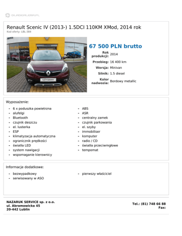 Renault Scenic IV (2013-) 1.5DCI 110KM XMod, 2014 rok Kod oferty: LBL-384 67 500 PLN brutto Rok 2014 produkcji: Przebieg: 16 400 km Wersja: Minivan Silnik: 1.5 diesel Kolor Bordowy metallic nadwozia: Wyposażenie: - 6 x poduszka powietrzna alufelgi Bluetooth czujnik deszczu el. lusterka ESP klimatyzacja automatyczna ogranicznik prędkości światła LED system nawigacji wspomaganie kierownicy - ABS ASR centralny zamek czujnik parkowania el. szyby immobiliser komputer radio / CD światła przeciwmgłowe tempomat Informacje dodatkowe: - bezwypadkowy - serwisowany w ASO NAZARUK SERVICE sp. z o.o. ul. Abramowicka 45 20-442 Lublin - pierwszy właściciel Tel.: (81) 748 66 88 Fax:
