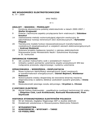 WE WIADOMOŚCI ELEKTROTECHNICZNE R. 77 - 2009 SPIS TREŚCI nr 1 ANALIZY – BADANIA - PRZEGLĄDY 3 Kondycja ekonomiczna polskiej elektrotechniki w latach 2000-2007 / Stefan Krajewski 9 Prawne i techniczne aspekty przyłączania farm wiatrowych / Zdzisław Koszkul 14 Zastosowanie metody wykorzystującej algorytm ewolucyjny do optymalizacji rozwoju terenowych sieci dystrybucyjnych / Sylwester Filipiak 20 Teoretyczne modele funkcji niezawodnościowych transformatorów rozdzielczych eksploatowanych w wiejskich sieciach elektroenergetycznych / Andrzej Stobiecki 23 Wybrane projekty badawcze (granty) z zakresu elektrotechniki finansowane przez Ministerstwo Nauki i Szkolnictwa Wyższego w 35. konkursie INFORMACJE FIRMOWE 8 Jak uzyskać maksymalny zysk z posiadanych maszyn? 12 Unikalny system pomiarów uziemienia słupów przesyłowych WN bez rozłączania przewodu odgromowego i systemu uziemienia OPRACOWANIA – WDROŻENIA - EKSPLOATACJA 25 Nowe kryterium identyfikacji wewnętrznych zwarć zwojowych w transformatorach energetycznych / Daniel Bejmert, Waldemar Rebizant 29 Wykorzystanie wiedzy eksperckiej do tworzenia binarnej macierzy diagnostycznej w zadaniu detekcji uszkodzeń suszarki granulatu / Irena Osiak 35 Nieskuteczność pewnego zwodu aktywnego / Krystian L. Chrzan Z HISTORII ELEKTRYKI 38 Michał Doliwo-Dobrowolski - współtwórca cywilizacji technicznej XX wieku / Zbigniew Ciok, Lech Królikowski, Romuald Nowakowski, Piotr Szymczak HISTORIA STOWARZYSZENIA ELEKTRYKÓW POLSKICH 50 90 lat Oddziału Zagłębia Węglowego SEP w służbie elektryki 56 Działalność szkoleniowa w Stowarzyszeniu Elektryków Polskich 57 58 59 WYDAWNICTWA KONFERENCJE – WYSTAWY – TARGI CO PISZĄ INNI nr 2 ANALIZY – BADANIA - PRZEGLĄDY 3 Ocena innowacyjności polskiej gospodarki na podstawie działalności krajowych jednostek badawczo-rozwojowych / Beata Kużdowicz 7 Technologia PoE jako element bezpiecznego zasilania napięciem stałym wybranych urządzeń w sieciach komputerowych / Paweł Piotrowski 16 Ewolucja reaktorów CANDU w kontekście dyskusji o polskiej energetyce jądrowej / Dariusz Witold Kulczyński 21 Praca elektrycznego układu potrzeb własnych elektrowni w stanach zakłóceniowych / Janusz Buchta, Rafał Szubert OPRACOWANIA – WDROŻENIA - EKSPLOATACJA 26 Wpływ wprowadzenia prac pod napięciem jako standardu pracy brygad remontowych w krajowych spółkach dystrybucyjnych na modele i parametry niezawodnościowe stacji transformatorowo-rozdzielczych / Andrzej Ł Chojnacki 34 Ochrona przed dotykiem pośrednim w sieciach zasilanych z przetwornic statycznych / Lech Lipiński, Mirosław Miszewski, Roman Żarnowski 44 Doświadczenia w stosowaniu czujników antenowych do pomiaru wyładowań niezupełnych silników / Sławomir Szymaniec 48 Czy klimatyzować pomieszczenia baterii telekomunikacyjnych? / Andrzej Binkiewicz KSZTAŁCENIE ELEKTRYKÓW 50 Studencka narada SEP i IEEE w Szczecinie / Ryszard Kacperski HISTORIA STOWARZYSZENIA ELEKTRYKÓW POLSKICH 54 Działalność szkoleniowa Stowarzyszenia Elektryków Polskich w okresie międzywojennym 56 57 60 61 LUDZIE POLSKIEJ ELEKTRYKI KONFERENCJE – WYSTAWY – TARGI WYDAWNICTWA CO PISZĄ INNI nr 3 ANALIZY – BADANIA - PRZEGLĄDY 3 Analiza zjawisk przejściowych w układach generacji rozproszonej / Tomasz Sikorski, Edward Ziaja 7 Model i symulacja pomiaru prądu w napowietrznych liniach elektroenergetycznych do oceny zagrożenia środowiska wywołanego polem elektromagnetycznym / Roman Janiczek, Paweł Ptak, Artur Wojciechowski 11 Pole magnetyczne ekranowanego trójfazowego symetrycznego toru wielkoprądowego / Zygmunt Piątek, Dariusz Kusiak, Tomasz Szczegielniak 14 Układy sterowania węzłem ciepłowniczym z wykorzystaniem metody MFC i przetwornika szybkości oddawania ciepła / Marek Durnaś, Jan Skórski OPRACOWANIA – WDROŻENIA - EKSPLOATACJA 18 Ekologiczne aspekty eksploatacji transformatorów energetycznych / Franciszek Mosiński 22 Wykorzystanie biomasy jako element bezpieczeństwa energetycznego / Joanna Szyszlak-Bargłowicz, Wiesław Piekarski 24 Czy pozyskiwanie energii elektrycznej z gazu wysypiskowego jest opłacalne? / Stanisław Stępniak 30 Wykorzystanie infrastruktury przemysłu cukrowniczego do produkcji nośników energetycznych / Zenon Żukowski NORMY – WYMAGANIA - PRZEPISY 32 Nowe rozwiązania obwodów wtórnych stacji elektroenergetycznej magistrala procesowa / Adam Babś HISTORIA STOWARZYSZENIA ELEKTRYKÓW POLSKICH 37 90 lat Oddziału Łódzkiego Stowarzyszenia Elektryków Polskich 43 Działalność szkoleniowa SEP w czasie wojny 1939-1945 w kraju i za granicą 42 44 48 50 LUDZIE POLSKIEJ ELEKTRYKI KONFERENCJE – WYSTAWY – TARGI WYDAWNICTWA CO PISZĄ INNI nr 4 MATERIAŁY KONFERENCYJNE ELSEP 2009 3 Zakłócenia w sieciach elektroenergetycznych / Maciej Tarasiuk 8 Monitoring jakości energii elektrycznej w punktach węzłowych sieci elektroenergetycznych / Jacek Kiernicki, Grzegorz Bałuka 12 Wpływ zapadów napięcia na parametry jakości energii elektrycznej dostarczanej do odbiorcy w wybranym układzie elektroenergetycznym / Ryszard Skliński 18 Wahania napięcia w urządzeniach elektroenergetycznych / Grzegorz Hołdyński, Zbigniew Skibko 21 Zakłócenia w pracy baterii kondensatorów nn / Wojciech Dzienis 24 Zakłócenia wprowadzane do układów elektroenergetycznych przez odbiorniki nieliniowe / Grzegorz Hołdyński, Zbigniew Skibko 30 Zasady ekranowania i wyrównywania potencjałów w systemach informatycznych / Karol Aniserowicz, Mirosław Zielenkiewicz INFORMACJE FIRMOWE 36 Nowe łączniki napowietrzne średniego napięcia - wdrożenia w sieci SN 39 TO-PASS® - urządzenia do telesterowania 40 Miernik rezystancji uziemień MRU-200 43 WYDAWNICTWA 44 LUDZIE POLSKIEJ ELEKTRYKI Z HISTORII ELEKTRYKI 48 W przededniu 100-lecia Energetyki Białostockiej HISTORIA STOWARZYSZENIA ELEKTRYKÓW POLSKICH 48 90 lat działalności Oddziału Krakowskiego SEP 54 Działalność szkoleniowa SEP w latach 1946-1958 56 50 IMPREZY – S