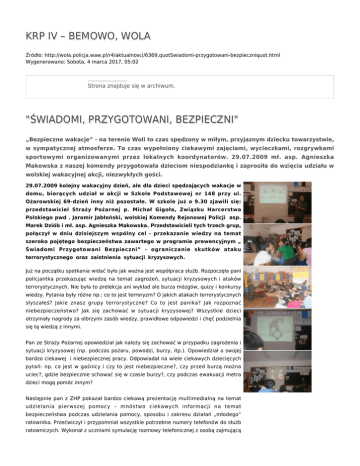KRP IV – BEMOWO, WOLA Źródło: http://wola.policja.waw.pl/r4/aktualnosci/6369,quotSwiadomi-przygotowani-bezpieczniquot.html Wygenerowano: Sobota, 4 marca 2017, 05:02 Strona znajduje się w archiwum. "ŚWIADOMI, PRZYGOTOWANI, BEZPIECZNI" „Bezpieczne wakacje” - na terenie Woli to czas spędzony w miłym, przyjaznym dziecku towarzystwie, w sympatycznej atmosferze. To czas wypełniony ciekawymi zajęciami, wycieczkami, rozgrywkami sportowymi organizowanymi przez lokalnych koordynatorów. 29.07.2009 mł. asp. Agnieszka Makowska z naszej komendy przygotowała dzieciom niespodziankę i zaprosiła do wzięcia udziału w wolskiej wakacyjnej akcji, niezwykłych gości. 29.07.2009 kolejny wakacyjny dzień, ale dla dzieci spędzających wakacje w domu, biorących udział w akcji w Szkole Podstawowej nr 148 przy ul. Ożarowskiej 69-dzień inny niż pozostałe. W szkole już o 9.30 zjawili się: przedstawiciel Straży Pożarnej p. Michał Gigoła, Związku Harcerstwa Polskiego pwd . Jaromir Jabłoński, wolskiej Komendy Rejonowej Policji asp. Marek Dziób i mł. asp. Agnieszka Makowska. Przedstawicieli tych trzech grup, połączył w dniu dzisiejszym wspólny cel - przekazanie wiedzy na temat szeroko pojętego bezpieczeństwa zawartego w programie prewencyjnym „ Świadomi Przygotowani Bezpieczni” - ograniczanie skutków ataku terrorystycznego oraz zaistnienia sytuacji kryzysowych. Już na początku spotkania widać było jak ważna jest współpraca służb. Rozpoczęła pani policjantka przekazując wiedzę na temat zagrożeń, sytuacji kryzysowych i ataków terrorystycznych. Nie była to prelekcja ani wykład ale burza mózgów, quizy i konkursy wiedzy. Pytania były różne np.: co to jest terroryzm? O jakich atakach terrorystycznych słyszałeś? Jakie znasz grupy terrorystyczne? Co to jest panika? Jak rozpoznać niebezpieczeństwo? Jak się zachować w sytuacji kryzysowej? Wszystkie dzieci otrzymały nagrody za olbrzymi zasób wiedzy, prawidłowe odpowiedzi i chęć podzielnia się tą wiedzą z innymi. Pan ze Straży Pożarnej opowiedział jak należy się zachować w przypadku zagrożenia i sytuacji kryzysowej (np. podczas pożaru, powodzi, burzy, itp.). Opowiedział o swojej bardzo ciekawej i niebezpiecznej pracy. Odpowiadał na wiele ciekawych dziecięcych pytań: np. co jest w gaśnicy i czy to jest niebezpieczne?, czy przed burzą można uciec?, gdzie bezpiecznie schować się w czasie burzy?, czy podczas ewakuacji metra dzieci mogą pomóc innym? Następnie pan z ZHP pokazał bardzo ciekawą prezentację multimedialną na temat udzielania pierwszej pomocy – mnóstwo ciekawych informacji na temat bezpieczeństwa podczas udzielania pomocy, sposobu i zakresu działań „młodego” ratownika. Przećwiczył i przypomniał wszystkie potrzebne numery telefonów do służb ratowniczych. Wykonał z uczniami symulację rozmowy telefonicznej z osobą zajmującą się przyjmowaniem zgłoszeń z numeru ratunkowego. Dzieci dowiedział się jakie informacje są najbardziej pomocne. W finale spotkania pani policjantka wręczyła wszystkim nagrody (kamizelki odblaskowe, odblaski, maskotki i kodeksy ruchu drogowego). Na koniec dla osłody dzieci otrzymały torbę cukierków. Zajęcia zakończyły się apelem do dzieci „ Aby telefony alarmowe wykorzystywały tylko do celów ratunkowych. Wśród małych uczestników spotkania była grupa dzieci z Czeczenii. Była też okazja ku temu aby opowiedziały o tragicznych sytuacjach, których były świadkami, uczestnikami lub obserwatorami . Była to również okazja do porozmawiania na temat tolerancji. Dziękujemy Pani Bożenie Wyrzykowskiej z SP 148 za umożliwienie przeprowadzenia zajęć. mł.asp. Agnieszkla Makowska Ocena: 0/5 (0) Tweetnij