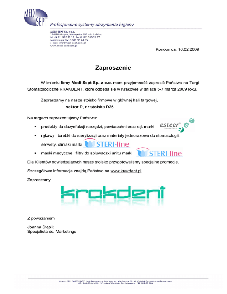 Konopnica, 16.02.2009 Zaproszenie W imieniu firmy Medi-Sept Sp. z o.o. mam przyjemność zaprosić Państwa na Targi Stomatologiczne KRAKDENT, które odbędą się w Krakowie w dniach 5-7 marca 2009 roku. Zapraszamy na nasze stoisko firmowe w głównej hali targowej, sektor D, nr stoiska D25. Na targach zaprezentujemy Państwu: produkty do dezynfekcji narzędzi, powierzchni oraz rąk marki rękawy i torebki do sterylizacji oraz materiały jednorazowe do stomatologii: serwety, śliniaki marki maski medyczne i filtry do spluwaczki unitu marki Dla Klientów odwiedzających nasze stoisko przygotowaliśmy specjalne promocje. Szczegółowe informacje znajdą Państwo na www.krakdent.pl Zapraszamy! Z powaŜaniem Joanna Stąsik Specjalista ds. Marketingu