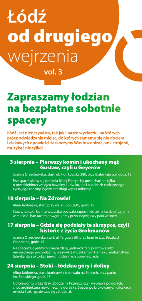Łódź od drugiego wejrzenia vol. 3 Zapraszamy łodzian na bezpłatne sobotnie spacery Łódź jest nieoczywista, tak jak i nasze wycieczki, na których prócz odwiedzania miejsc, do których samemu się nie dociera i ciekawych opowieści zaskoczymy Was inscenizacjami, strojami, muzyką i nie tylko! 3 sierpnia – Pierwszy komin i ukochany mąż Gustaw, czyli u Geyerów Joanna Orzechowska, start: ul. Piotrkowska 280, przy Białej Fabryce, godz. 15 Przespacerujemy się dookoła Białej Fabryki by posłuchać nie tylko o przedsiębiorczym ojcu bawełny Ludwiku, ale i o kulisach codziennego życia jego rodziny. Będzie też długi wątek miłosny! 10 sierpnia – Na Zdrowie! Alina Jabłońska, start: przy wejściu do ZOO, godz. 15 Stawy, rzeczki, las – to wszystko pozwala zapomnieć, że na co dzień żyjemy w mieście. Tym razem powędrujemy przez największy park w Łodzi. 17 sierpnia – Gdzie się podziały te skrzypce, czyli historie z życia Grohmanów Joanna Orzechowska, start: ul. Targowa 65, przy bramie tzw. Beczkach Grohmana, godz. 15 Na spacerze o jednych z najbardziej „polskich” fabrykantów Łodzi niemieckiego pochodzenia, niezwykle muzykalnym Henryku, małżeństwie fabrykanta z aktorką i innych rodzinnych opowieściach. 24 sierpnia – Stoki – łódzkie góry i doliny Alina Jabłońska, start: krańcówka tramwaju na Stokach, przy parku im. Zaruskiego, godz. 15 Od Giewontu przez Rysy, Zbocze na Przełęcz, czyli wyprawa po górach, choć architektura niekoniecznie góralska. Spacer po brukowanych uliczkach osiedla Stoki, gdzie czas się zatrzymał. 31 sierpnia – Czas by posnuć się po Kątach Alina Jabłońska, start: skrzyżowanie Piotrkowska/Czerwona, przy kościele św. Mateusza, godz. 15 Przespacerujemy się z Wólki na Kąty do „starych Francuzów”, czyli dawnej fabryki Allart Rousseau, aż do ewangelickiego cmentarza Wiznera. 7 września – Widzewska Manufaktura – niewiarygodne opowieści WYCIECZKA INSCENIZOWANA! Joanna Orzechowska, Beata Arabska, start: al. Piłsudskiego 135, przy bramie głównej fabryki, godz. 15 Nie tylko Łódź tańczyła, tak jak zagrał fabrykant Oskar Kon – mawiano, że do interesów ma szósty zmysł. Po wojnie za swoje miliony wybudował w Meksyku fantazyjny pałac. Historia fabryki to materiał na sensacyjny film! 14 września – Radiostacja – szlakiem Łodzi międzywojennej Maciej Kronenberg, start: skrzyżowanie Tkacka/Kopcińskiego, godz. 15 Ta część miasta od dawna ma renomę jednego z najlepszych miejsc do mieszkania w Łodzi. Powędrujemy poprzez osiedle, kamienice, nie omijając oczywiście nomen omen rozgłośni radiowej! 21 września – „Zieloną czwórką się dojedzie do zielonego Helenowa” WYCIECZKA INSCENIZOWANA! Joanna Orzechowska, Beata Arabska, start: skrzyżowanie Franciszkańska/ Północna, godz. 15 Jak pilot wpadł do klatki z niedźwiedziem i jak bogaci fabrykanci i ich eleganckie żony z parasolkami, popijając piwo deptali po ścieżkach dekorowanych muszlami. Po prostu urokliwy Helenów! Organizatorem cyklu wycieczek jest stowarzyszenie Centrum Inicjatyw na rzecz Rozwoju „Regio”, wydawca książek „Przewodnik filmowy po Łodzi” oraz „Podwórka Piotrkowskiej. Przewodnik”. Wycieczki odbywają się dzięki wsparciu finansowemu Urzędu Miasta Łodzi. Więcej informacji na stronie: www.regiocentrum.pl